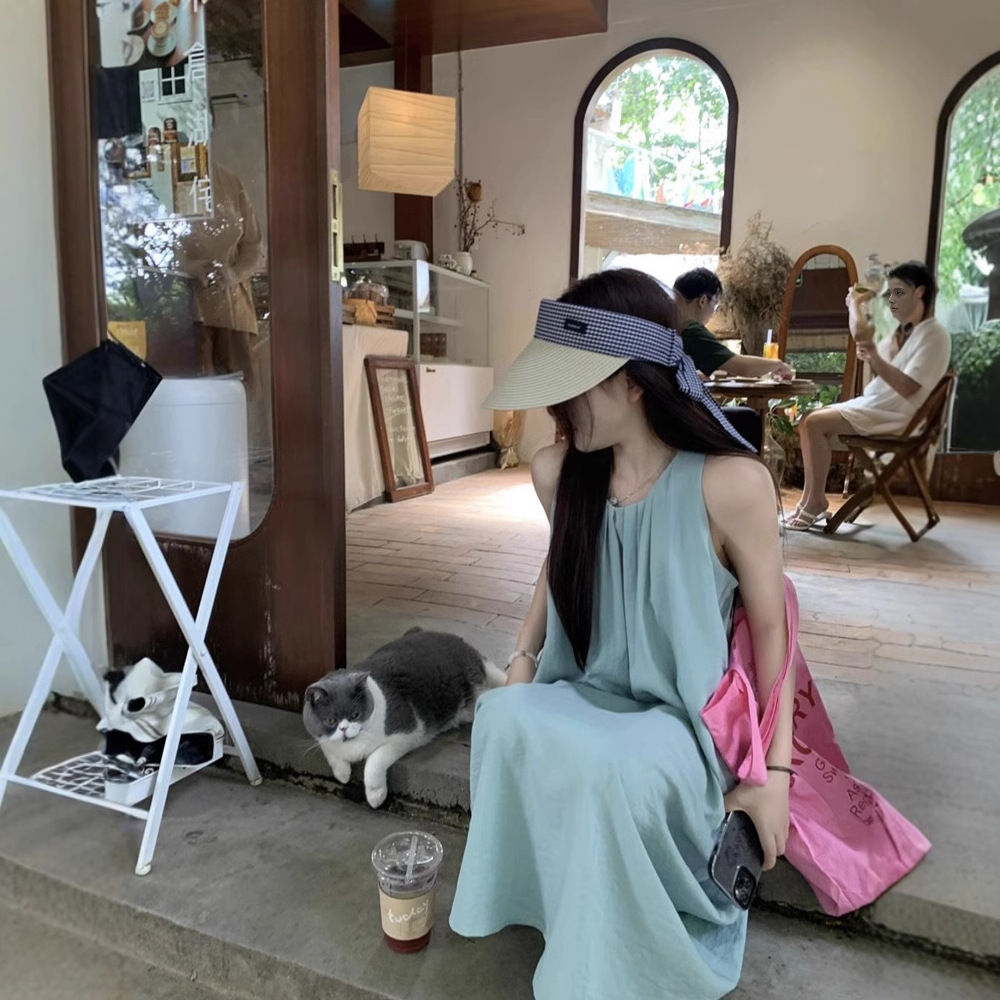 전국 패션 틈새 디자인 백리스 민소매 조끼 원피스 2025 여름 새로운 느슨한 캐주얼 주름 긴 원피스스토어 가기
