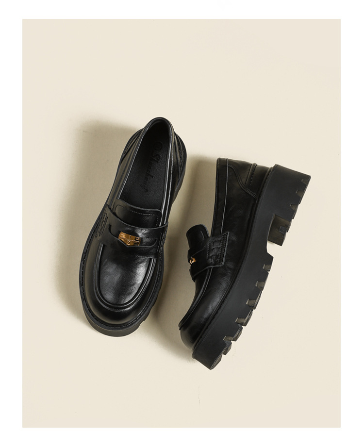 스몰 사이즈 신발 여성용 작은 금화 라운드 발가락 가죽 신발 여성용 두꺼운 밑창 싱글 레이어 신발 슬립 온 블랙 내부 높이 상승 로퍼 여성