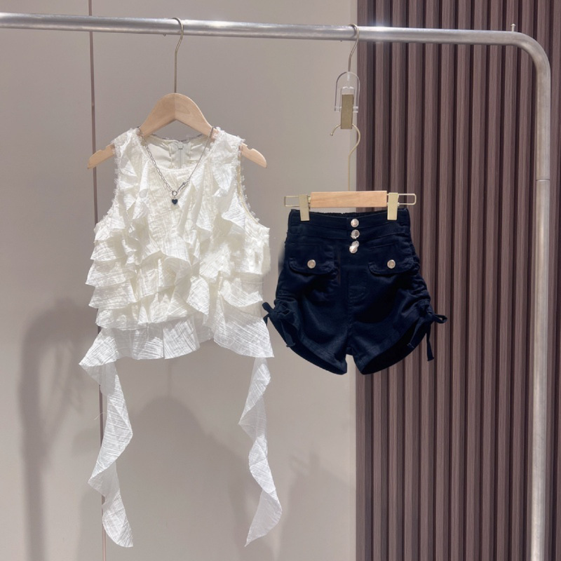 • 흰색 프린지 조끼 + 검정색 단추 반바지