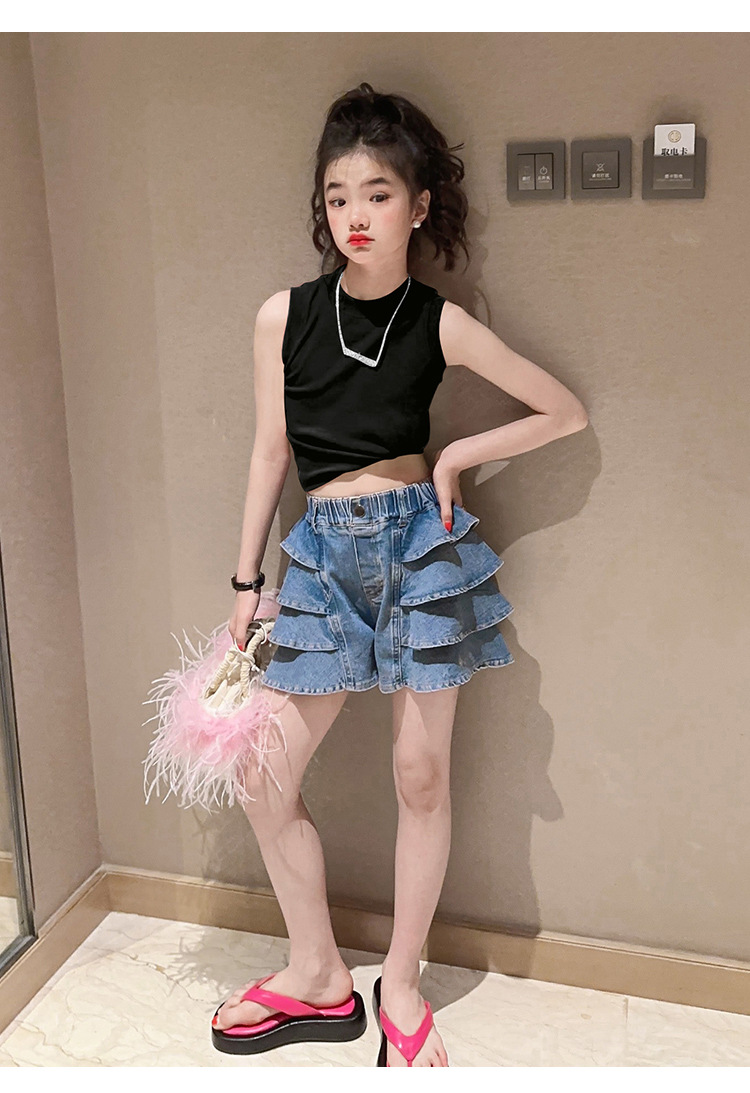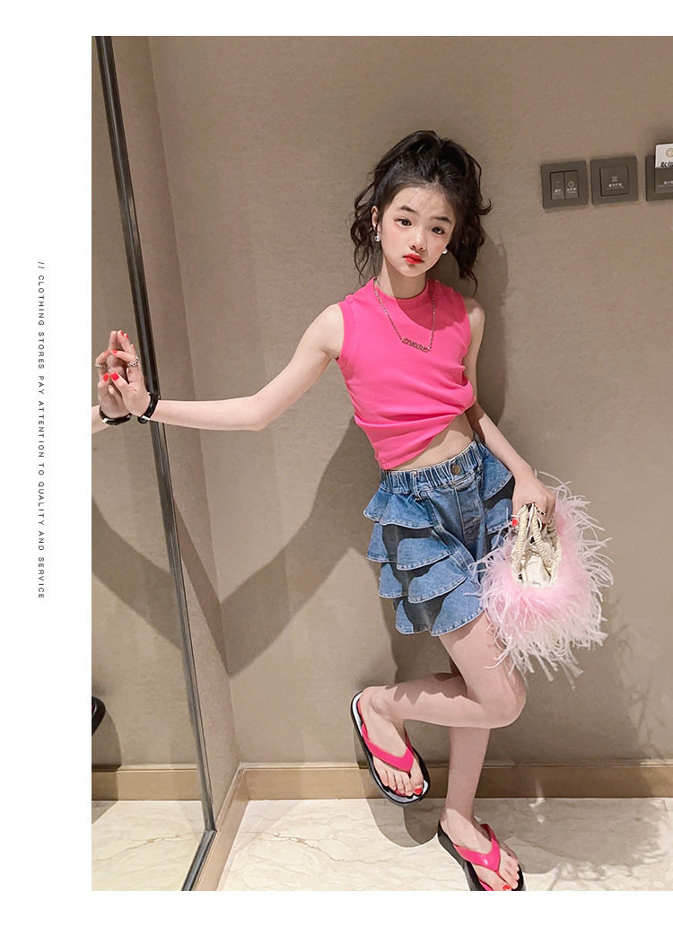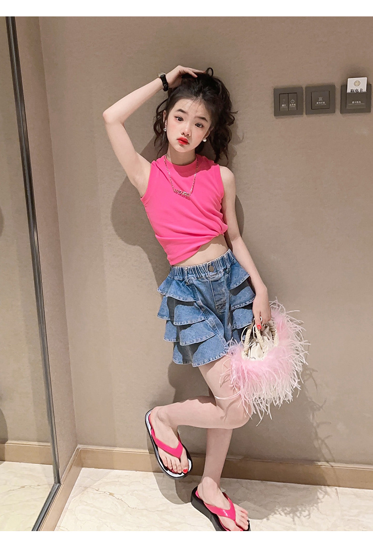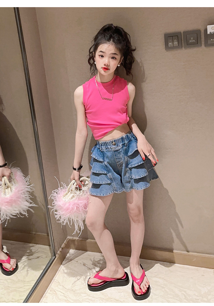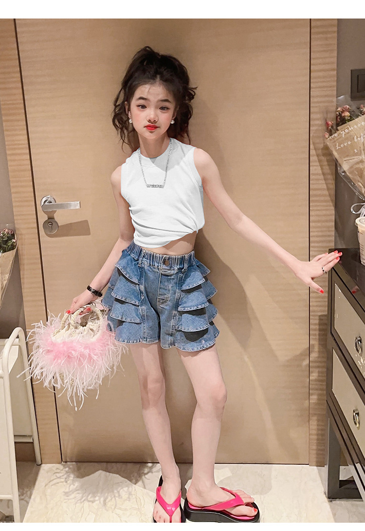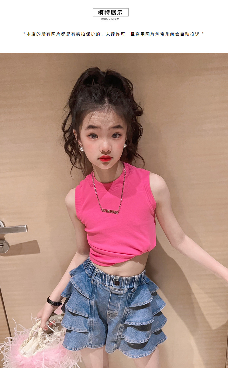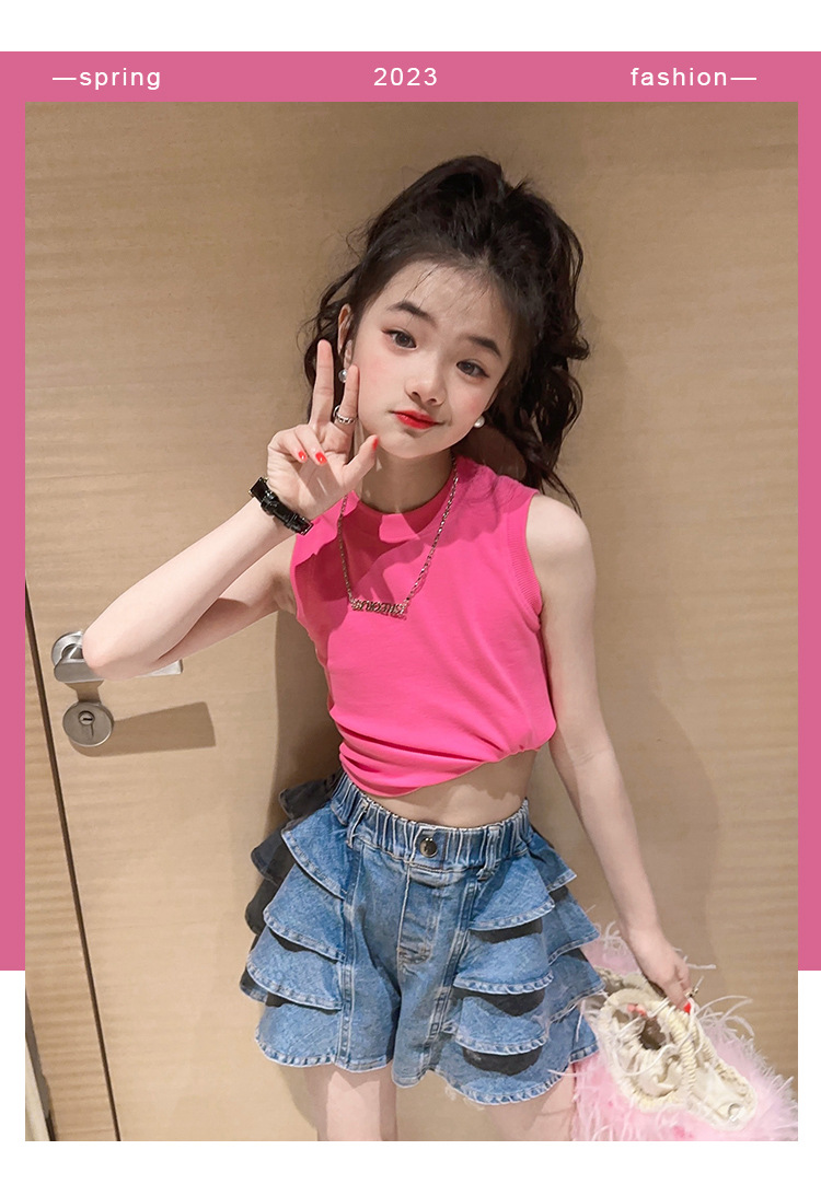 여름을위한 소녀 조끼 2025 새로운 어린이 민소매 티셔츠 짧은 소녀 여름 유행 쿨웨어스토어 가기