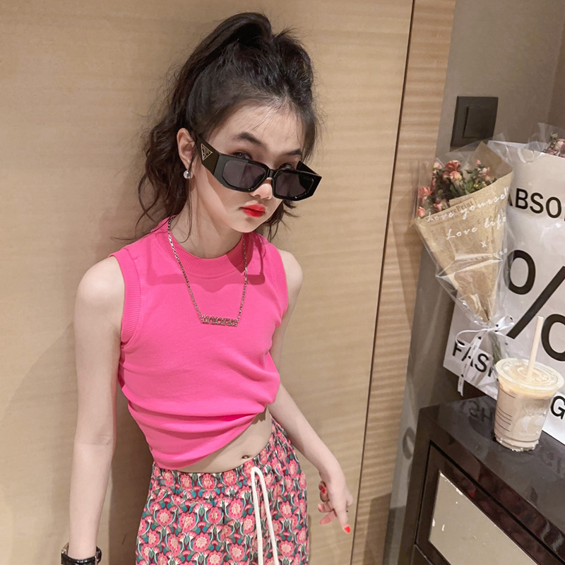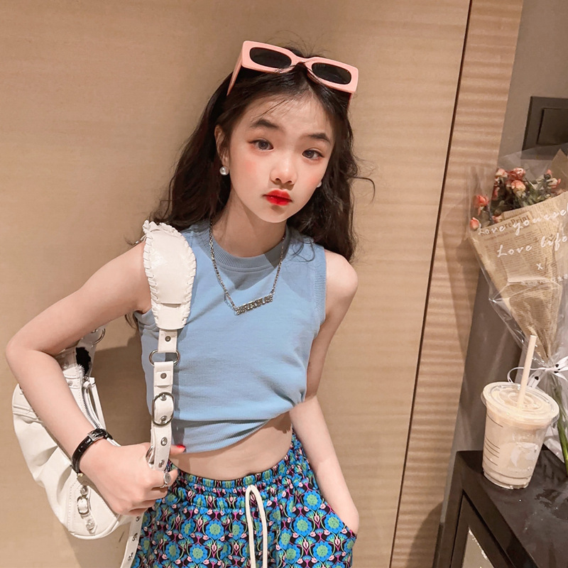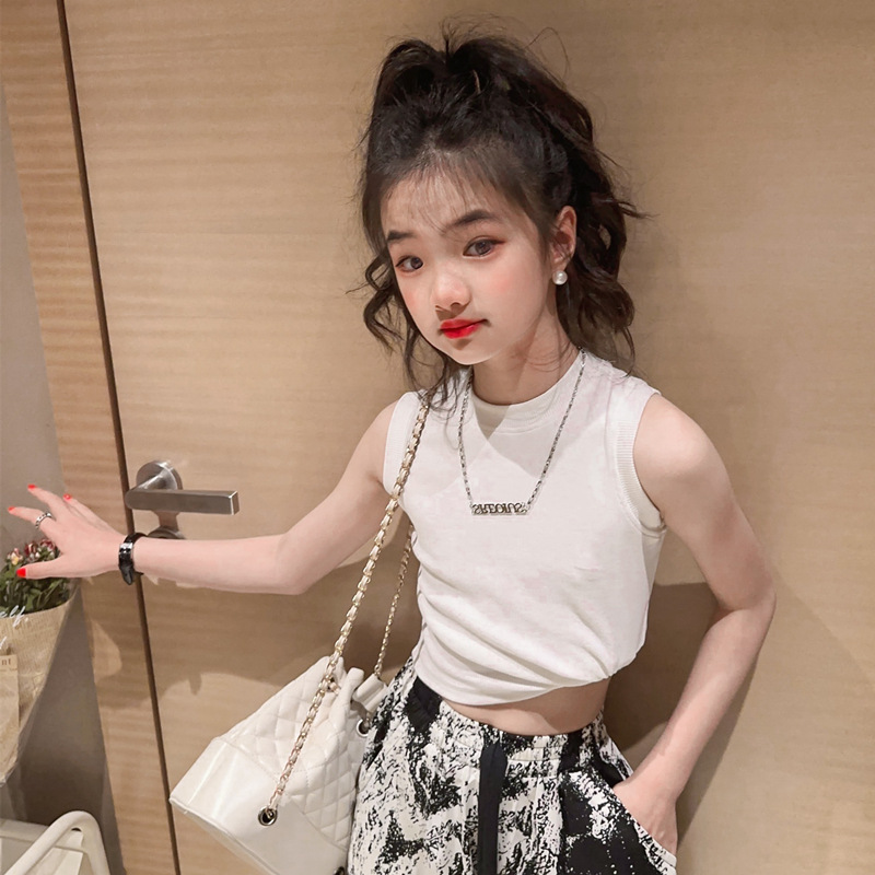 여름을위한 소녀 조끼 2025 새로운 어린이 민소매 티셔츠 짧은 소녀 여름 유행 쿨웨어