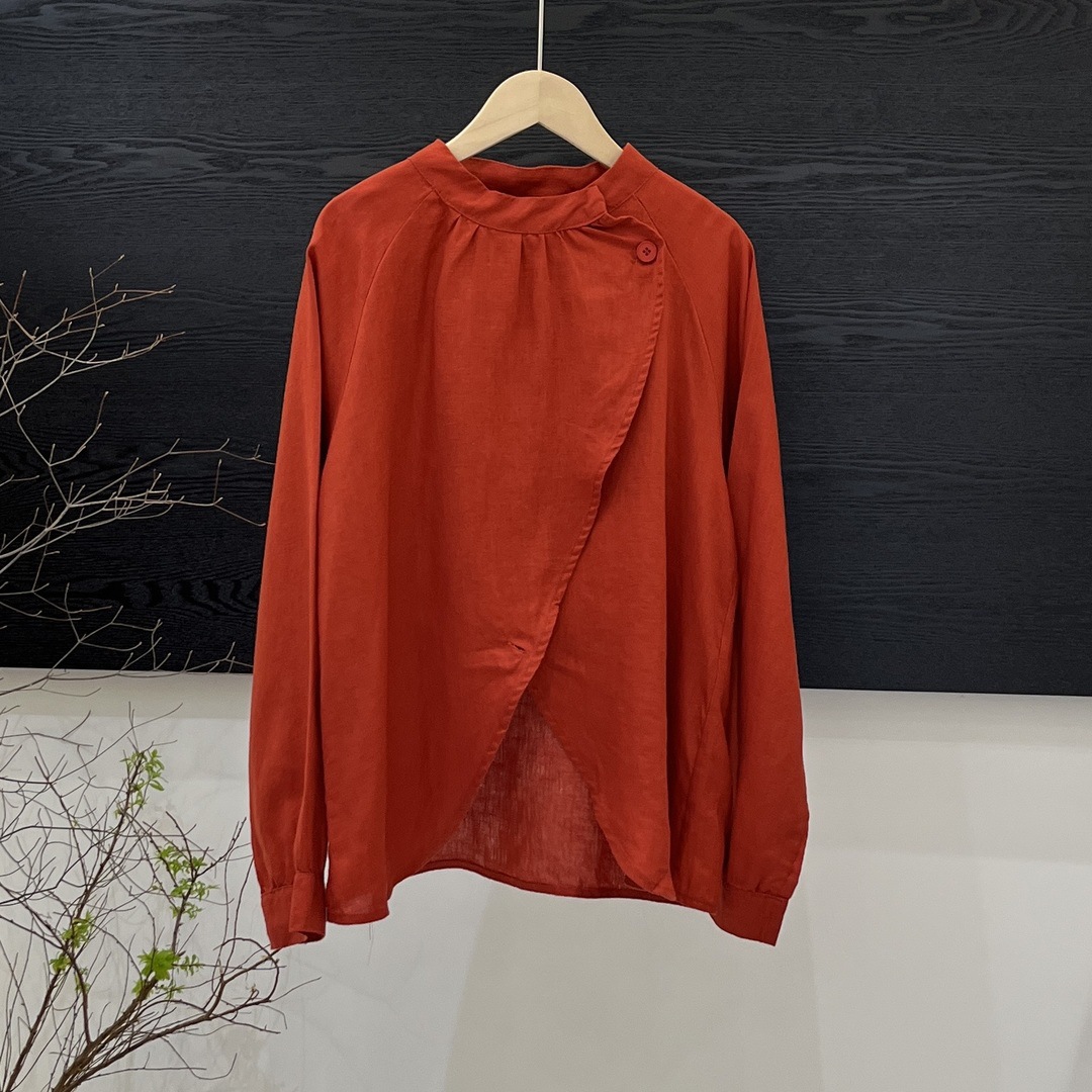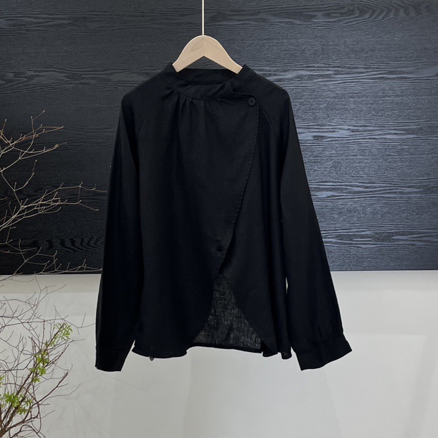 수직 칼라 봄 새로운 문학 스타일 복고풍 스타일 경사 플래켓 버튼 디자인 감각 분할 느슨한 블라우스