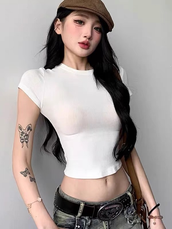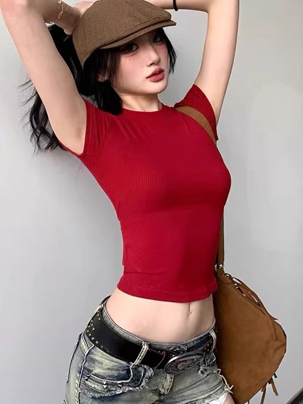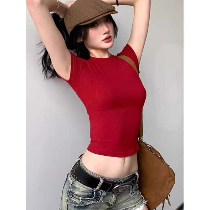 하이 엔드 어깨 버건디 반팔 티셔츠 여성용 여름 꽉 달콤하고 뜨거운 간단한 슬림 핏 짧은 스파이스 소녀 미국식 탑스토어 가기