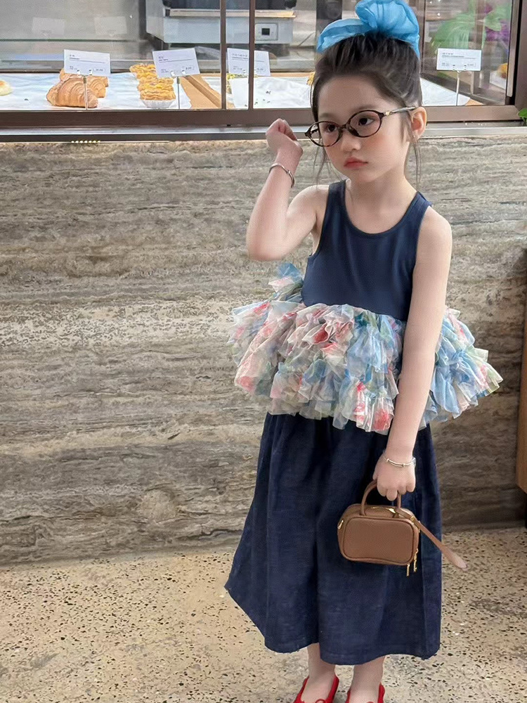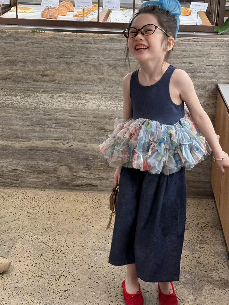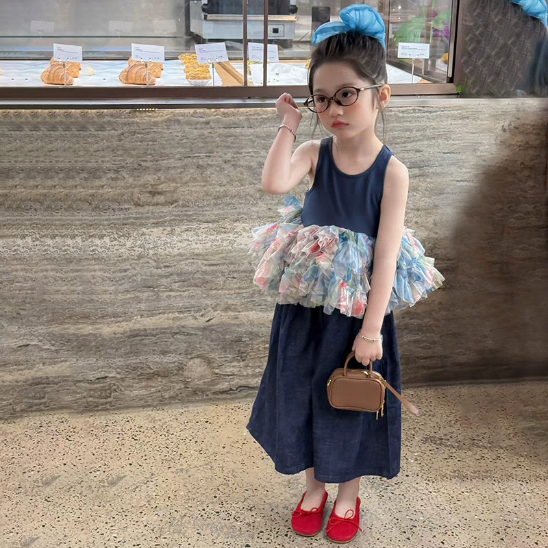 여자 여름 새 도착 2025 민소매 스티칭 레이스 조끼 스커트 탑 한국 스타일 느슨한 데님 넓은 다리 바지