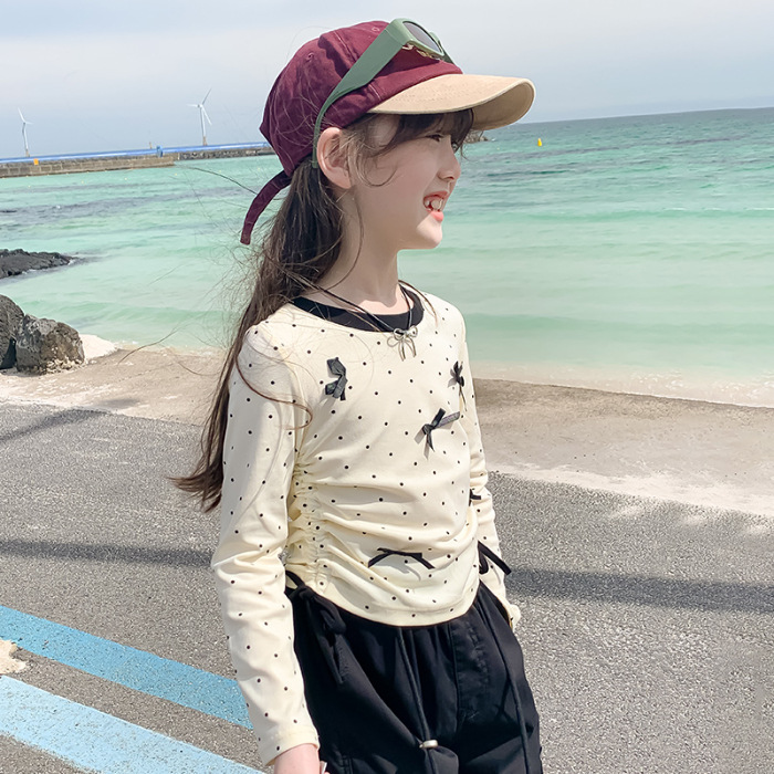 초가을 소녀 티셔츠 새로운 스타일 어린이 봄과 가을 긴 소매 소녀의 가을 웨이브 도트베이스 셔츠 최고 트렌디스토어 가기