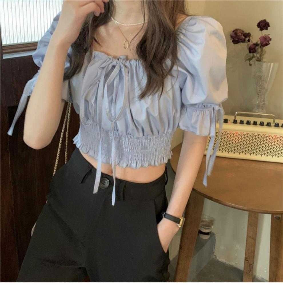 우산 스퀘어 칼라 퍼프 소매 셔츠 쉬폰 짧은 소매 여름 탑 높은 허리 얇은 여성 디자인 감각 틈새 달콤한 짧은 스타일