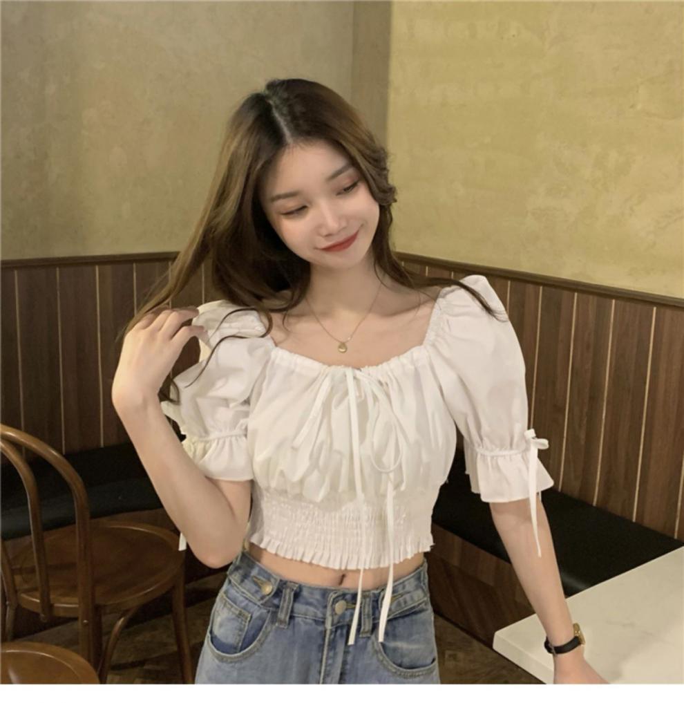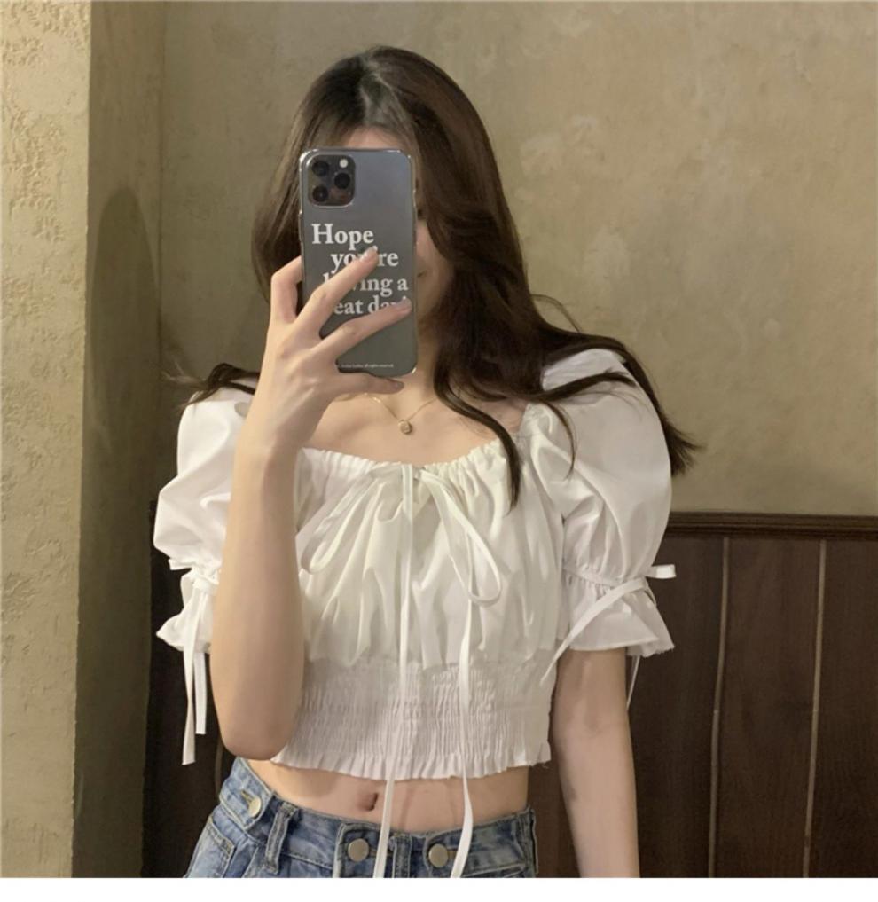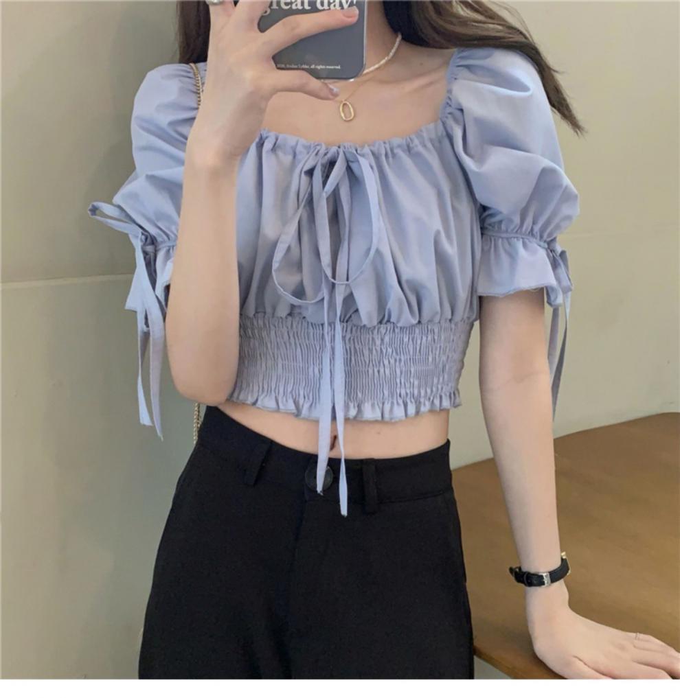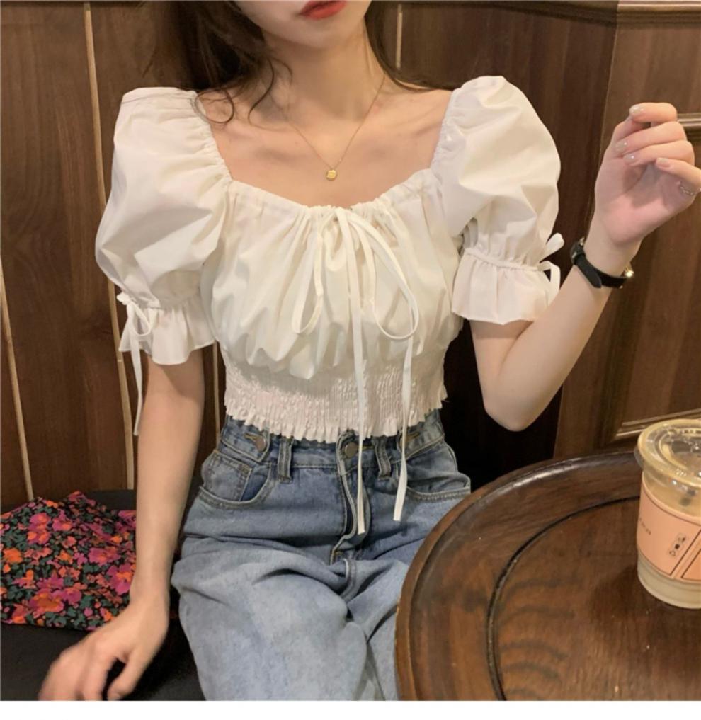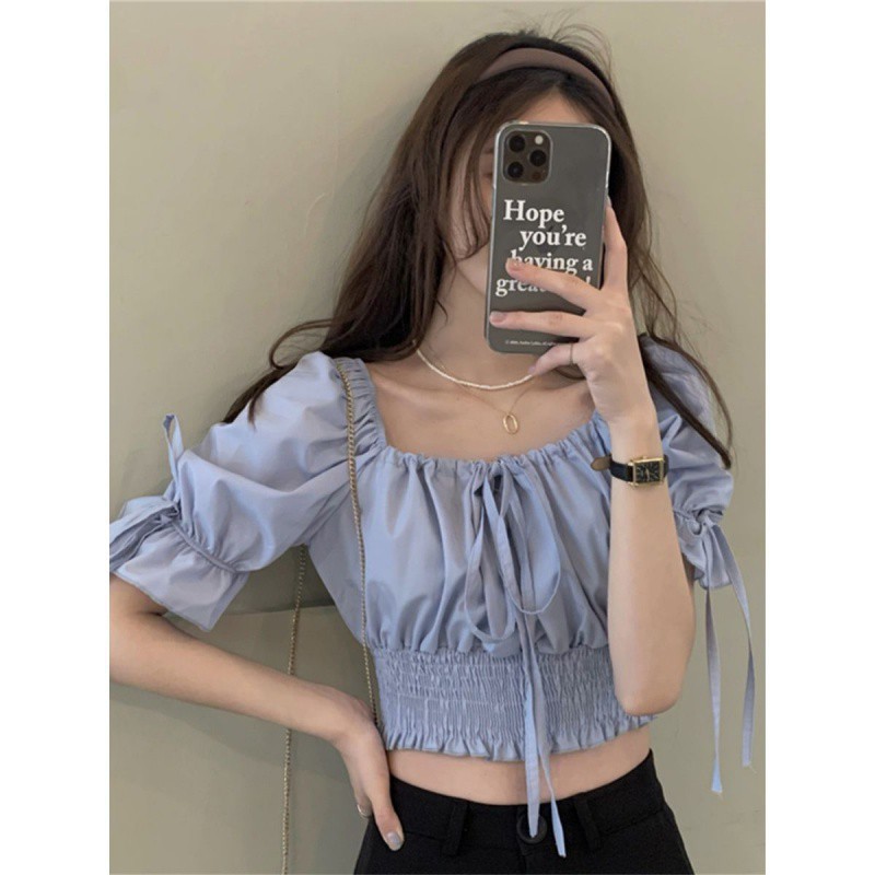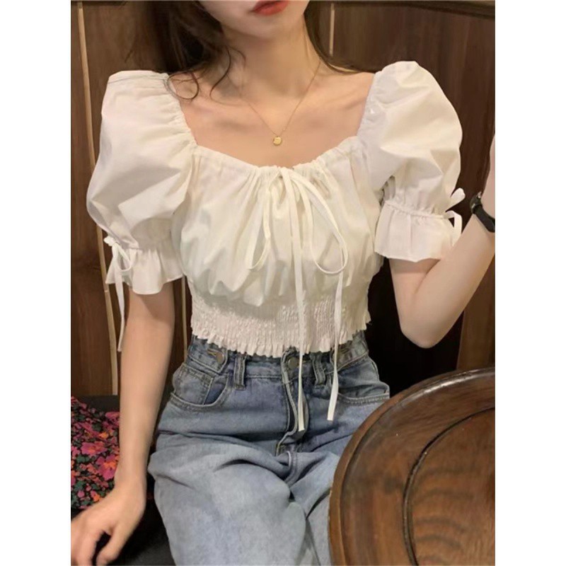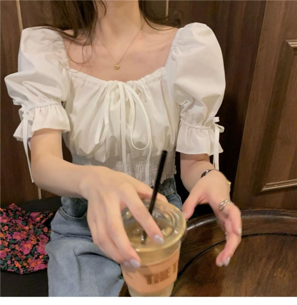 우산 스퀘어 칼라 퍼프 소매 셔츠 쉬폰 짧은 소매 여름 탑 높은 허리 얇은 여성 디자인 감각 틈새 달콤한 짧은 스타일스토어 가기