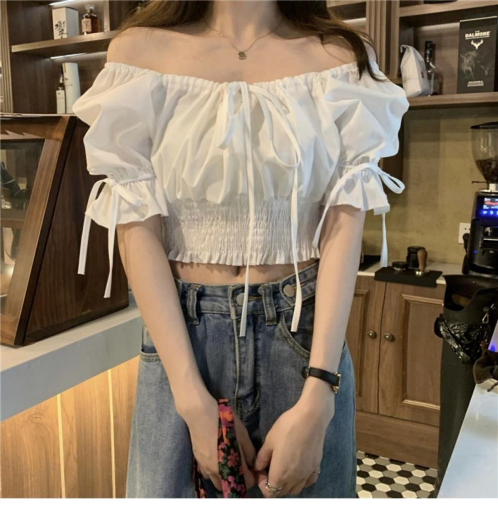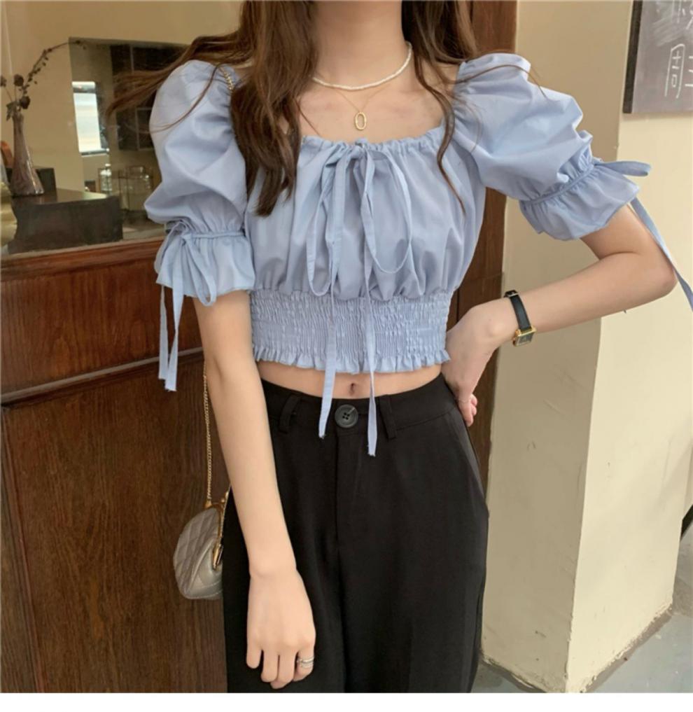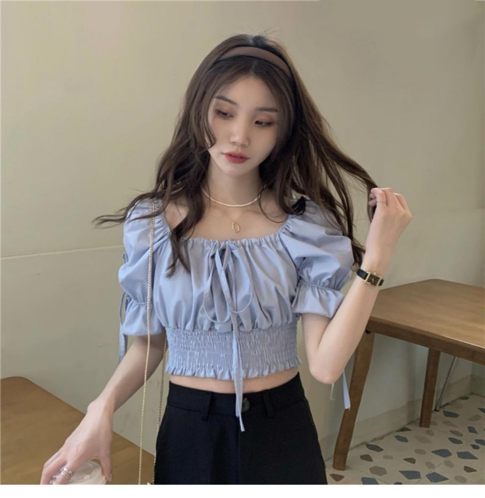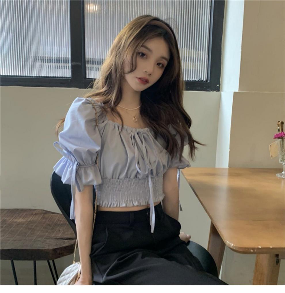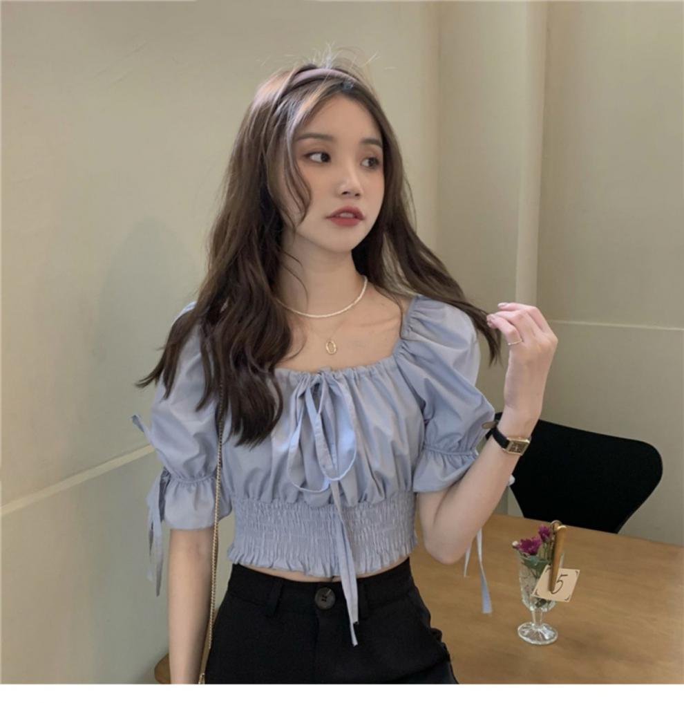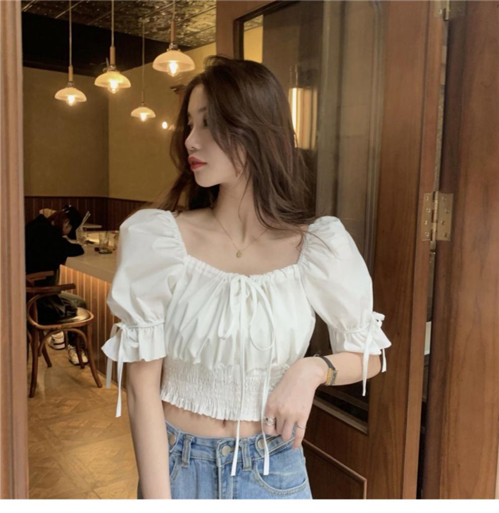 우산 스퀘어 칼라 퍼프 소매 셔츠 쉬폰 짧은 소매 여름 탑 높은 허리 얇은 여성 디자인 감각 틈새 달콤한 짧은 스타일스토어 가기