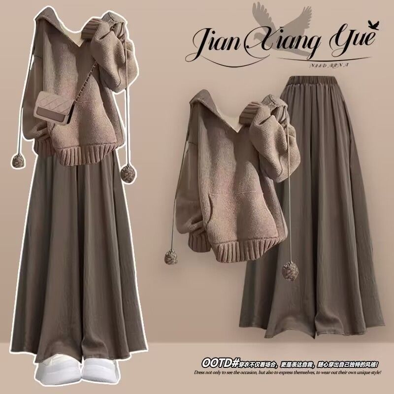 가을과 겨울 세트 여학생 한국 느슨한 게으른 단색 니트 스웨터 높은 허리 넓은 다리 바지 스커트 투피스 세트스토어 가기