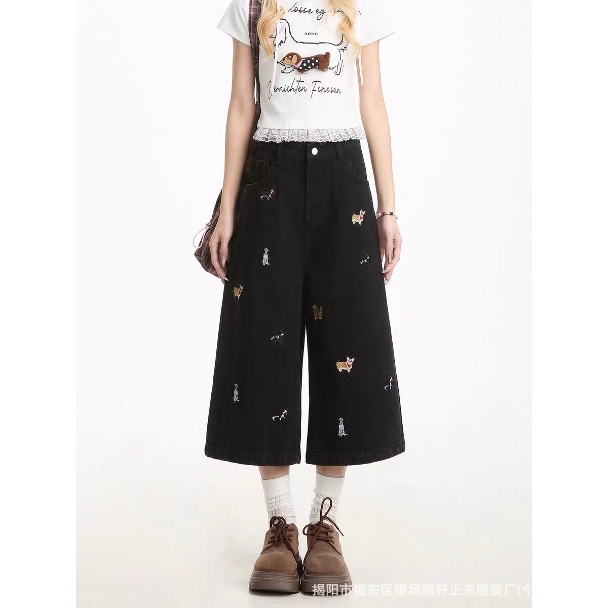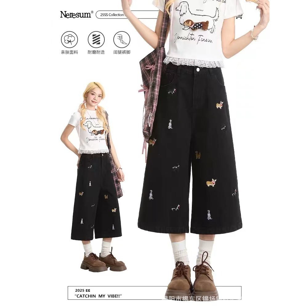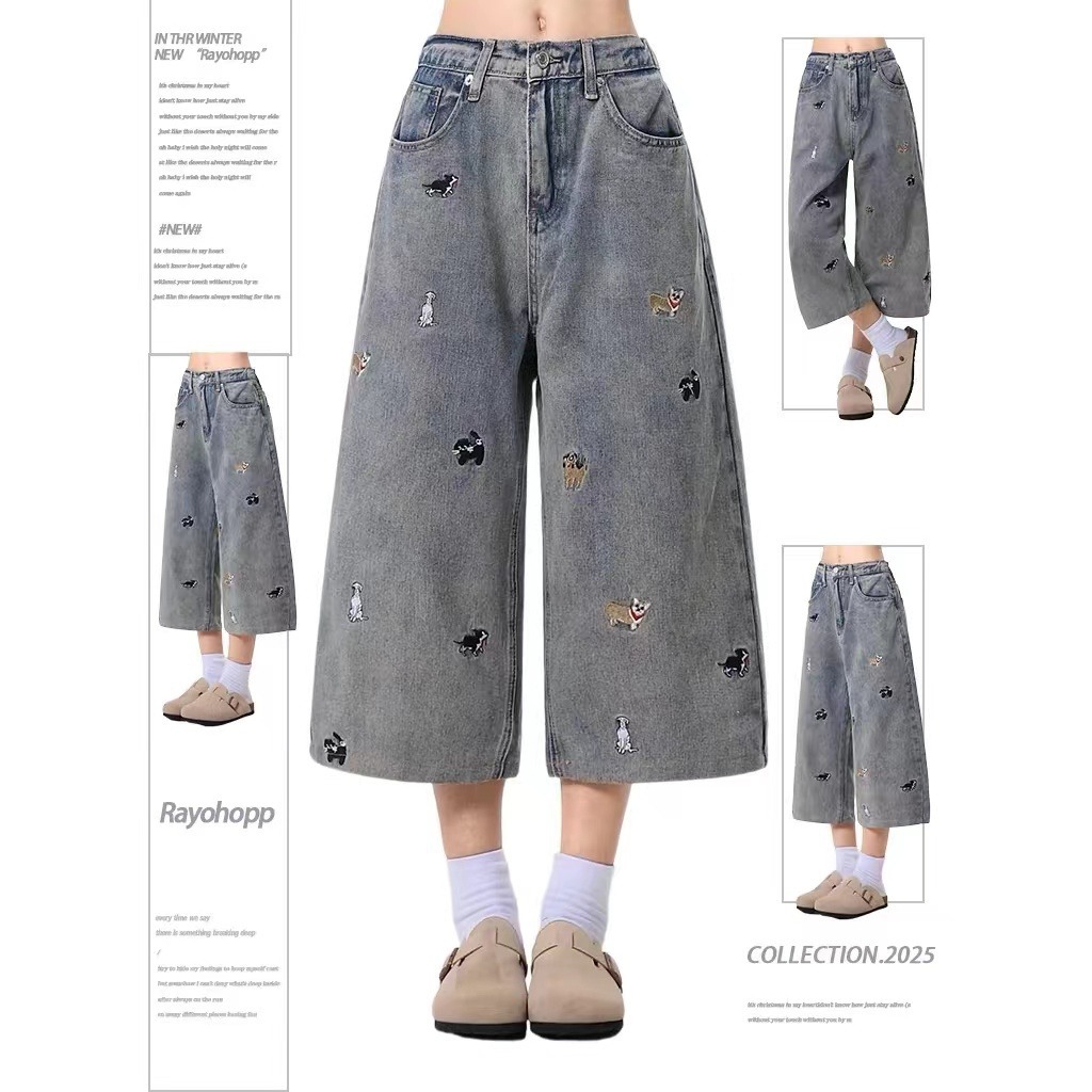 플러스 사이즈 통통녀 강아지 자수 데님 자른 바지 여성 여름 새로운 디자인 감각 느슨한 슬리밍 스트레이트 반바지 유행스토어 가기