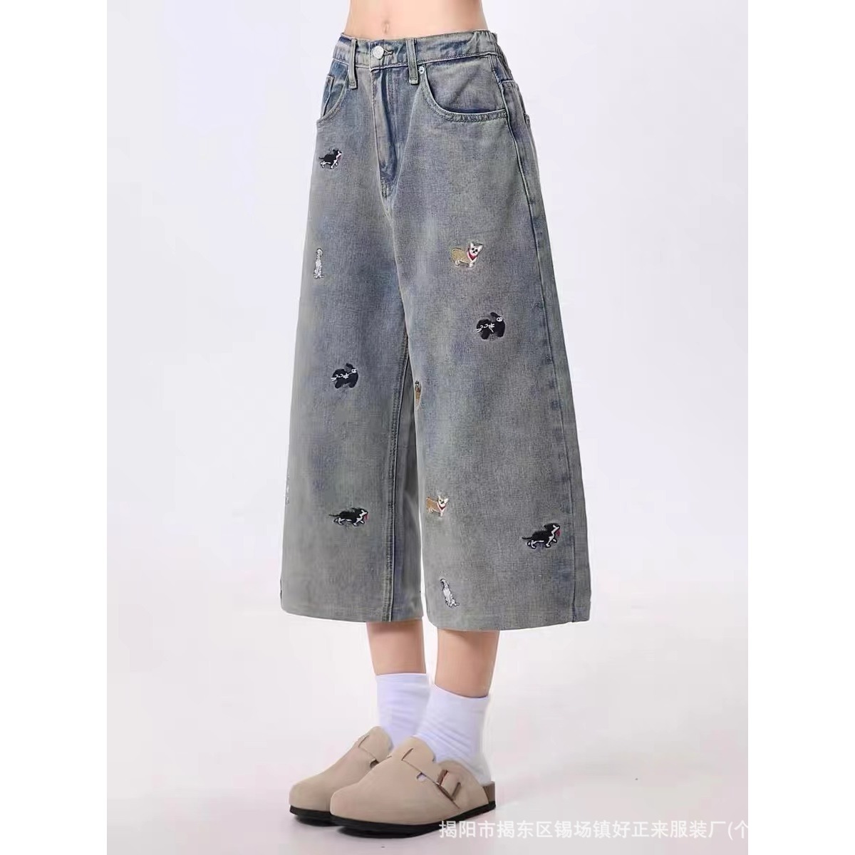 플러스 사이즈 통통녀 강아지 자수 데님 자른 바지 여성 여름 새로운 디자인 감각 느슨한 슬리밍 스트레이트 반바지 유행