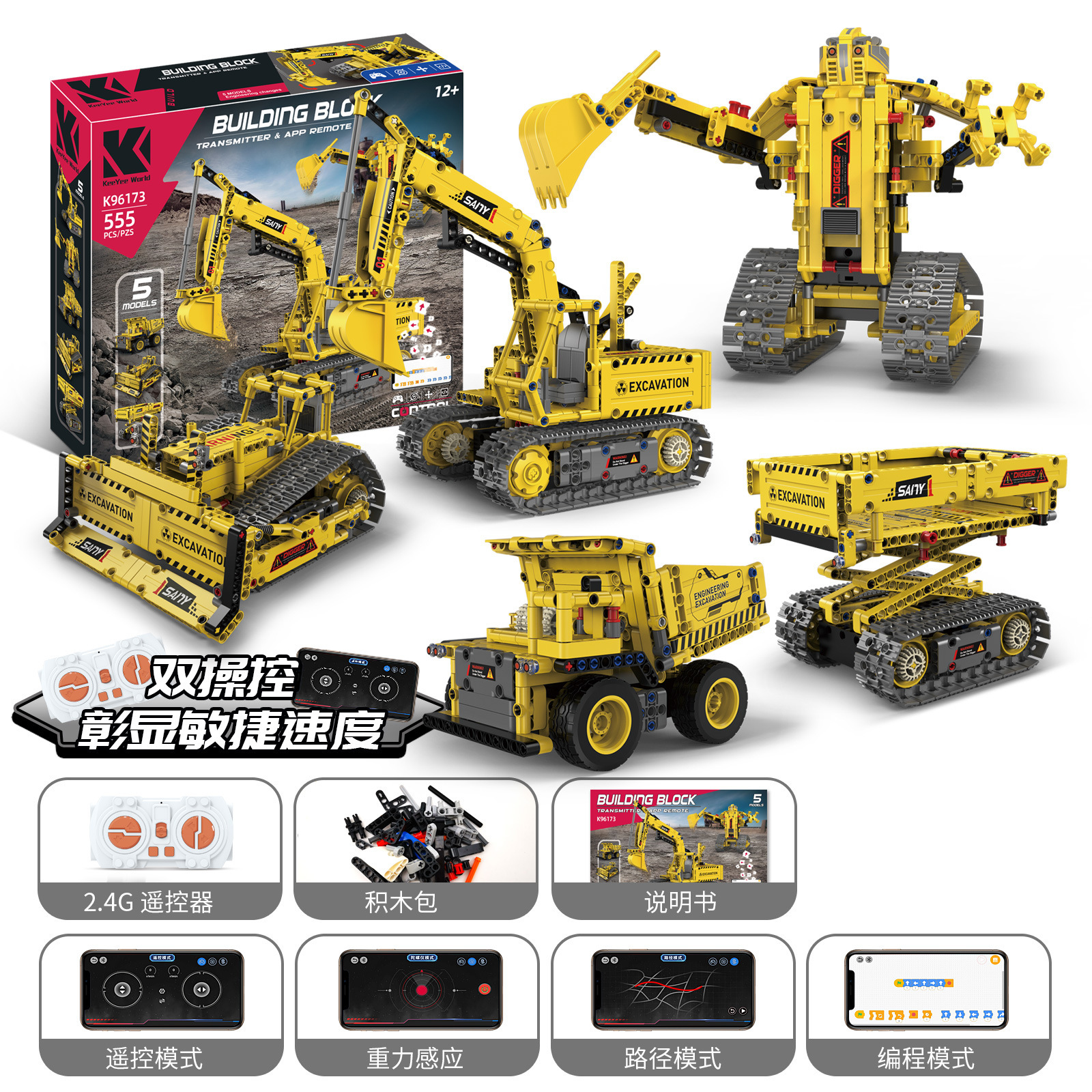 • K96173 (5가지 변형) 조립 굴삭기 로봇 (리모컨 + 휴대폰 프로그래밍)