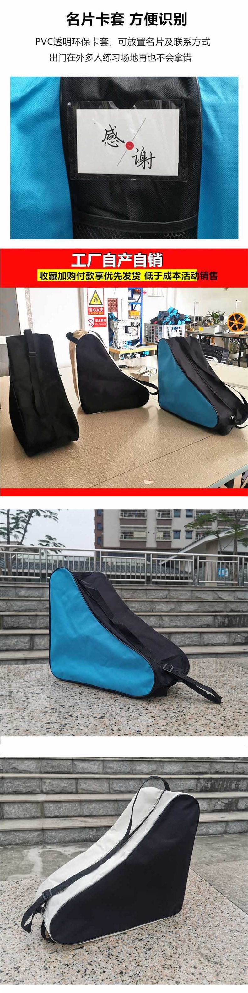 • 검정색과 파란색 삼각형 가방: 성인용 롤러 스케이트 한 켤레를 담을 수 있습니다.