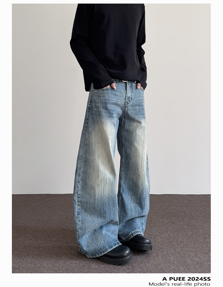 2025 뉴 아메리칸 하이 스트리트 바이브 풍 워싱 디스트레스드 블루 진 클린핏 스플릿 스트레이트 레그 부츠컷 팬츠스토어 가기