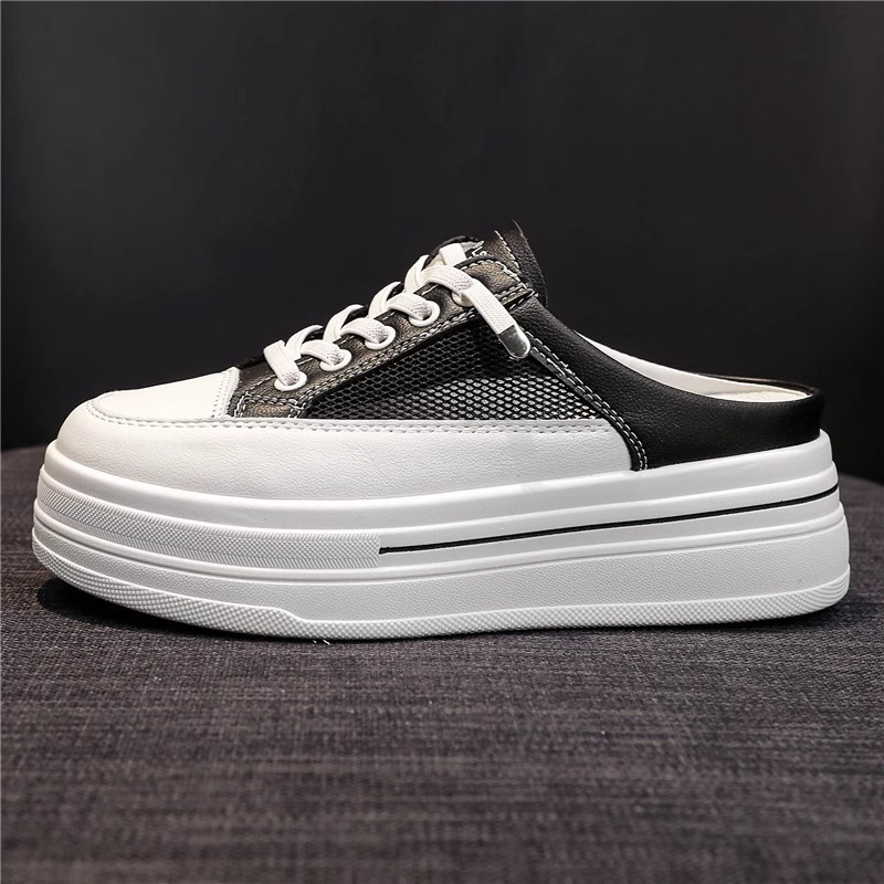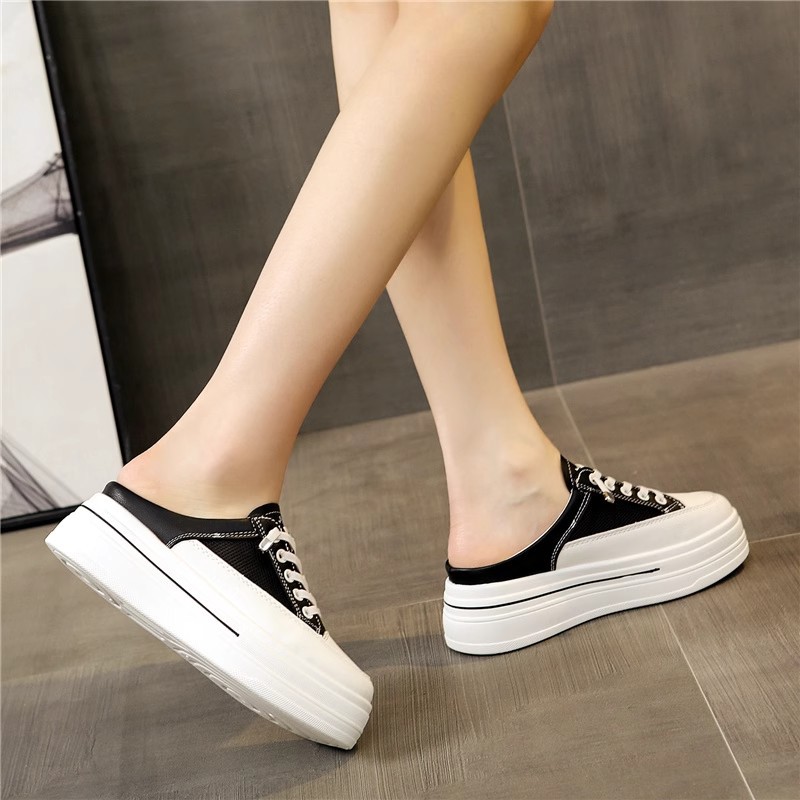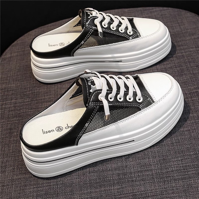 작은 내부 높이 여성 신발 올 매치 정품 가죽 메쉬 화이트 신발 봄과 여름 2025 새로운 스타일 Baotou 하프 슬리퍼 외부 착용스토어 가기