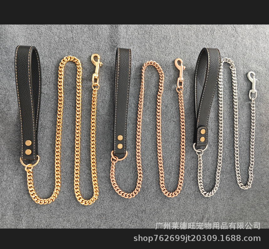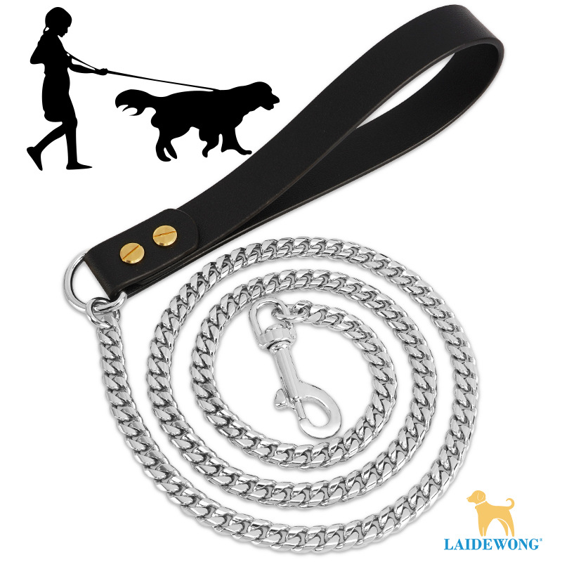 现货10mm不锈钢狗链牵引带皮把手精抛光加密古巴链宠物牵引跨境热销