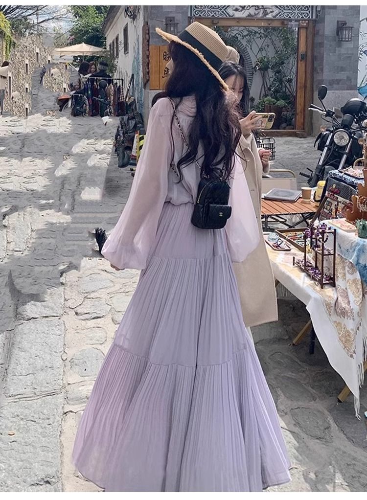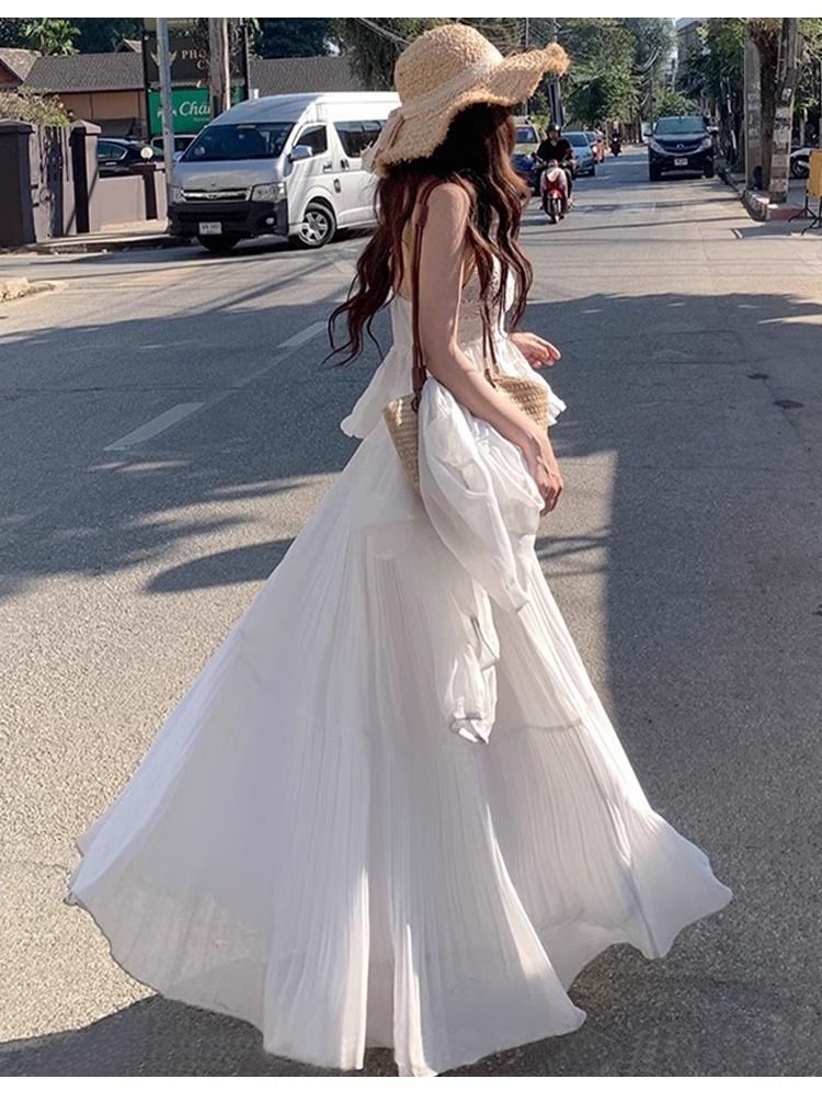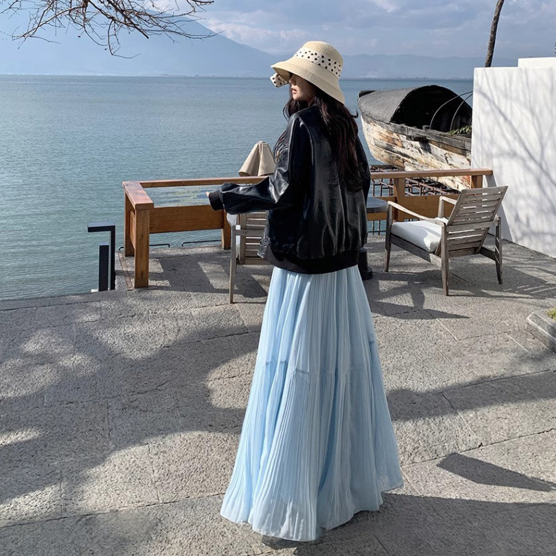화이트 쉬폰 스커트 여자 봄과 여름 2025 새로운 높은 허리 슬리밍 A 라인 올 매치 주름 케이크 스커트 롱 스커트