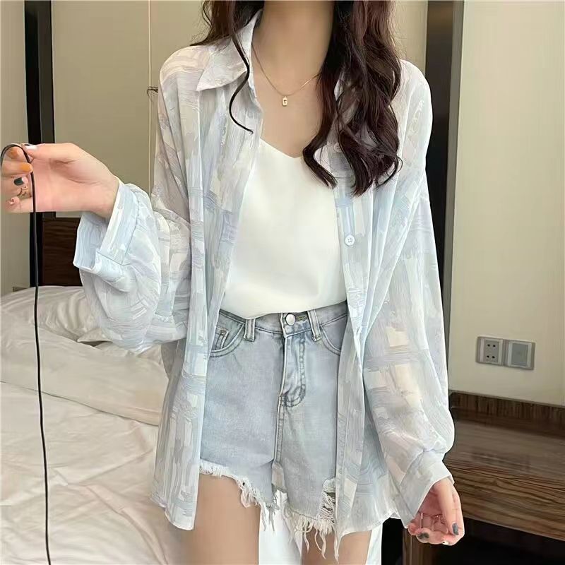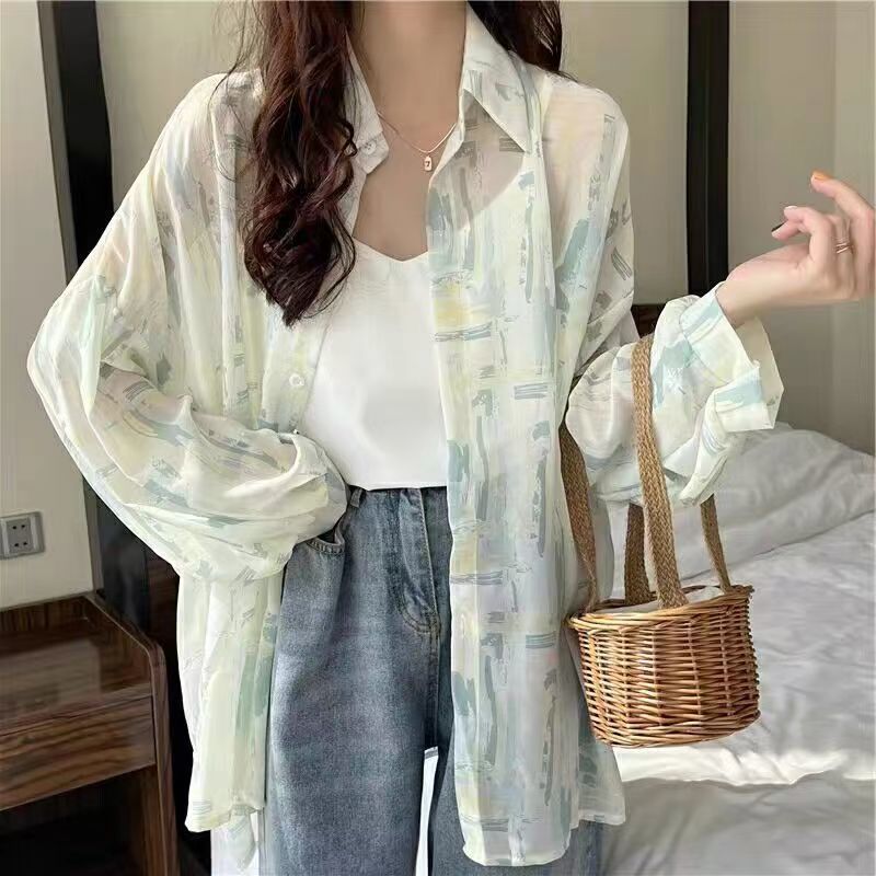 넥타이-염료 쉬폰 셔츠 여성용 얇은 여름 느슨한 외부 에어컨 카디건 탑 아이스 실크 긴팔 선 스크린 아우터웨어