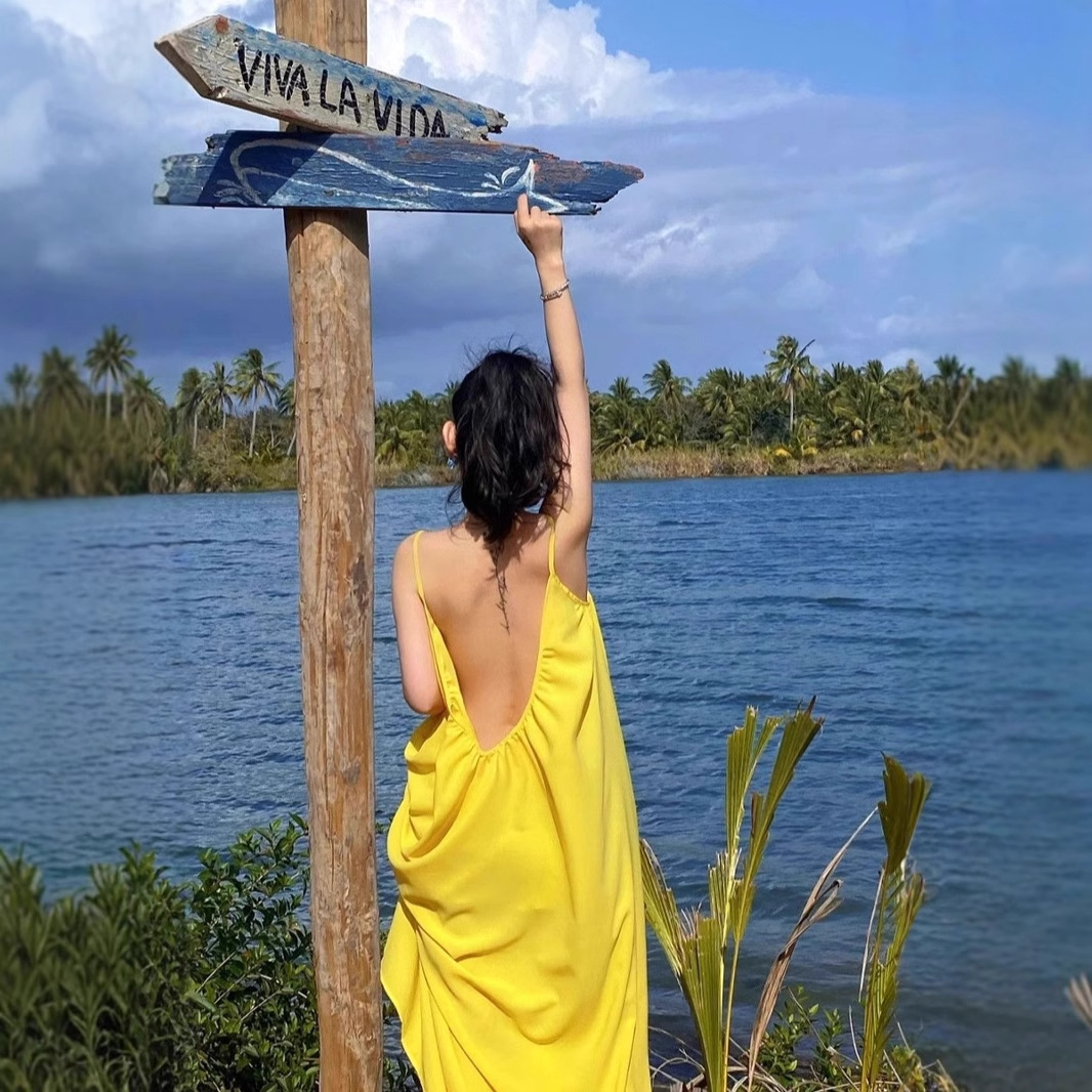 해변 휴가 섹시한 백리스 스트랩 원피스 여성 여름 새로운 느슨한 A 라인 원피스 부드러운 노란색 긴 원피스스토어 가기