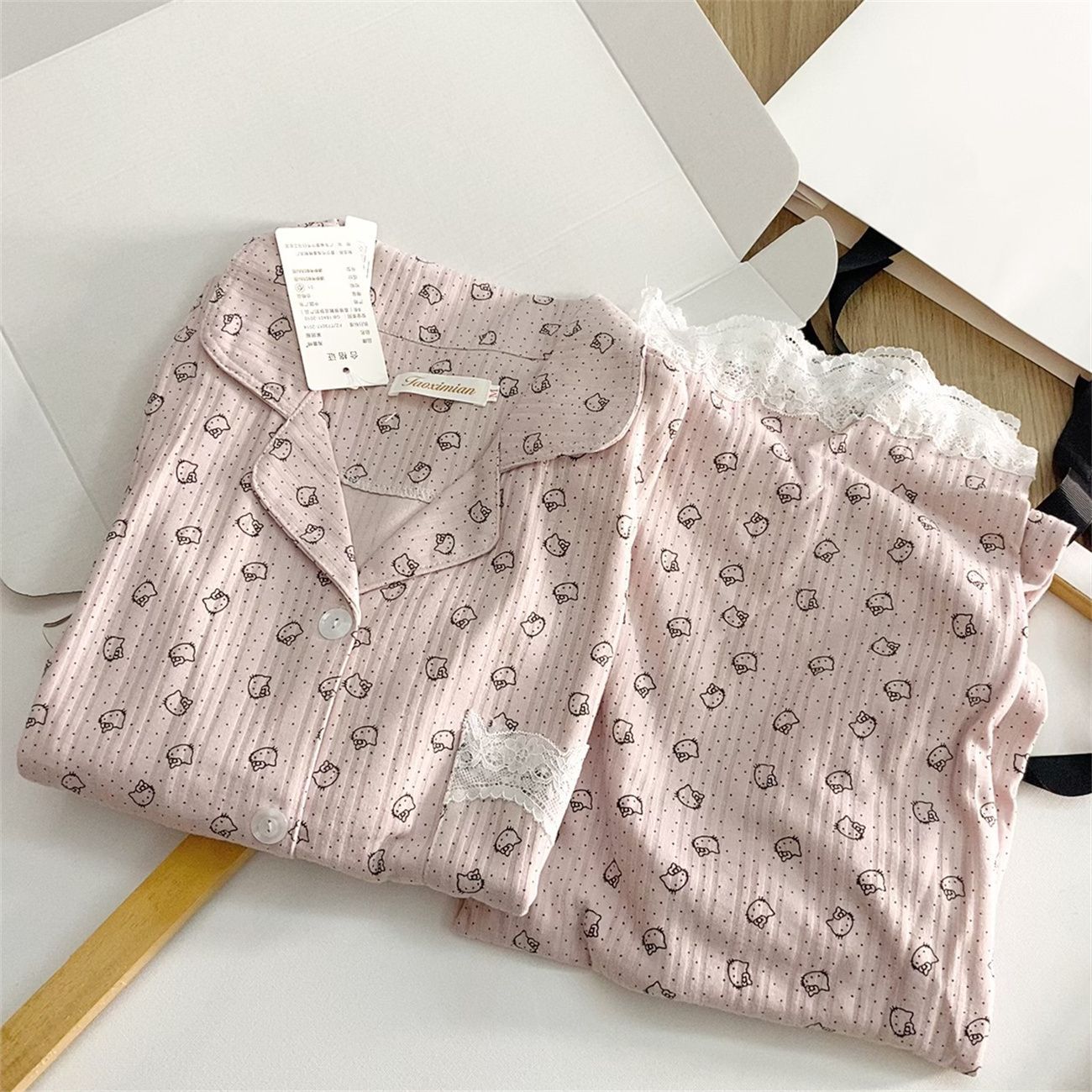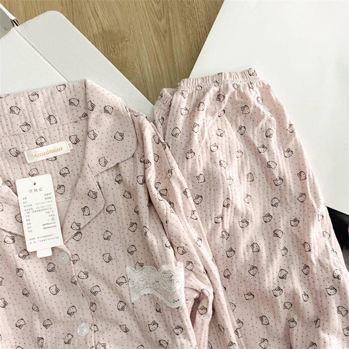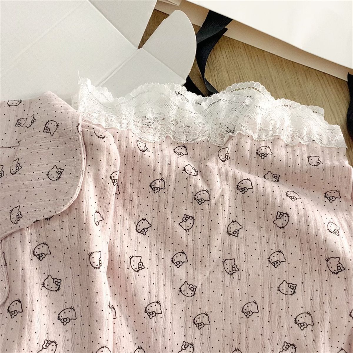 레이스 닷 키티 고양이 잠옷 여성의 봄과 가을 새로운 긴 소매 Ins 스타일 일본식 만화 홈 의류 세트 외주스토어 가기
