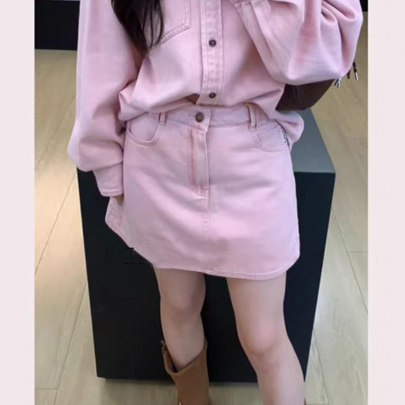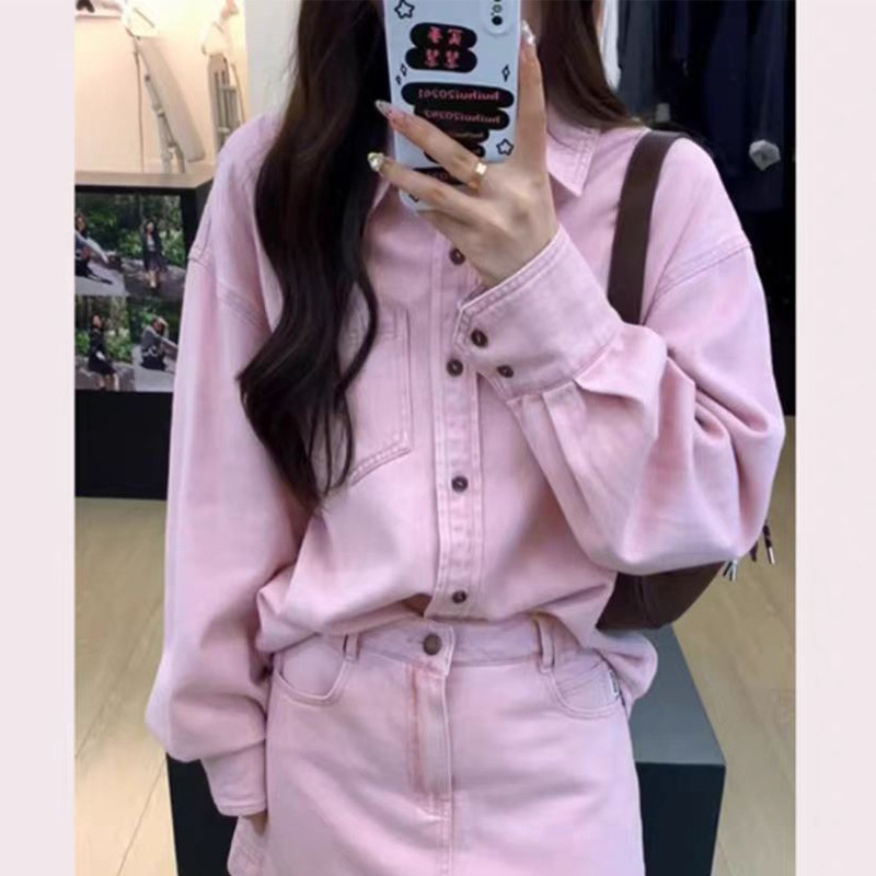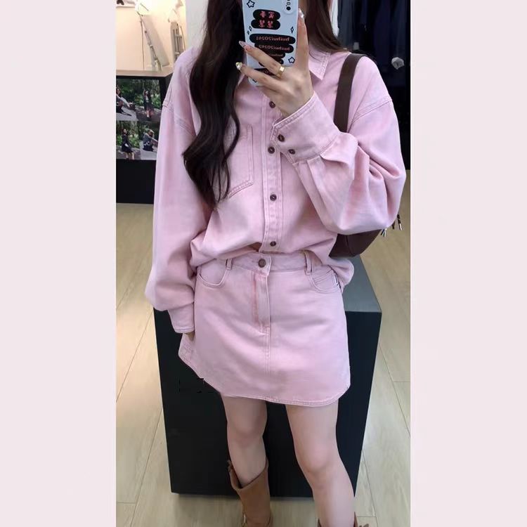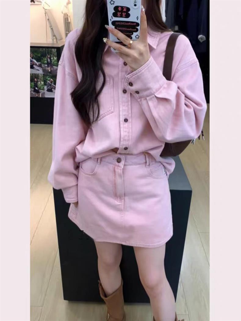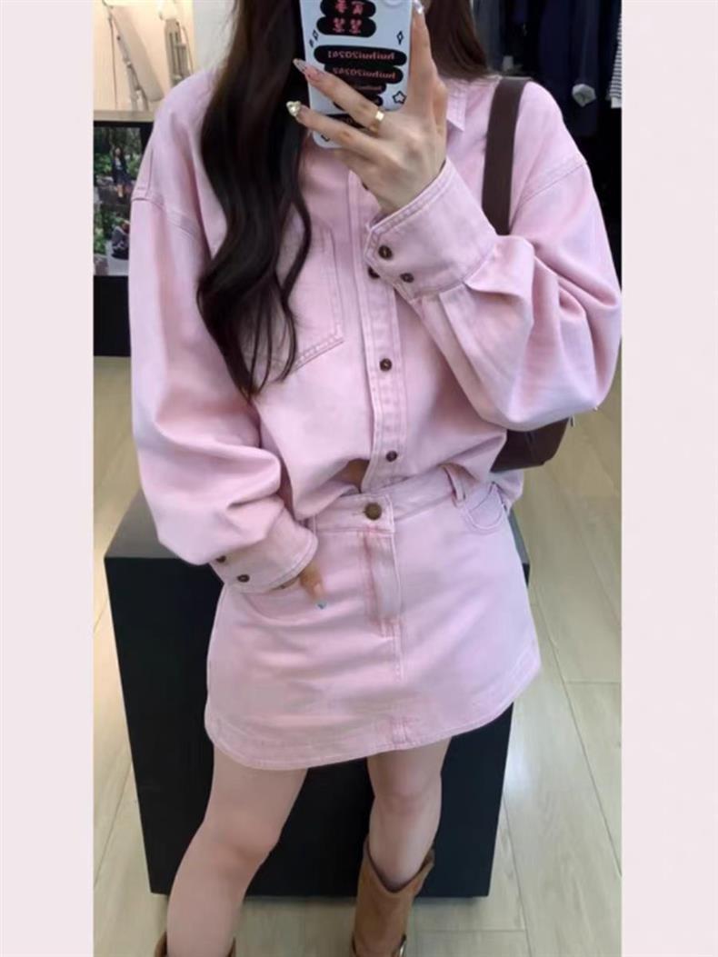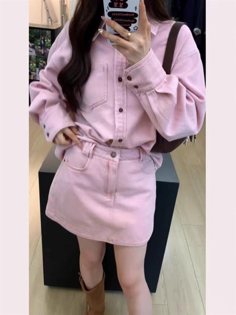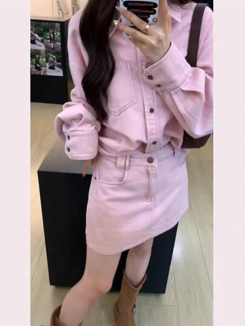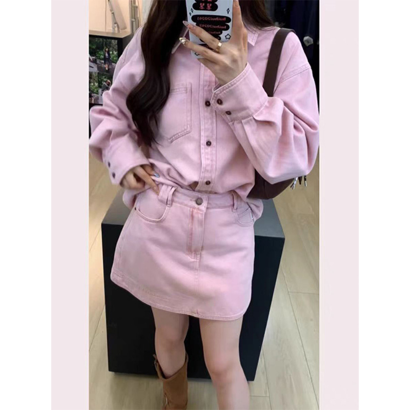 핑크 데님 세트 여성의 봄과 가을 새로운 하이 엔드 우아한 긴팔 셔츠 재킷 힙합 스커트 투피스 세트
