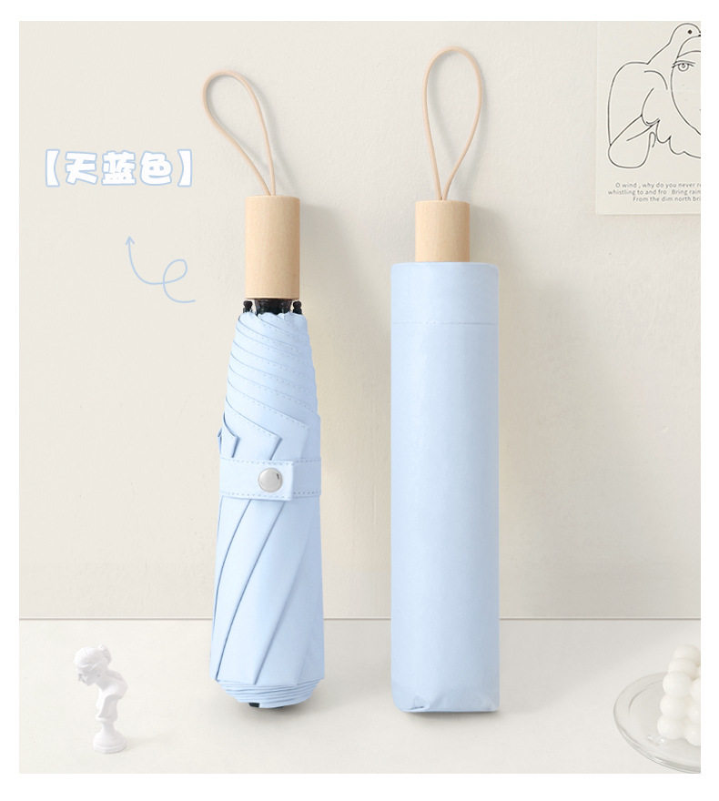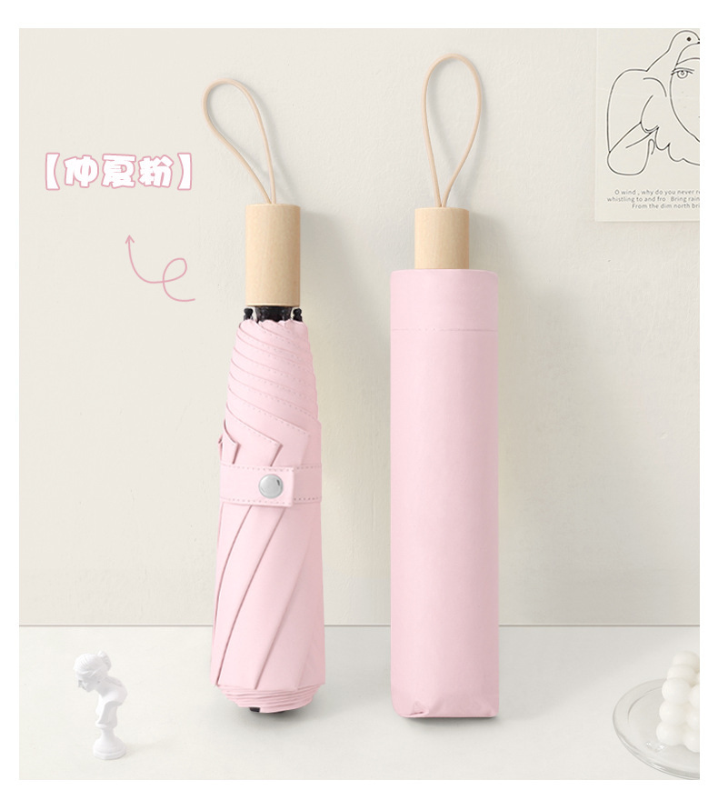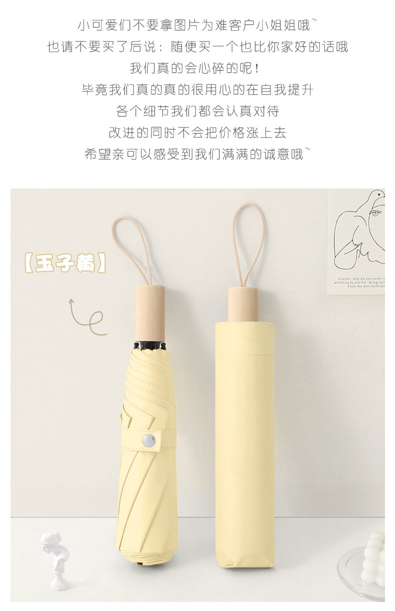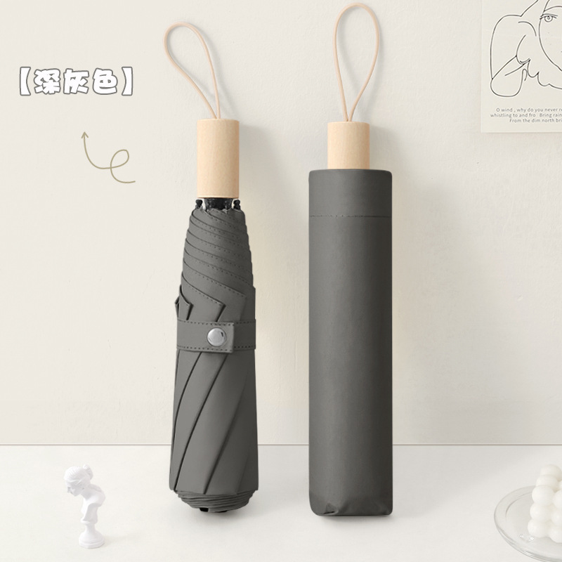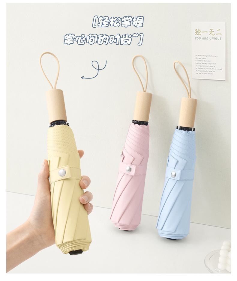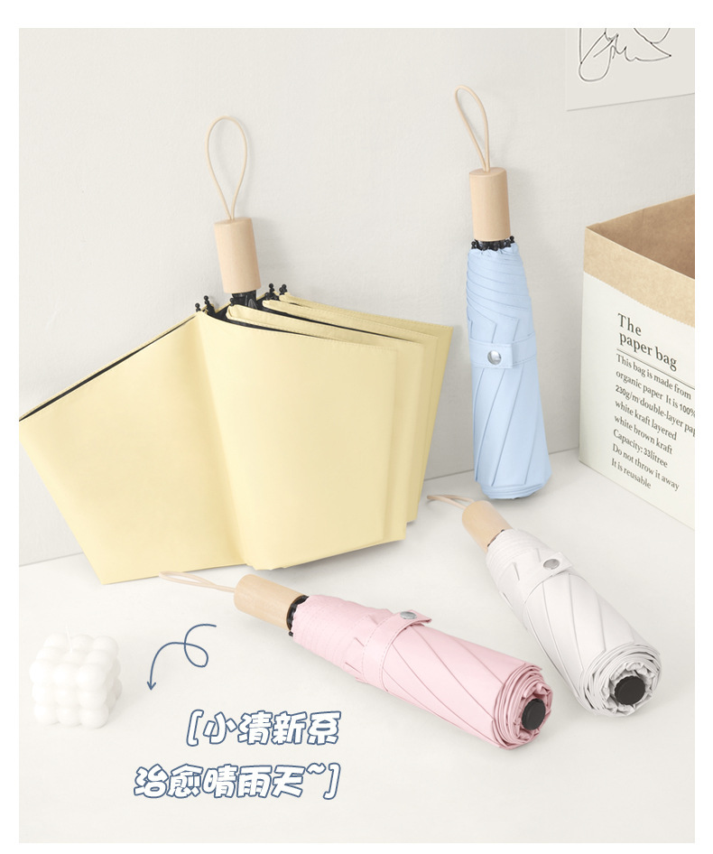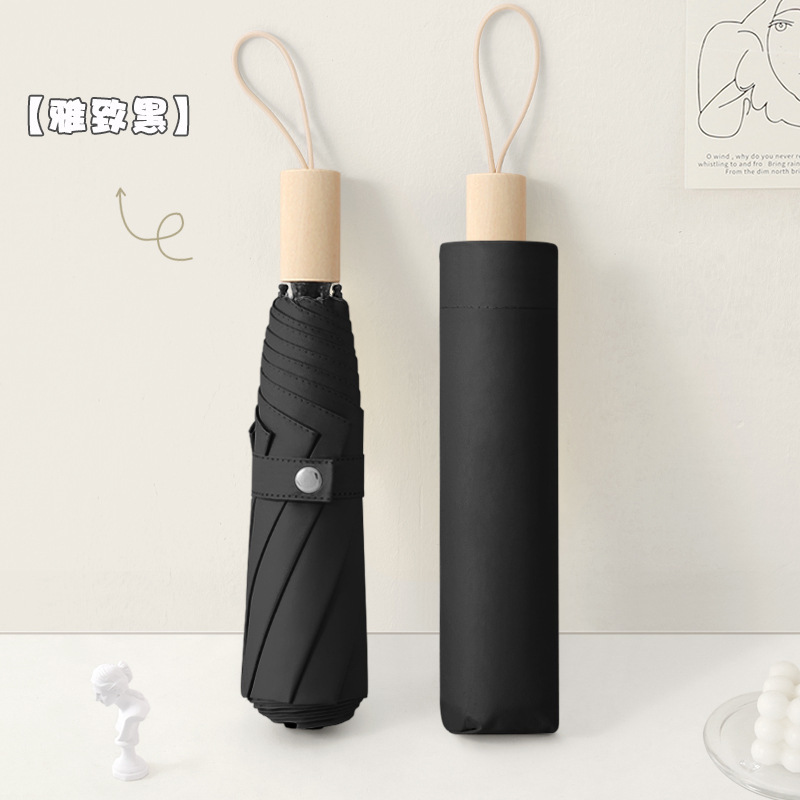 새로운 스타일 간단한 솔리드 우드 핸들 블랙 고무 햇빛 3 배 태양 우산 작은 신선한 우산 인쇄 로고 광고 우산스토어 가기