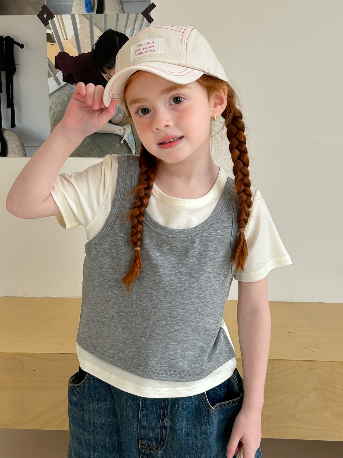 소녀 2025 여름 새로운 패션 명암 컬러 바느질 짧은 소매 탑 어린이 한국식 가짜 투피스 티셔츠