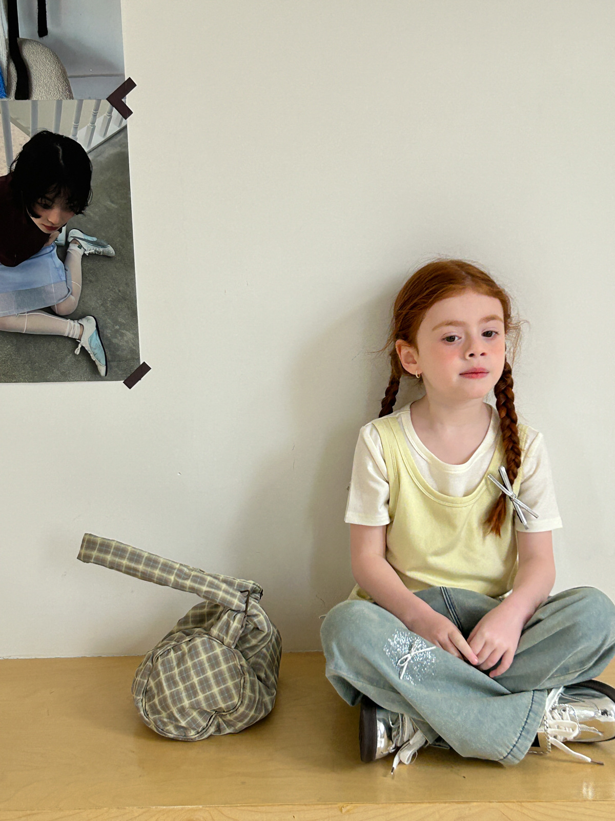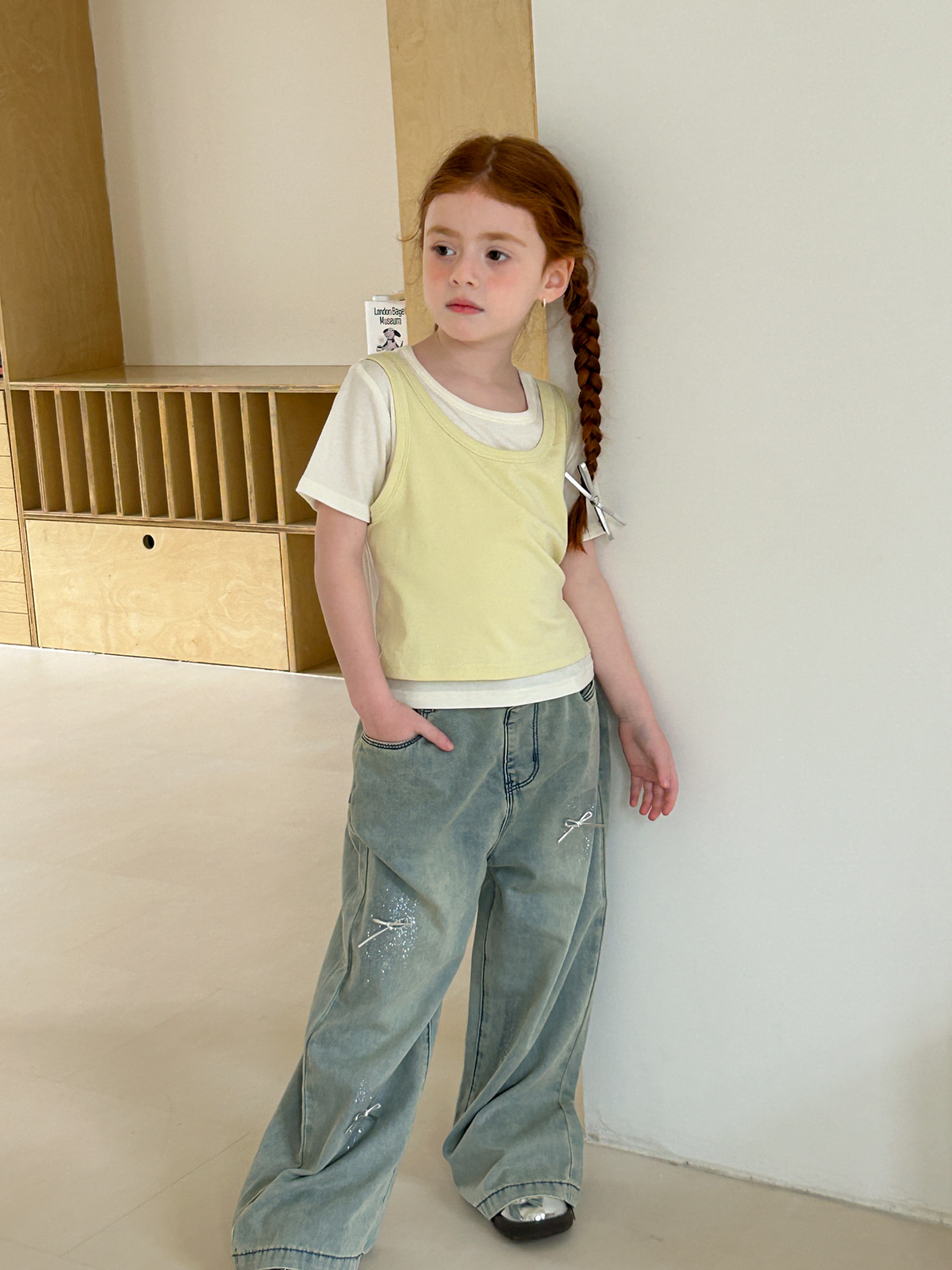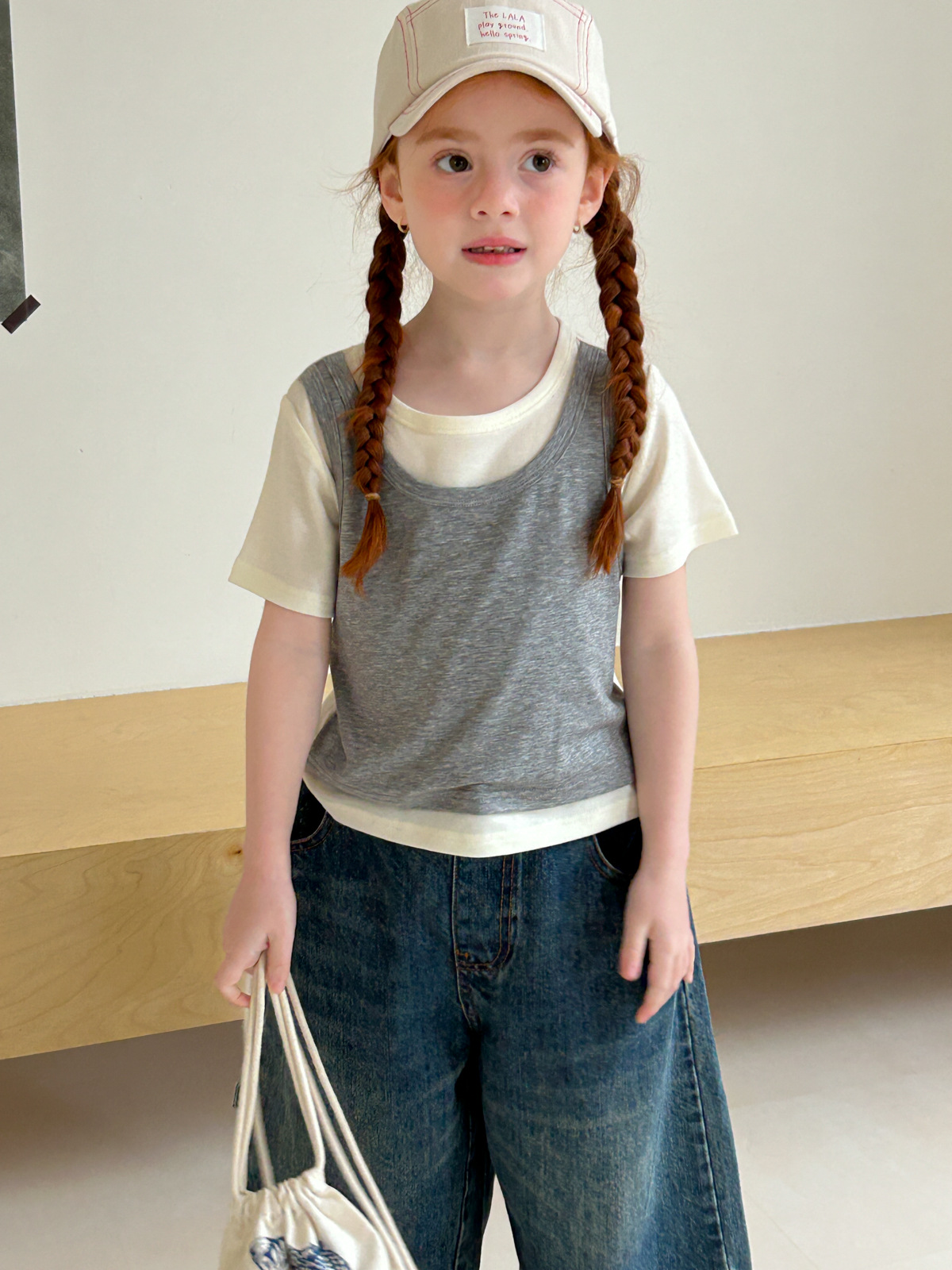 소녀 2025 여름 새로운 패션 명암 컬러 바느질 짧은 소매 탑 어린이 한국식 가짜 투피스 티셔츠스토어 가기