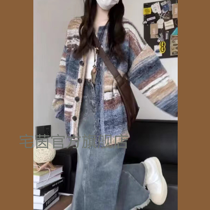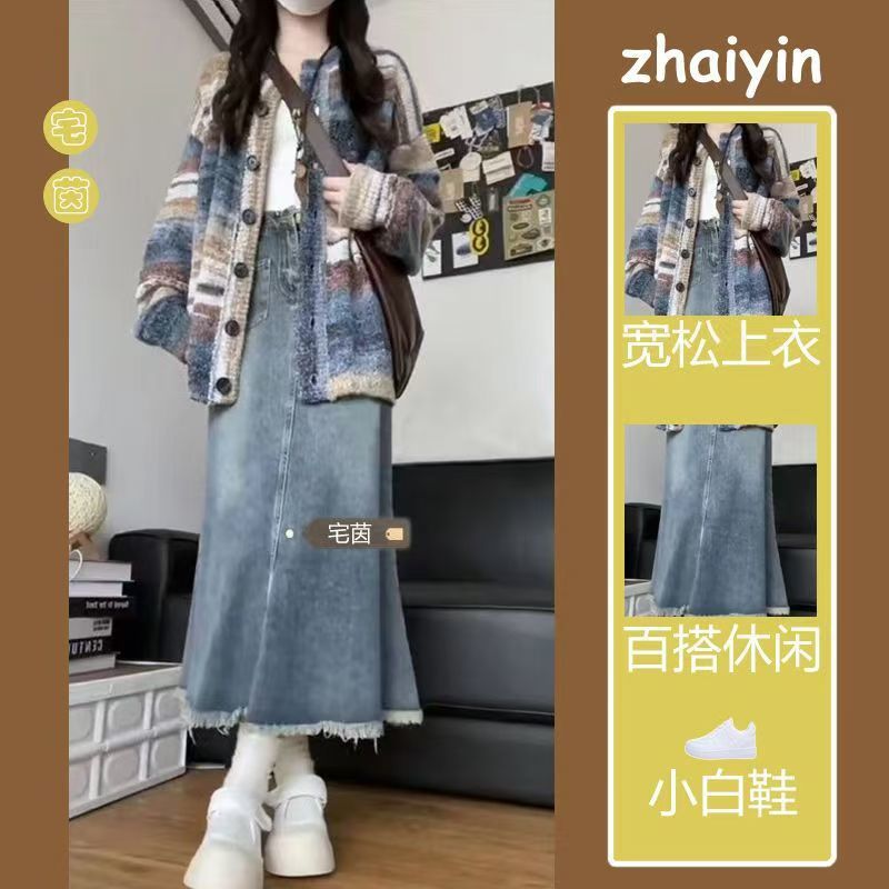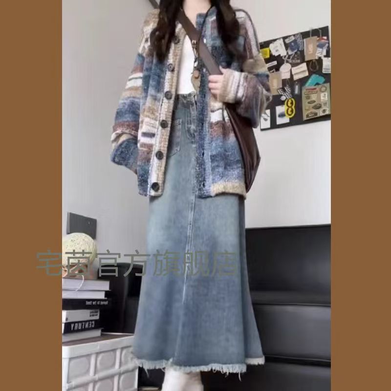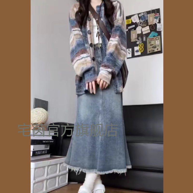 가을과 겨울 한국 스타일은 여성의 게으른 스타일 그라디언트 스트라이프 스웨터 카디건 데님 피쉬 테일 하프 스커트 세트를 착용합니다.스토어 가기