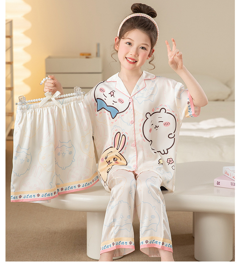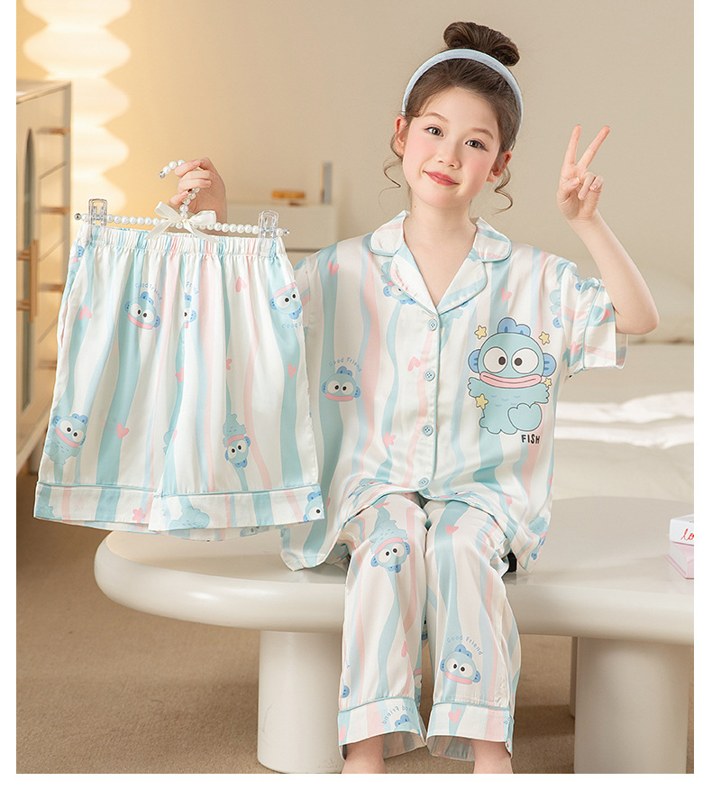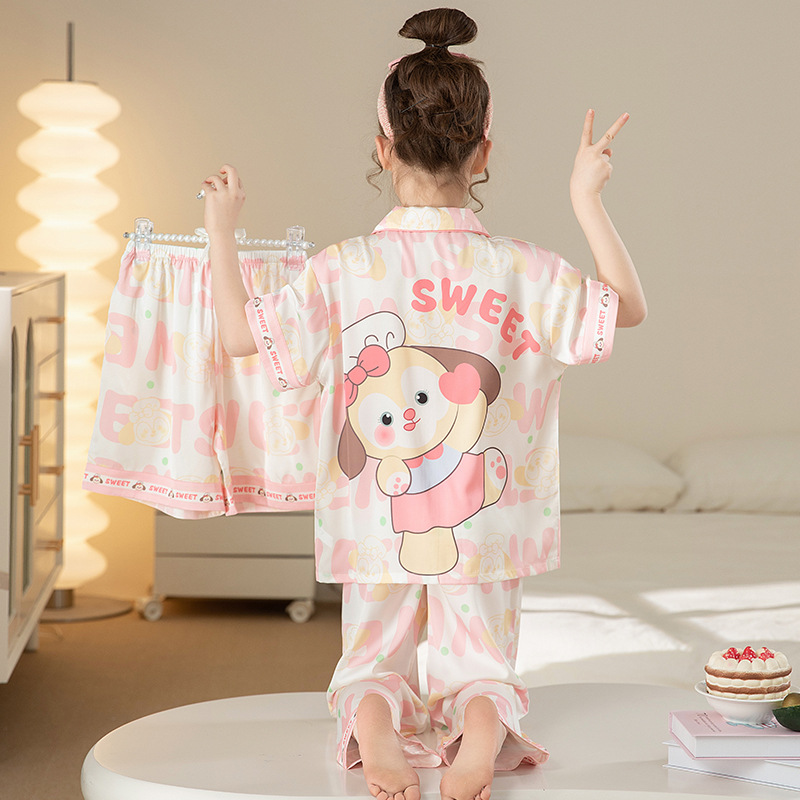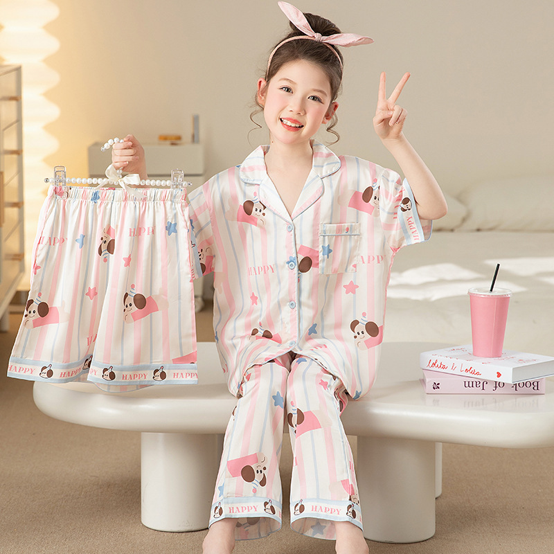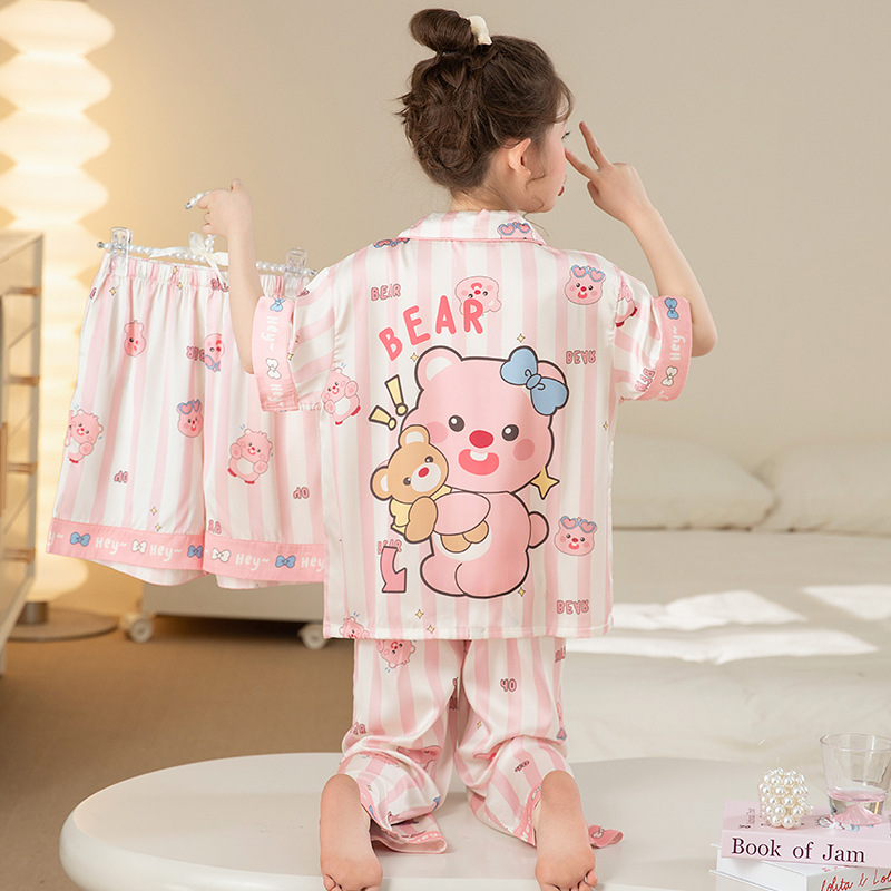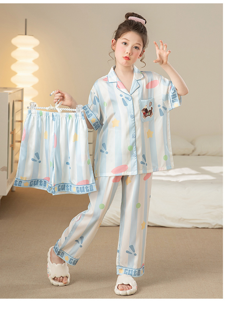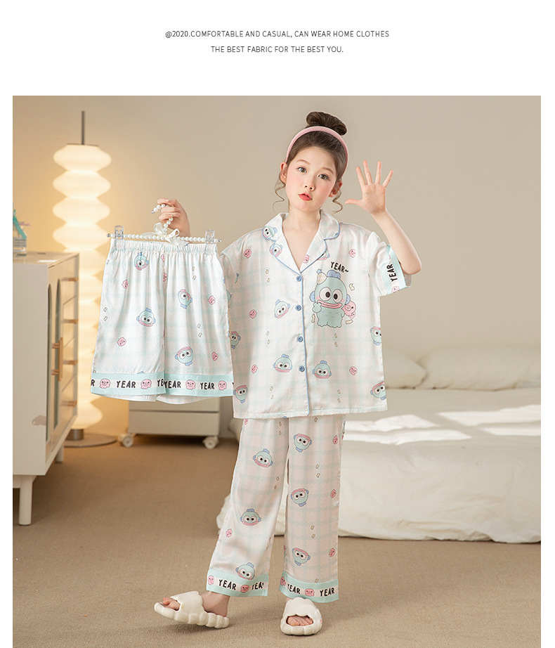 잠옷 어린이 여름 아이스 실크 소녀 3 종 세트 얇은 반팔 여름 소녀 서양식 아기 홈 의류 세트