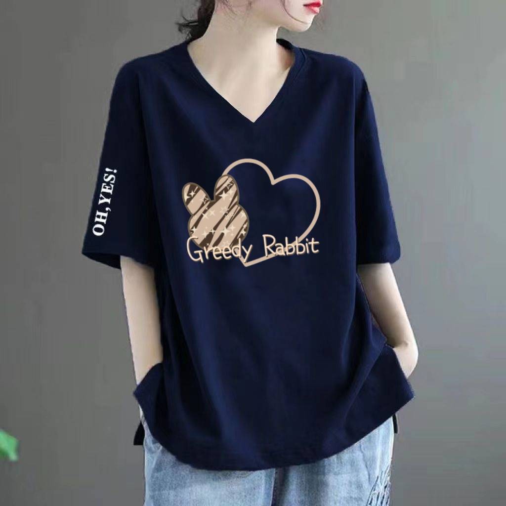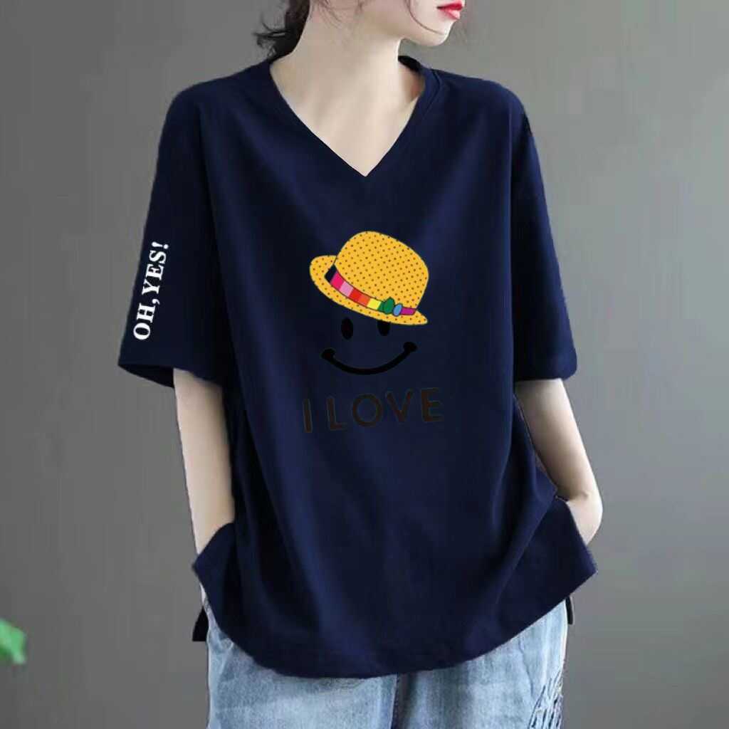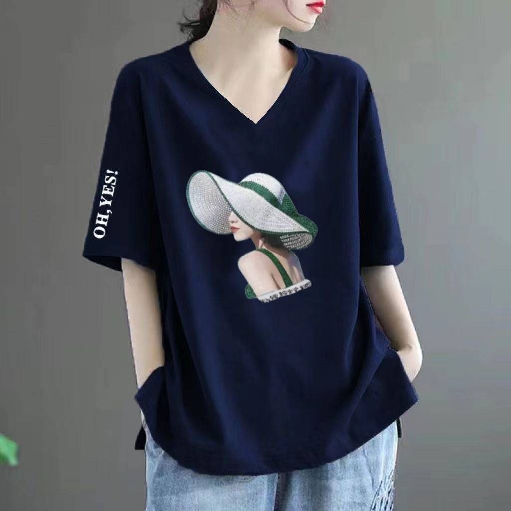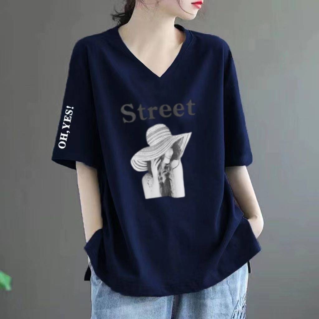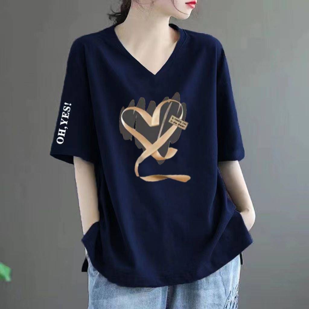 여성용 반팔 티셔츠, 브이넥 여름 신작 루즈한 대형 사이즈 배를 커버하고 슬림해 보이는 패셔너블한 프린트 티셔츠 탑스토어 가기