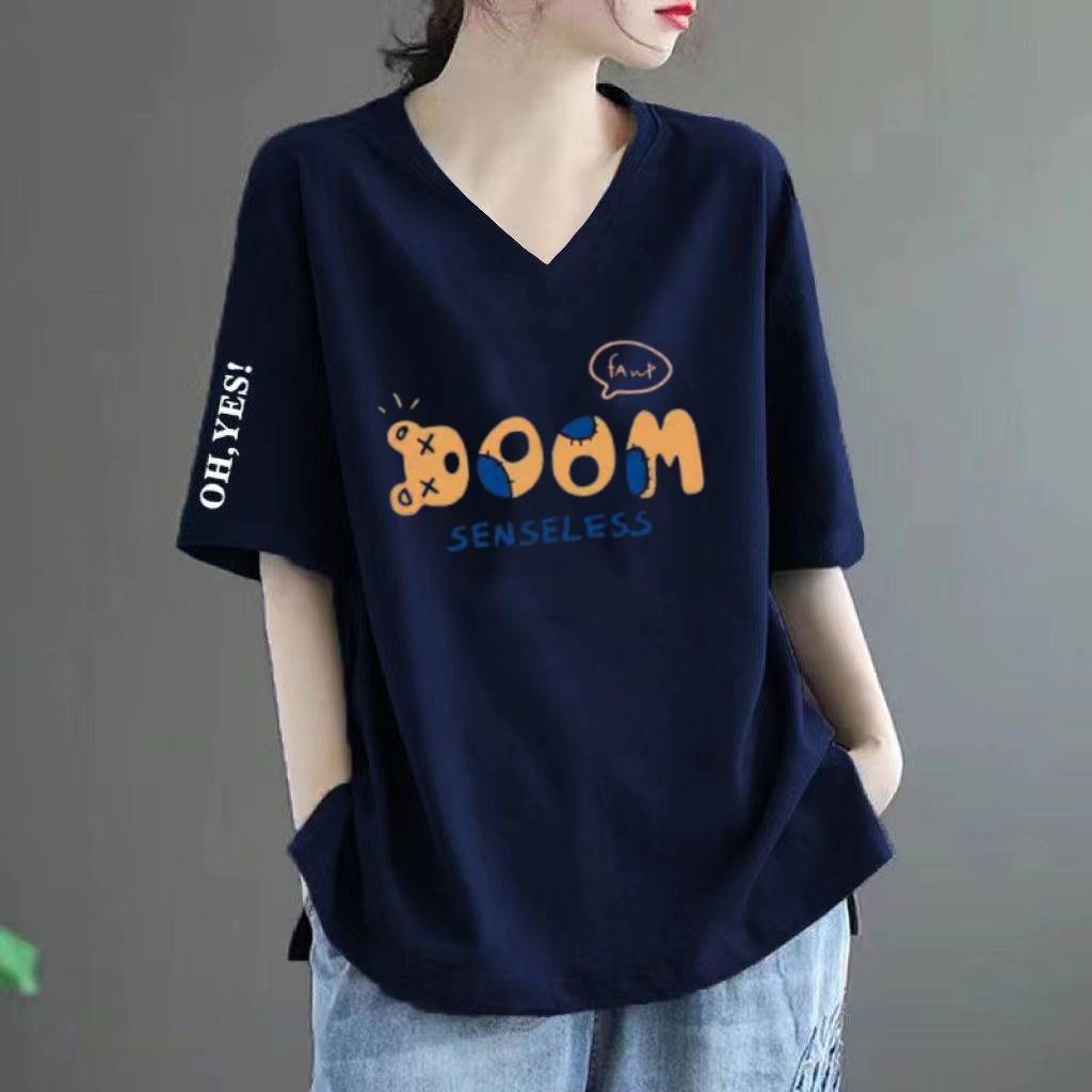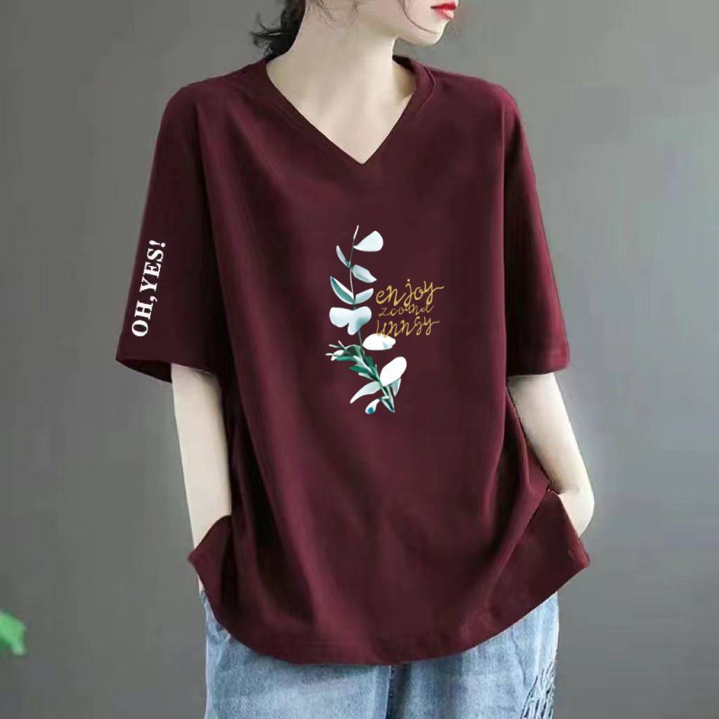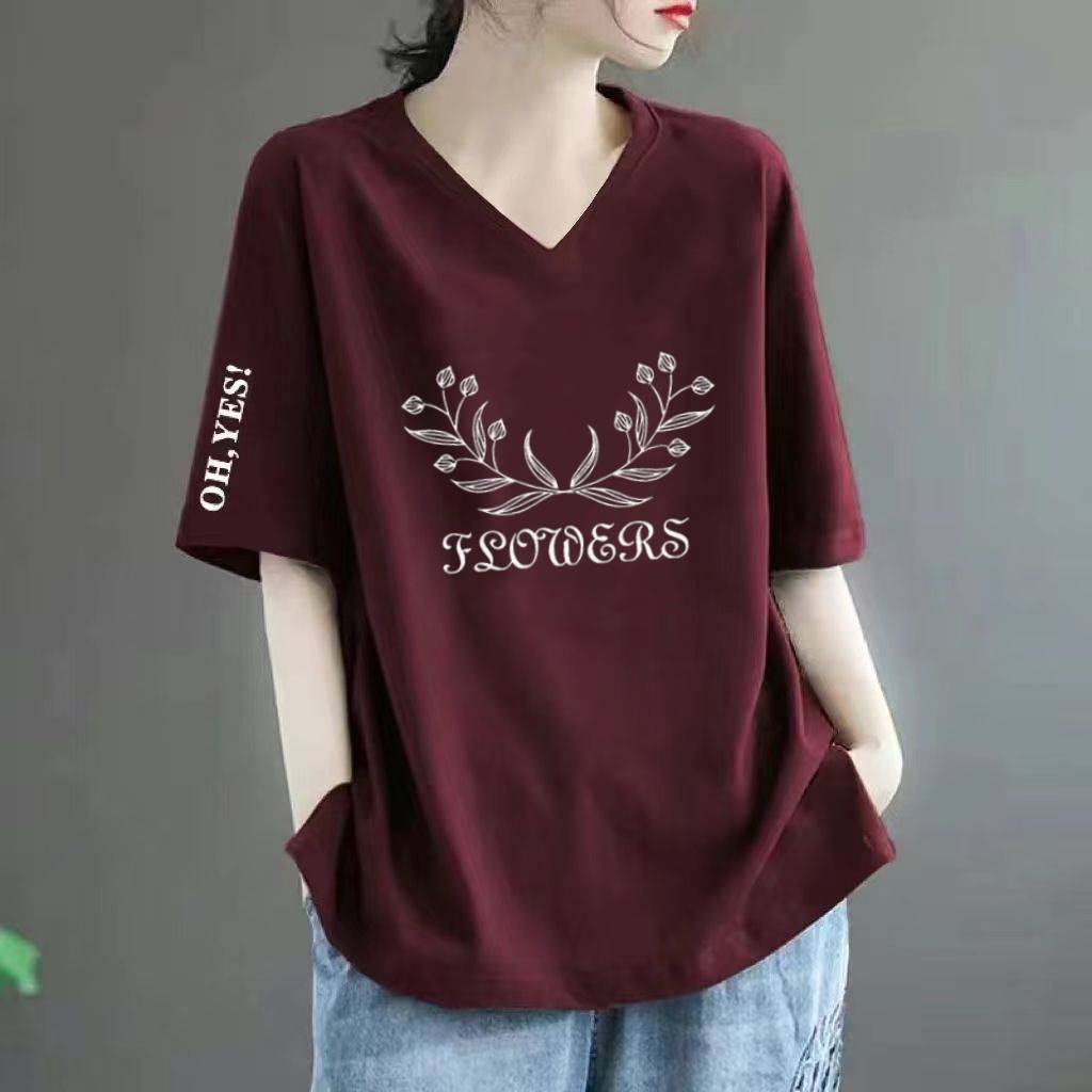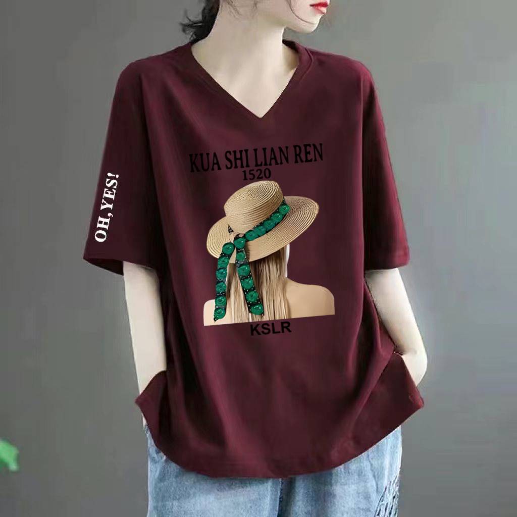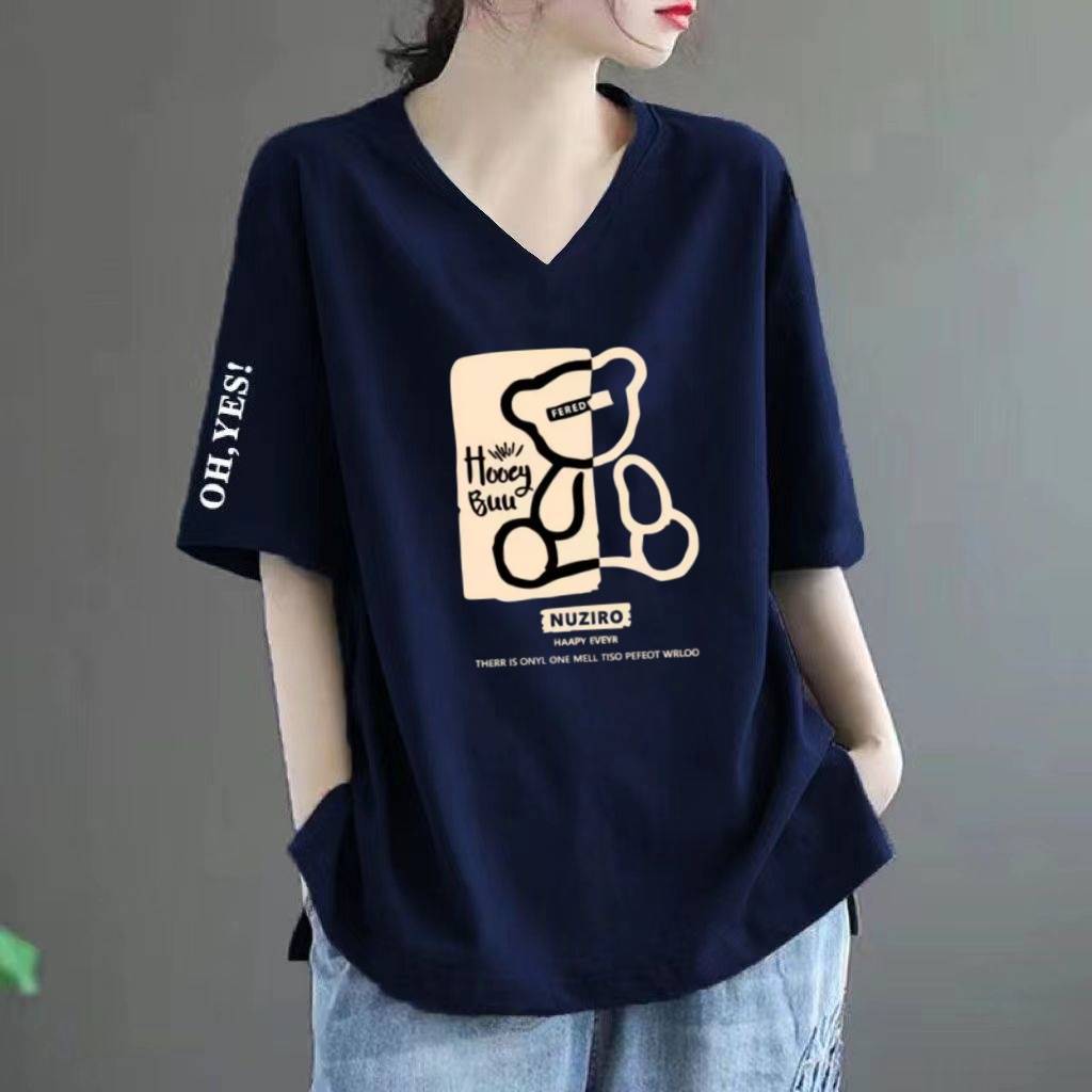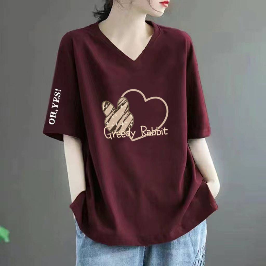 여성용 반팔 티셔츠, 브이넥 여름 신작 루즈한 대형 사이즈 배를 커버하고 슬림해 보이는 패셔너블한 프린트 티셔츠 탑스토어 가기