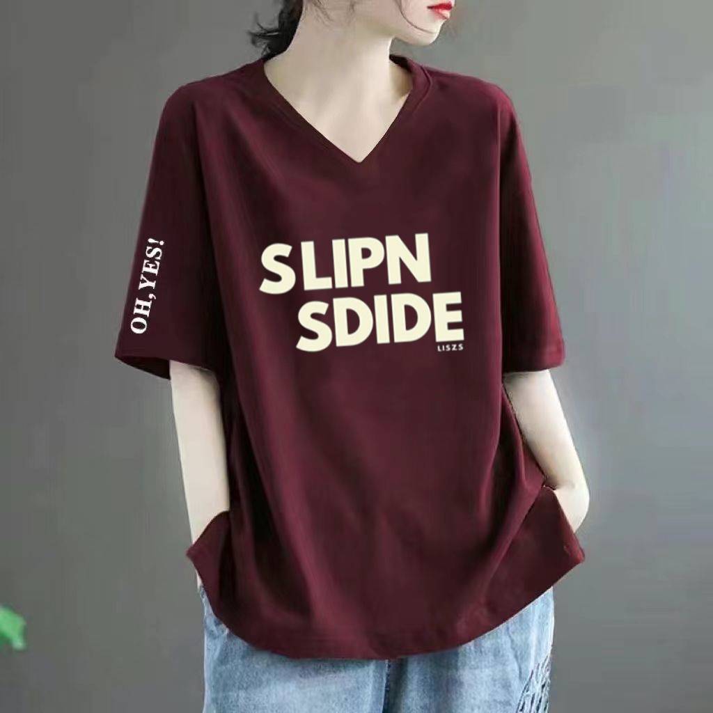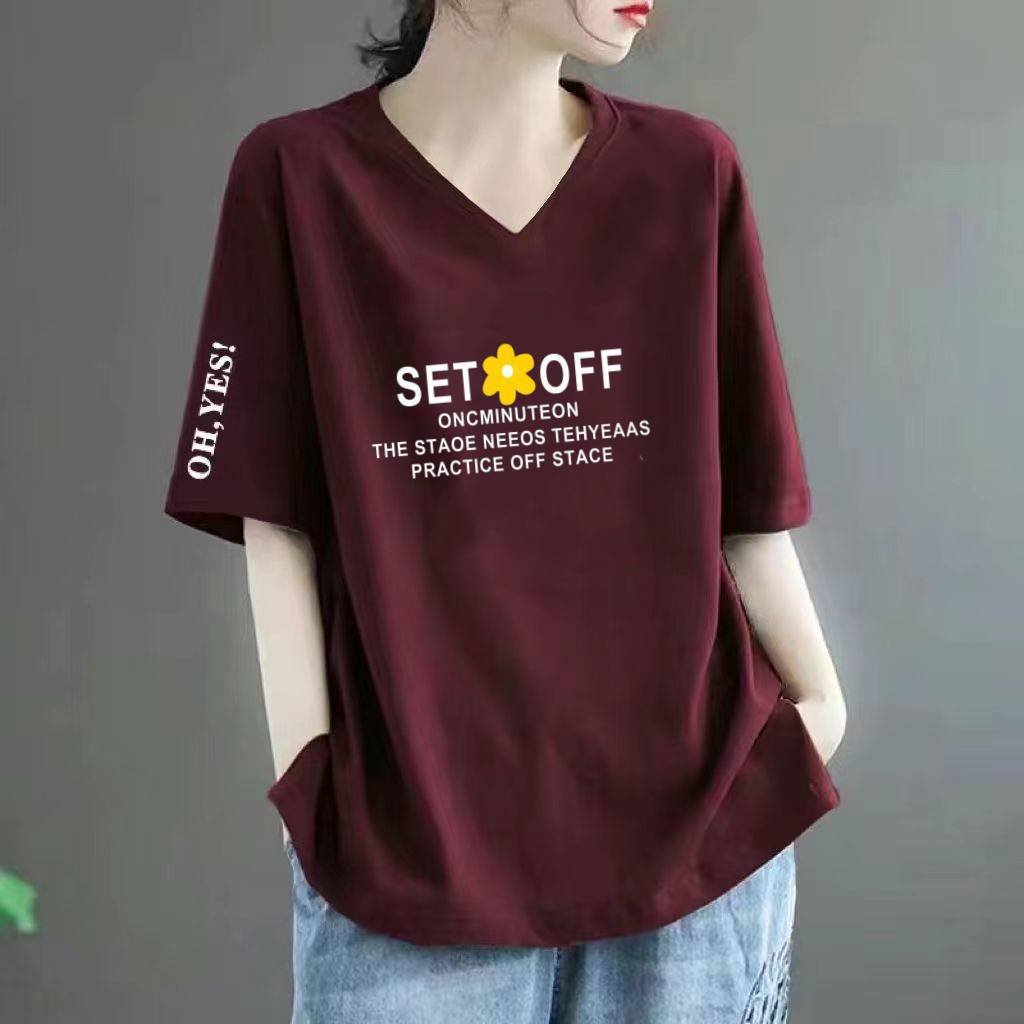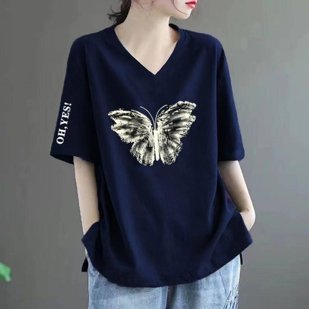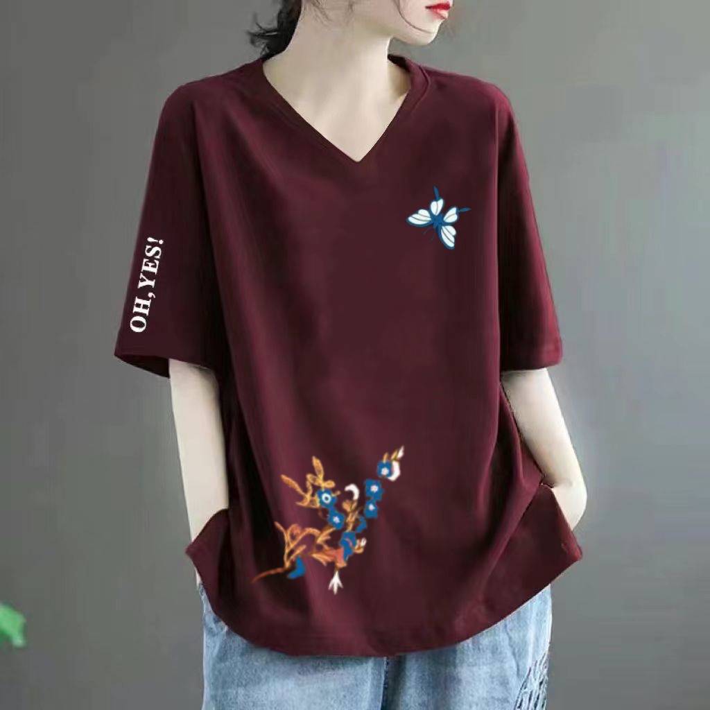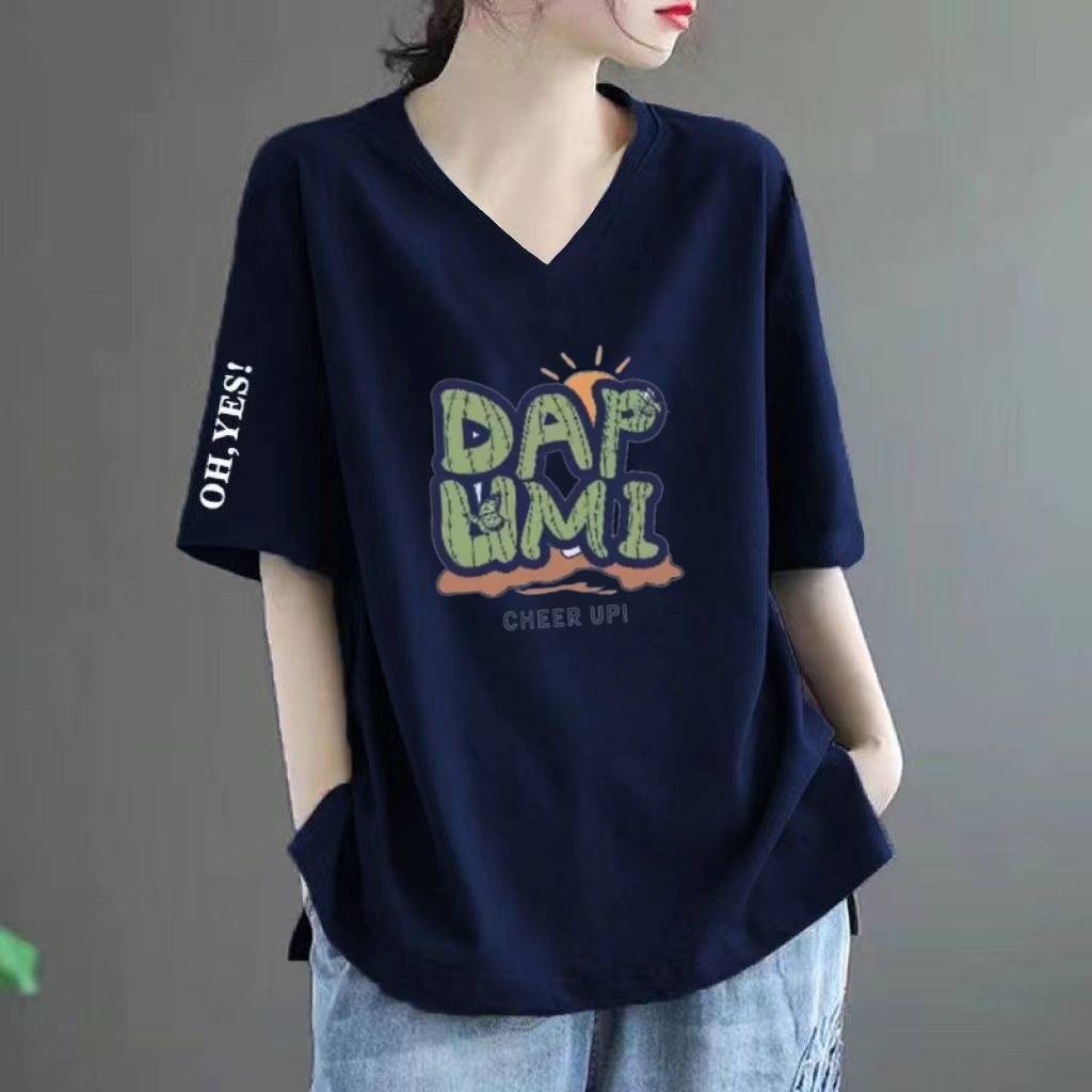 여성용 반팔 티셔츠, 브이넥 여름 신작 루즈한 대형 사이즈 배를 커버하고 슬림해 보이는 패셔너블한 프린트 티셔츠 탑스토어 가기