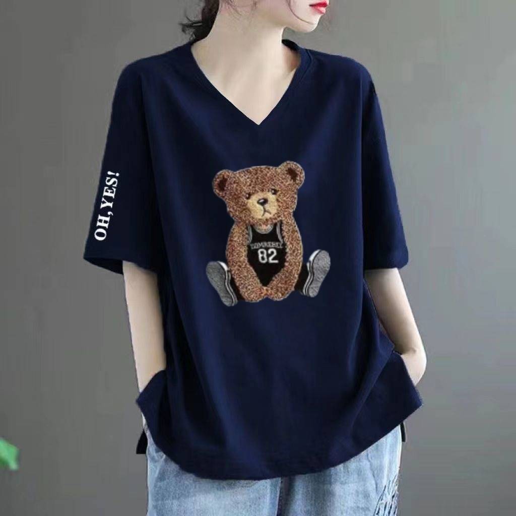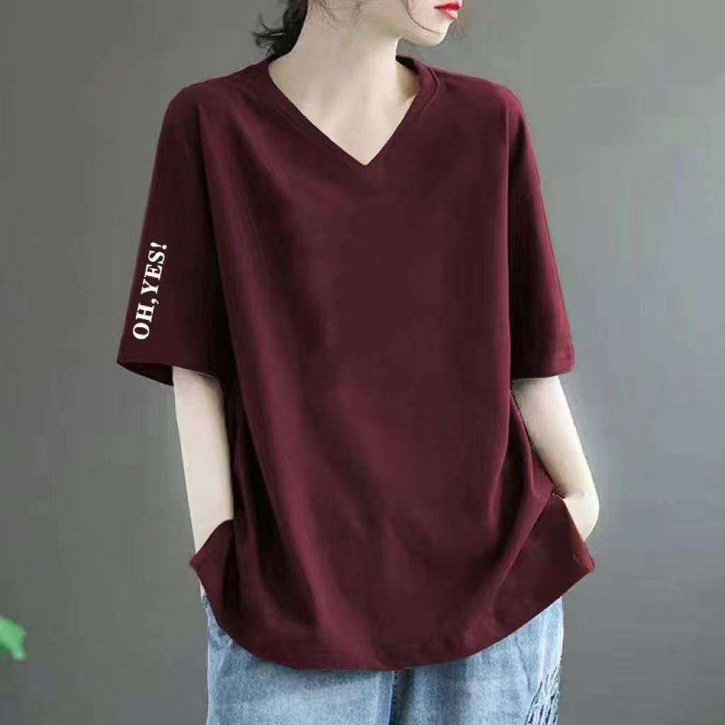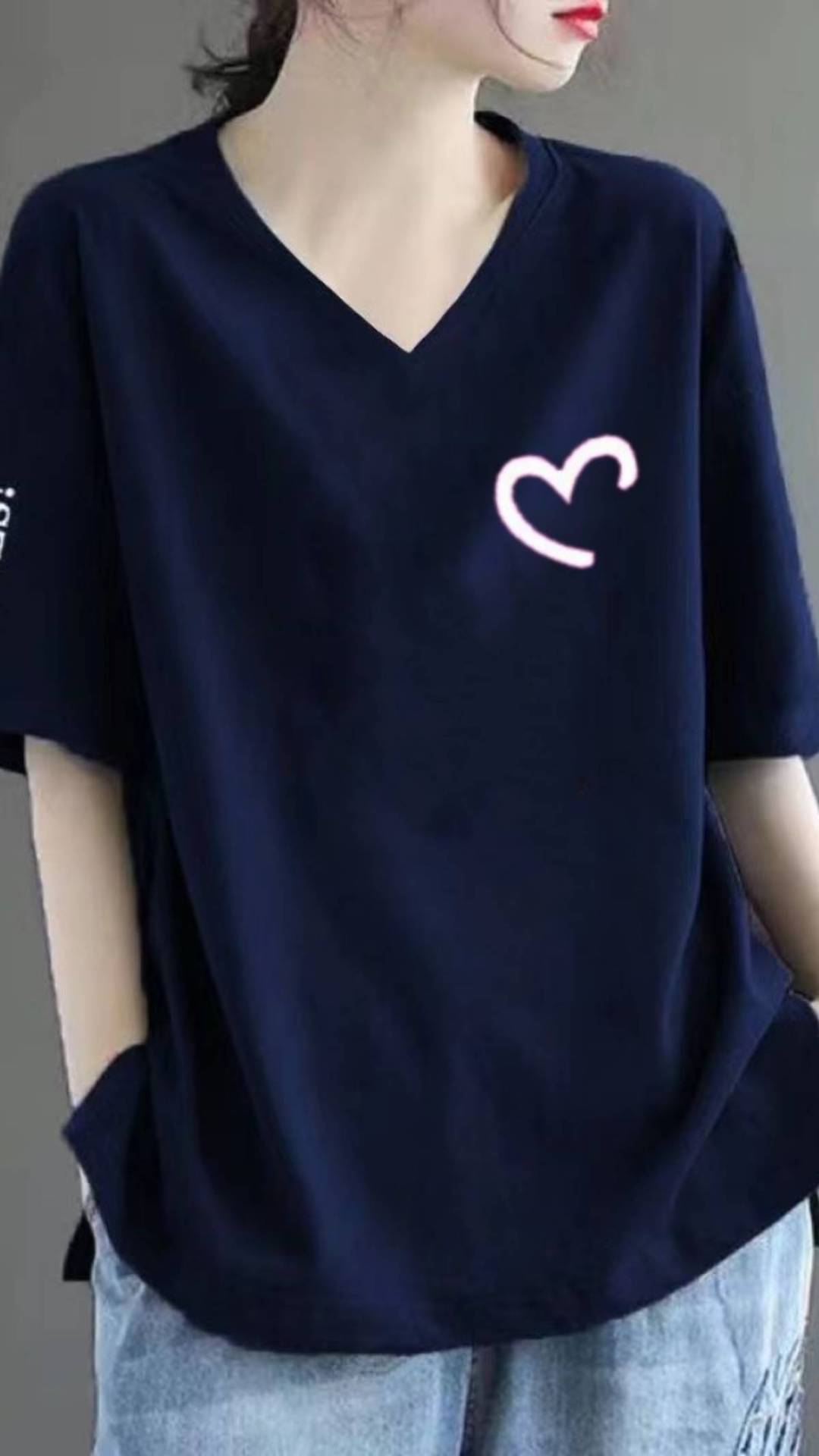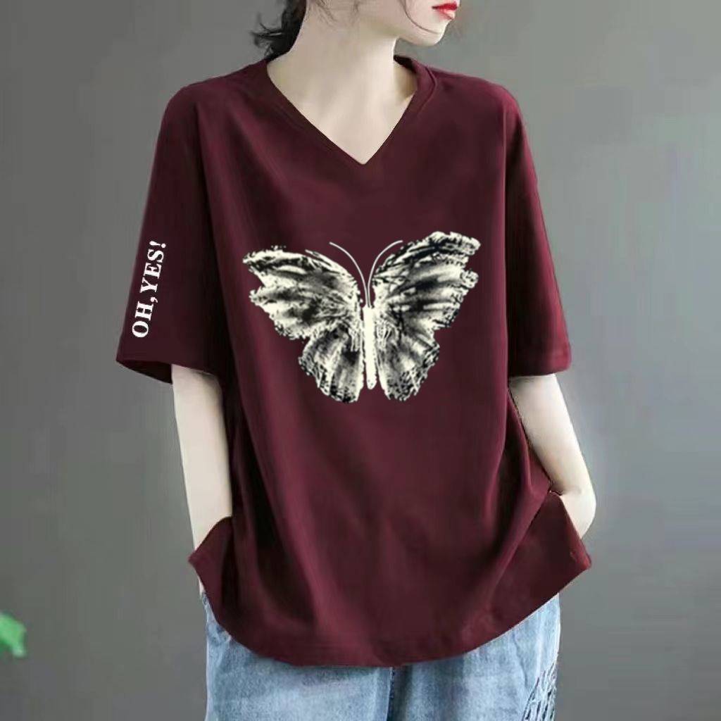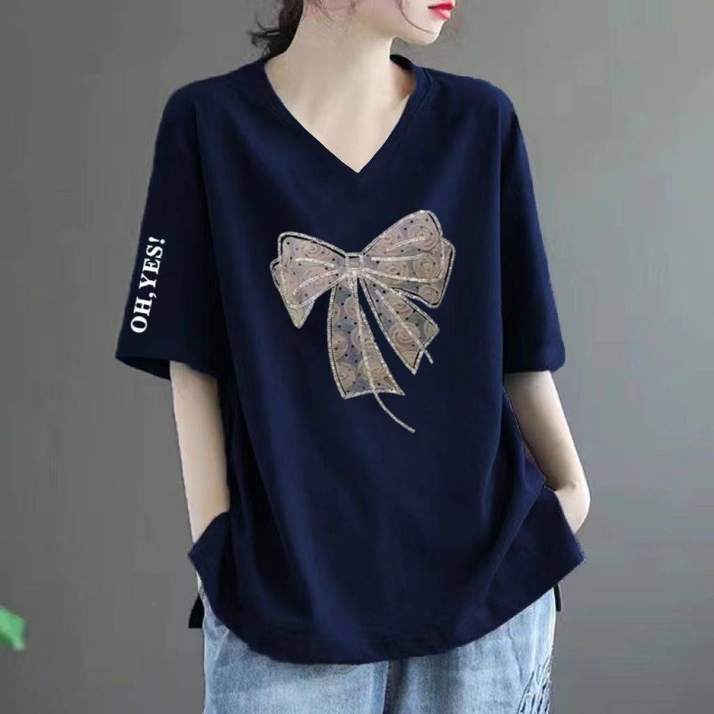 여성용 반팔 티셔츠, 브이넥 여름 신작 루즈한 대형 사이즈 배를 커버하고 슬림해 보이는 패셔너블한 프린트 티셔츠 탑스토어 가기