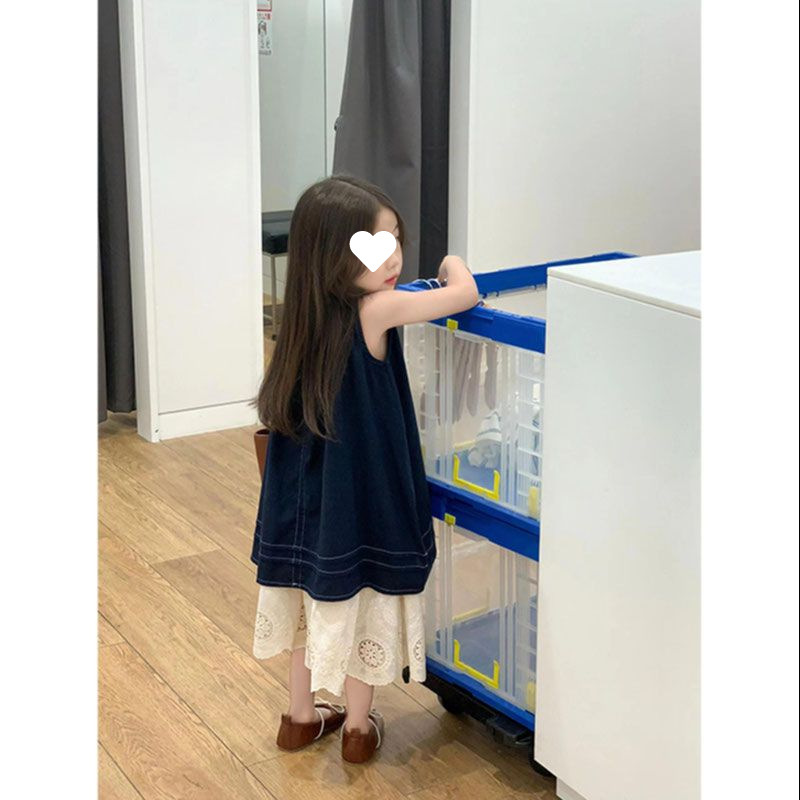 한국 스타일 소녀 여름 유행 원피스 세트 2025 아동복 어린이 서양식 레트로 조끼 스커트 하프 길이 스커트