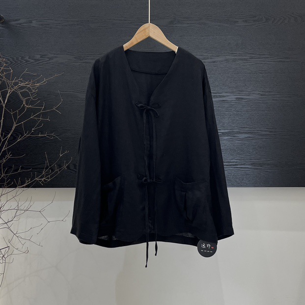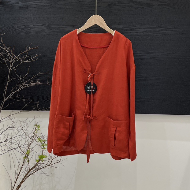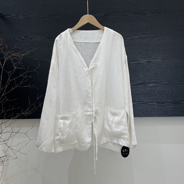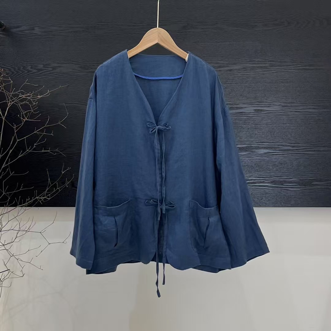 대형 포켓 솔리드 컬러 레이스 업 셔츠 여성의 2025 년 봄과 여름 새로운 예술적 복고풍 느슨한 V 넥 셔츠