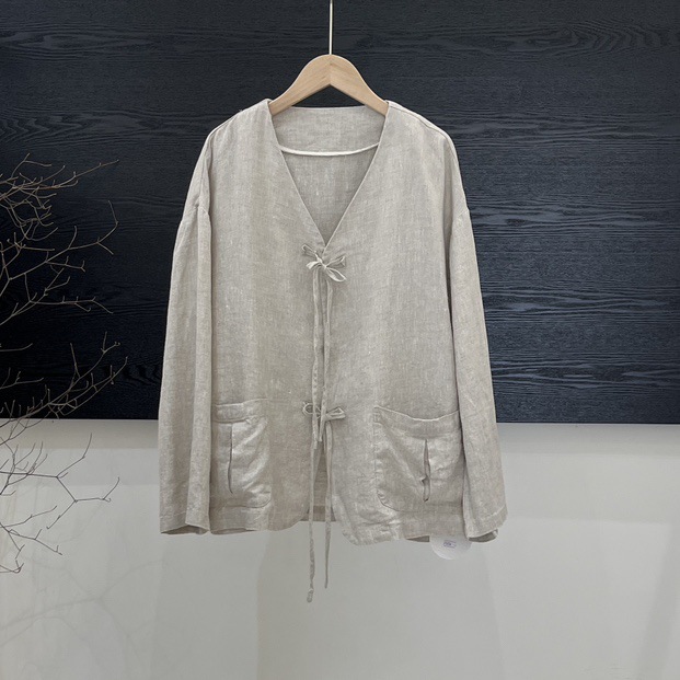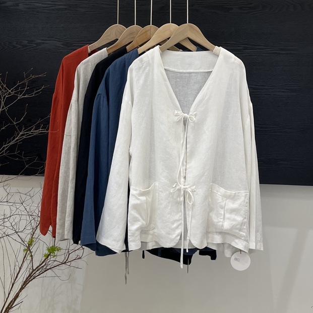 대형 포켓 솔리드 컬러 레이스 업 셔츠 여성의 2025 년 봄과 여름 새로운 예술적 복고풍 느슨한 V 넥 셔츠스토어 가기
