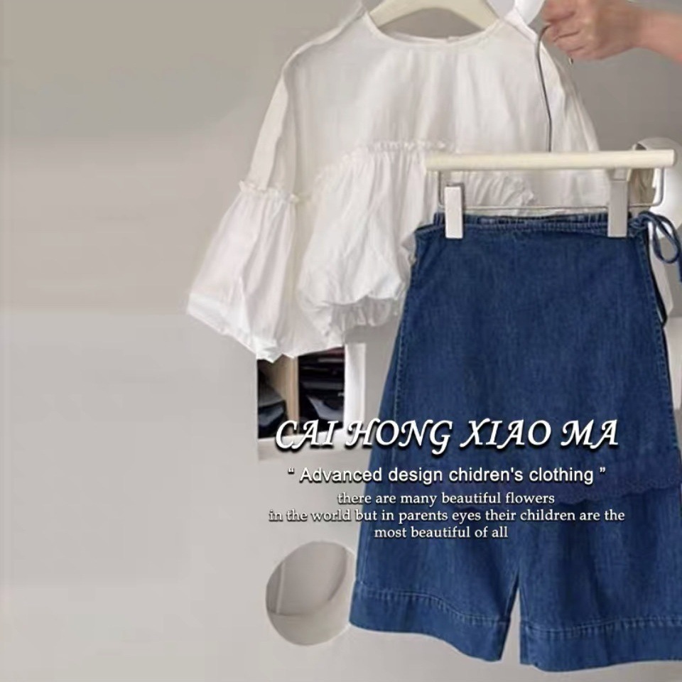 한국 아동복 가을 의류 소녀 세트 유행 디자인 짧은 최고 서양식 레이스 앞치마 어린이 청바지스토어 가기