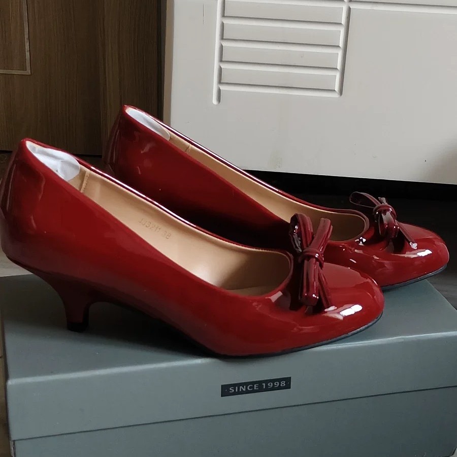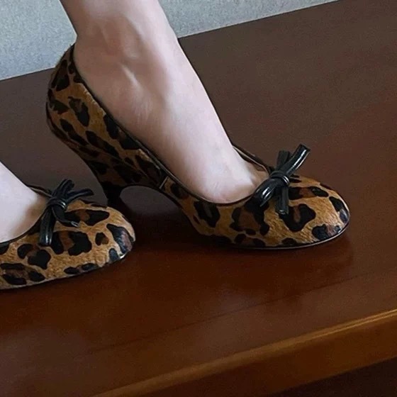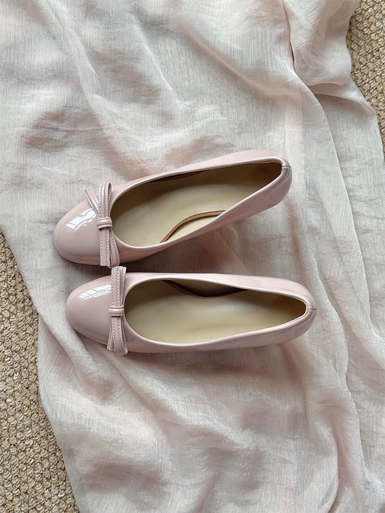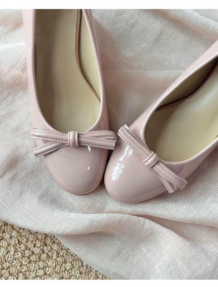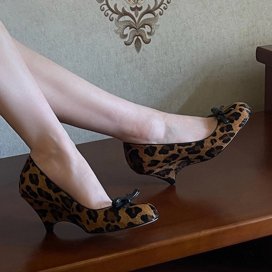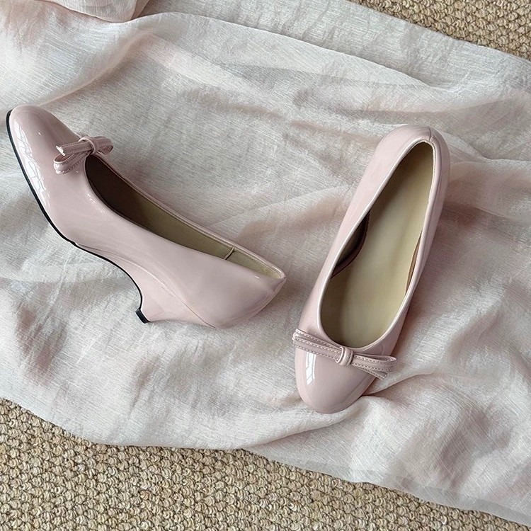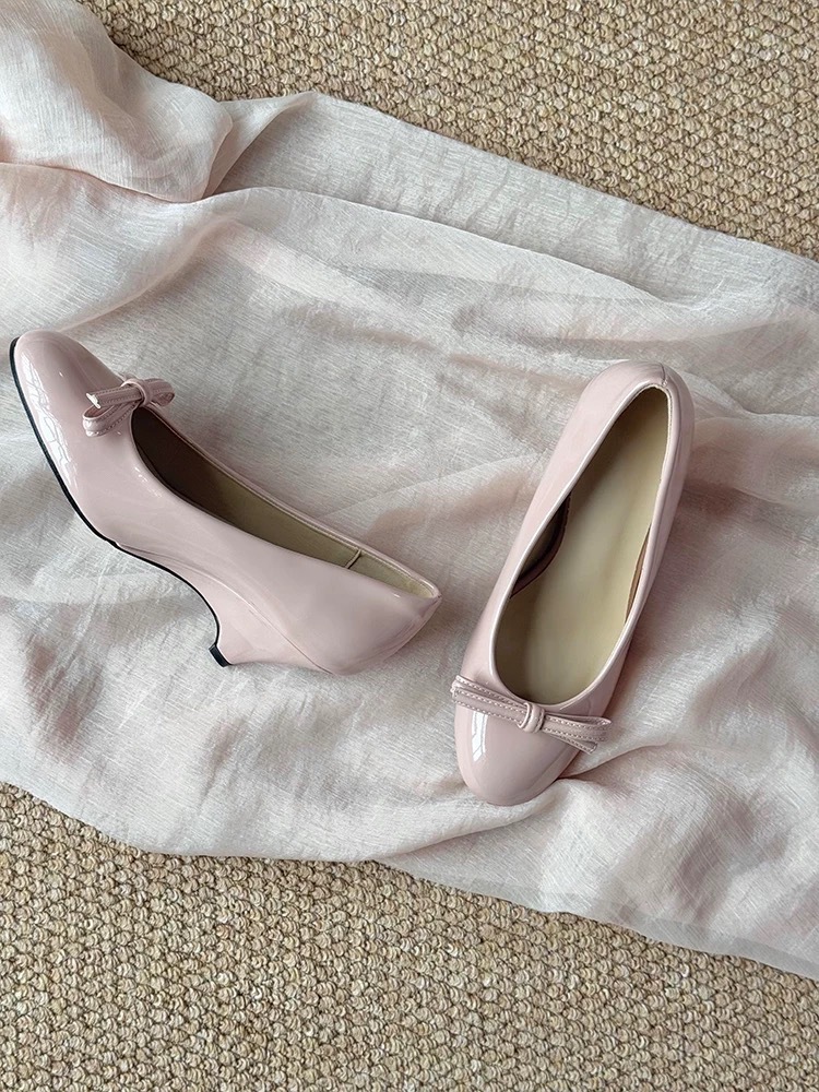 니치 프렌치 스타일 활 라운드 발가락 작은 신발 여성용 쐐기 얕은 입 가죽 신발 여성의 중간 고대 하이힐스토어 가기