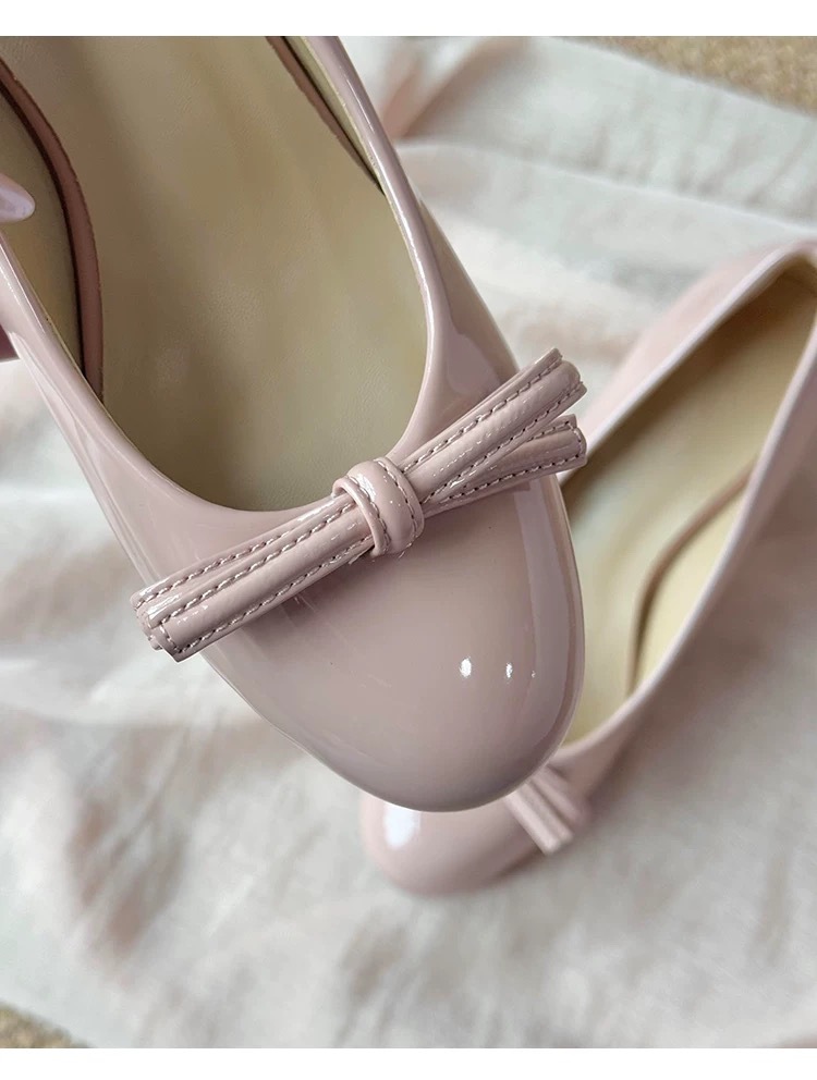 니치 프렌치 스타일 활 라운드 발가락 작은 신발 여성용 쐐기 얕은 입 가죽 신발 여성의 중간 고대 하이힐