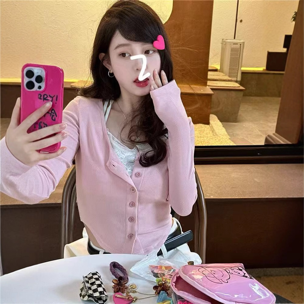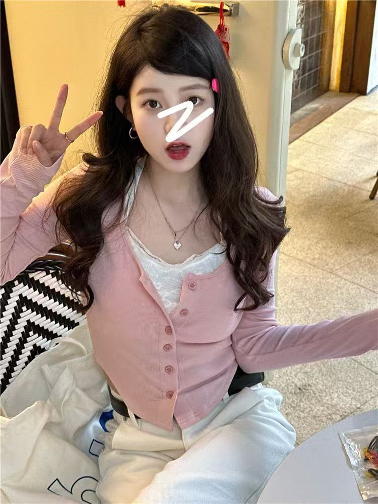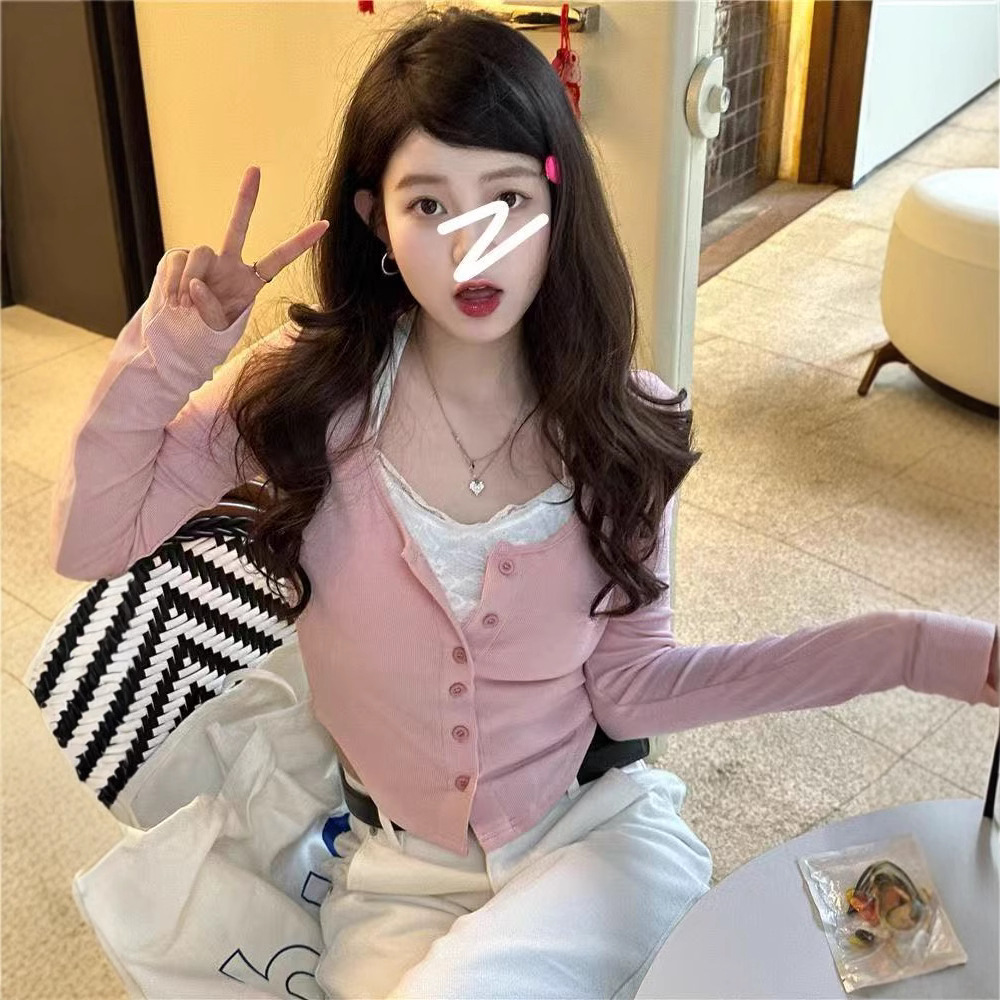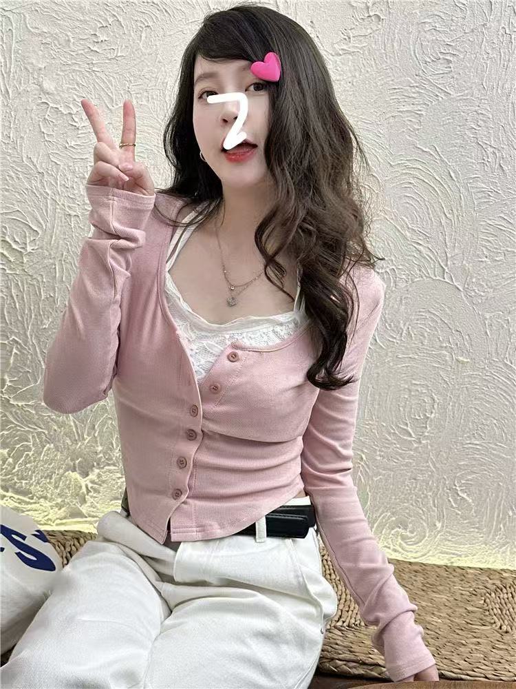 2025 봄과 가을 새로운 슬림 핏 소녀 퓨어 원함 가짜 투피스 스티칭 연령 감소 화이트 긴팔 스웨터 탑스토어 가기