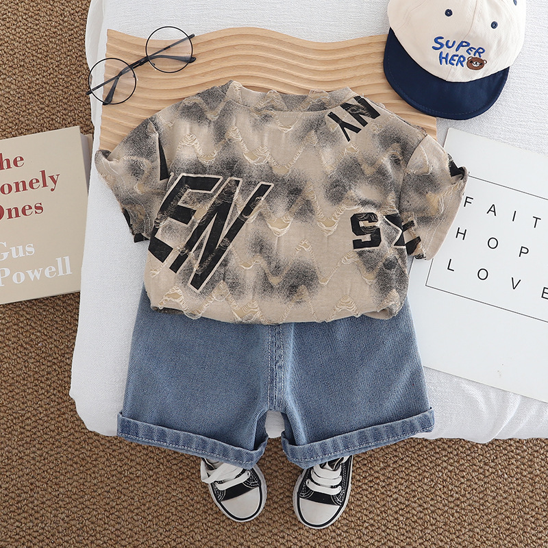 대외 무역 아동복 어린이 여름 착용 소년 전체 인쇄 편지 티셔츠 아기 2025 새로운 유행 남성 반팔 투피스 세트