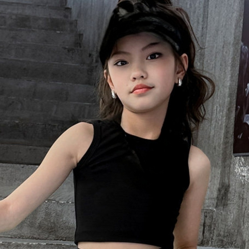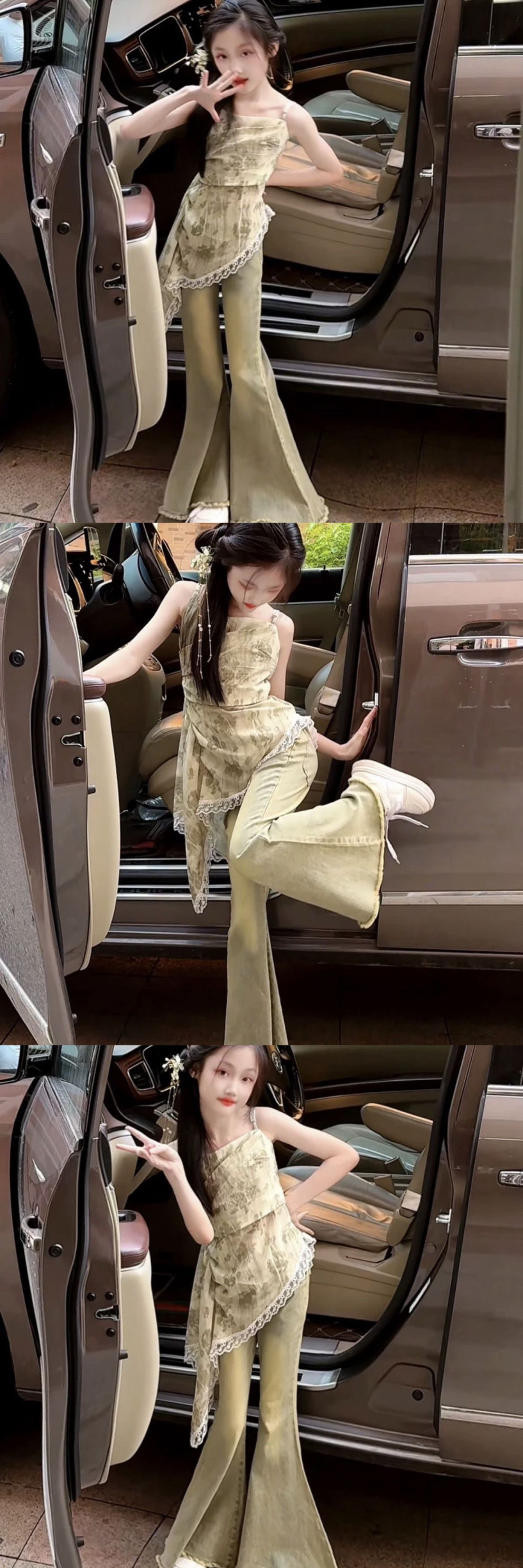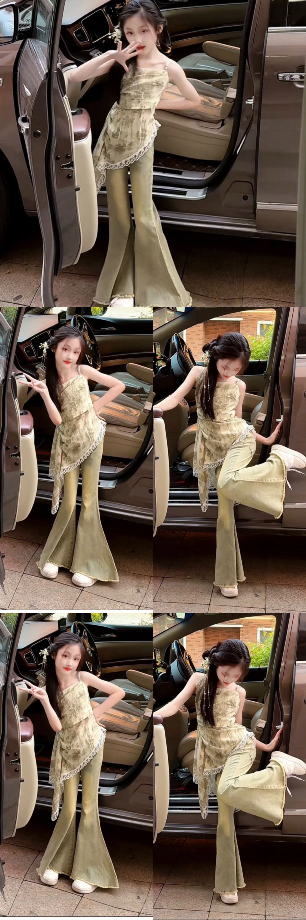 소녀 여름 세트 2025 새로운 도착 슬립 스커트 대형 어린이 세련된 데님 플라 바지 유행 투피스 세트