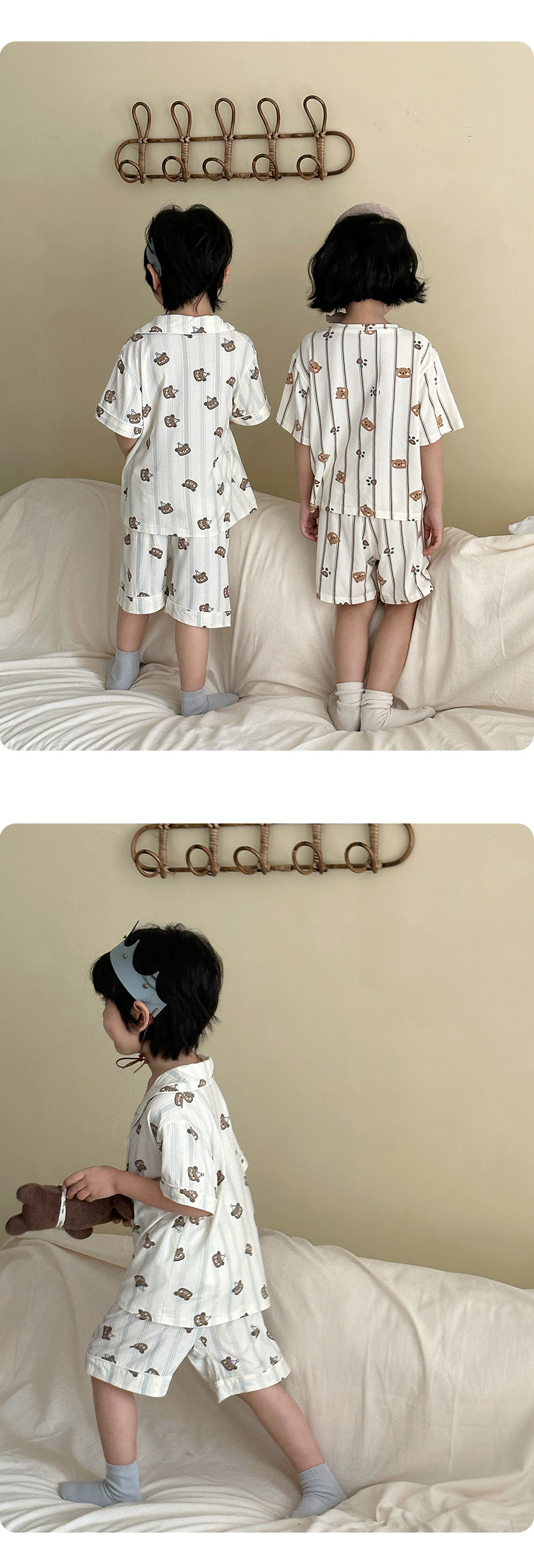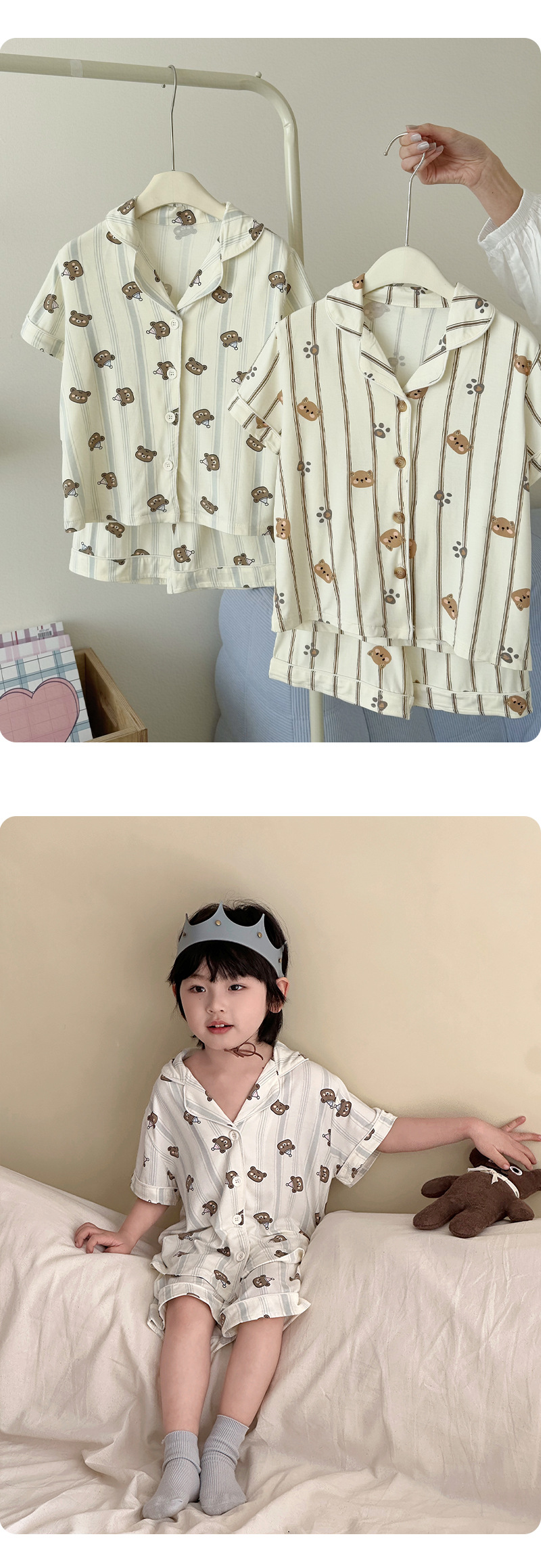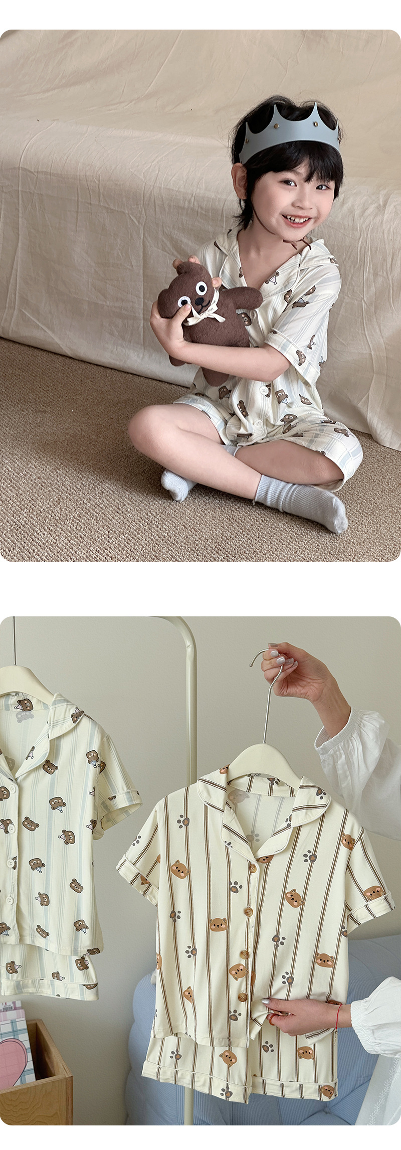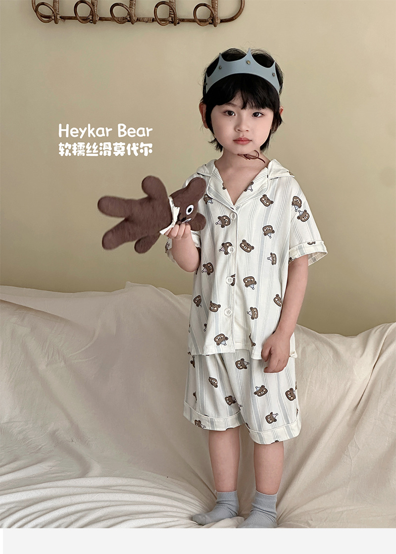 블랙 커피 베어 만화 풀 프린트 베어 모달 클래스 어린이 홈 의류 봄과 여름 2025 새로운 옷깃 카디건 파자마