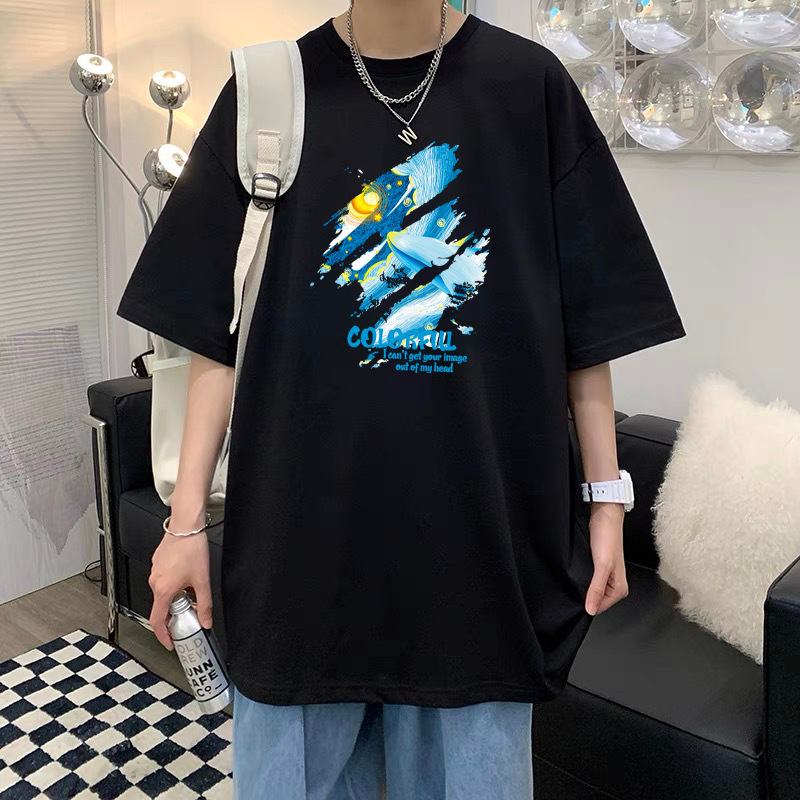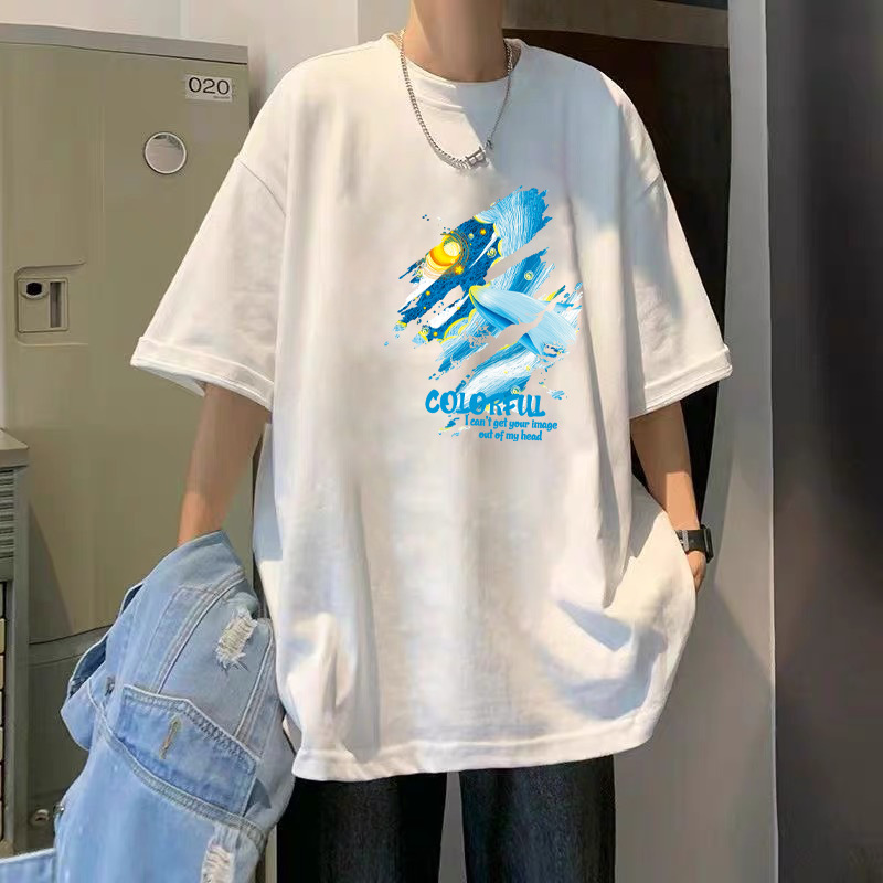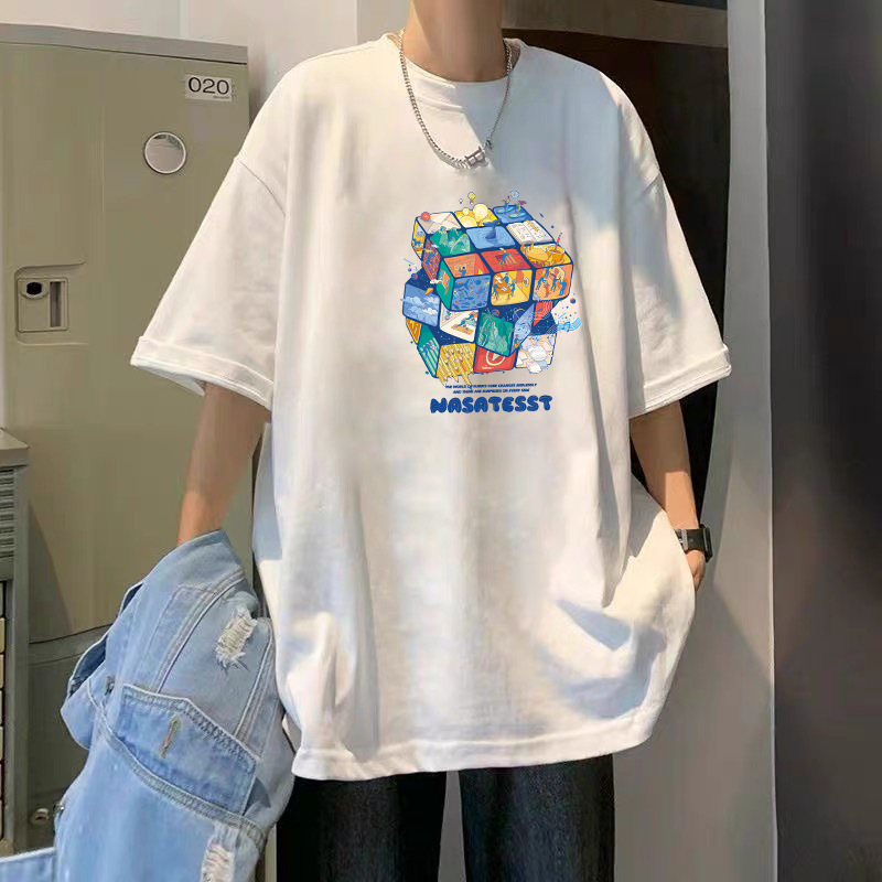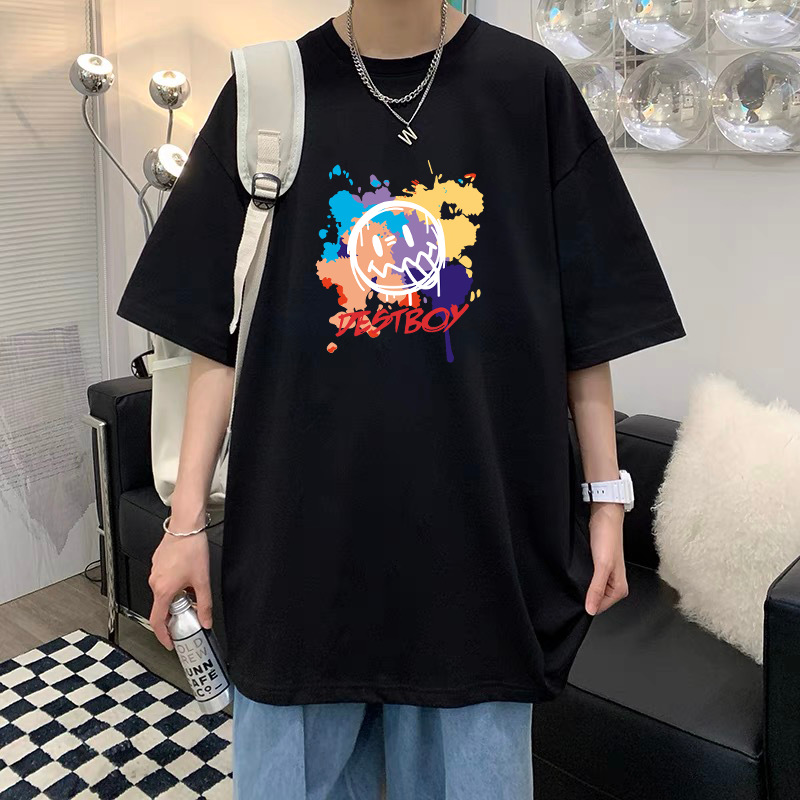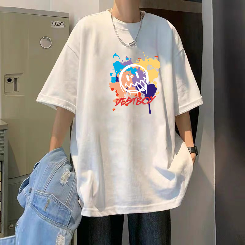 여름 슈퍼 핫인 홍콩 스타일 트렌디 브랜드 퓨어 코튼 프린트 반팔 티셔츠 남성용 라운드 넥 루즈 올 매치 탑 반팔 티셔츠