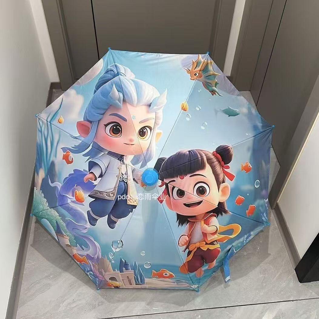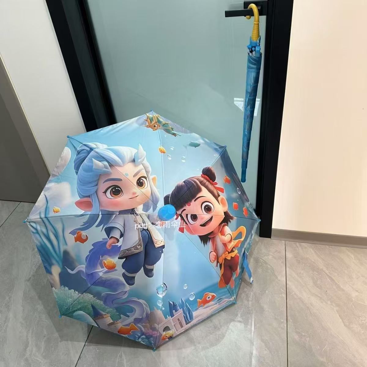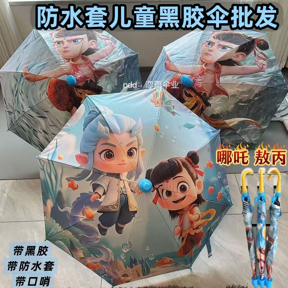 Nezha Ao C 어린이 반자동 검은 색 고무 선 스크린 빛 맑은 우산 방수 커버 남성과 여성 학생 긴 핸들 우산 도매