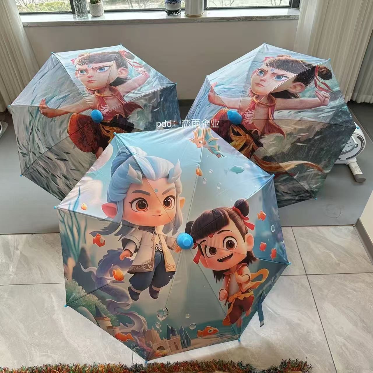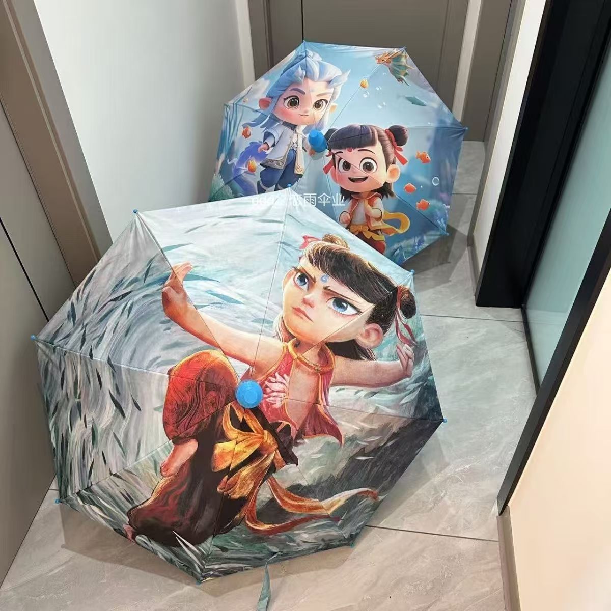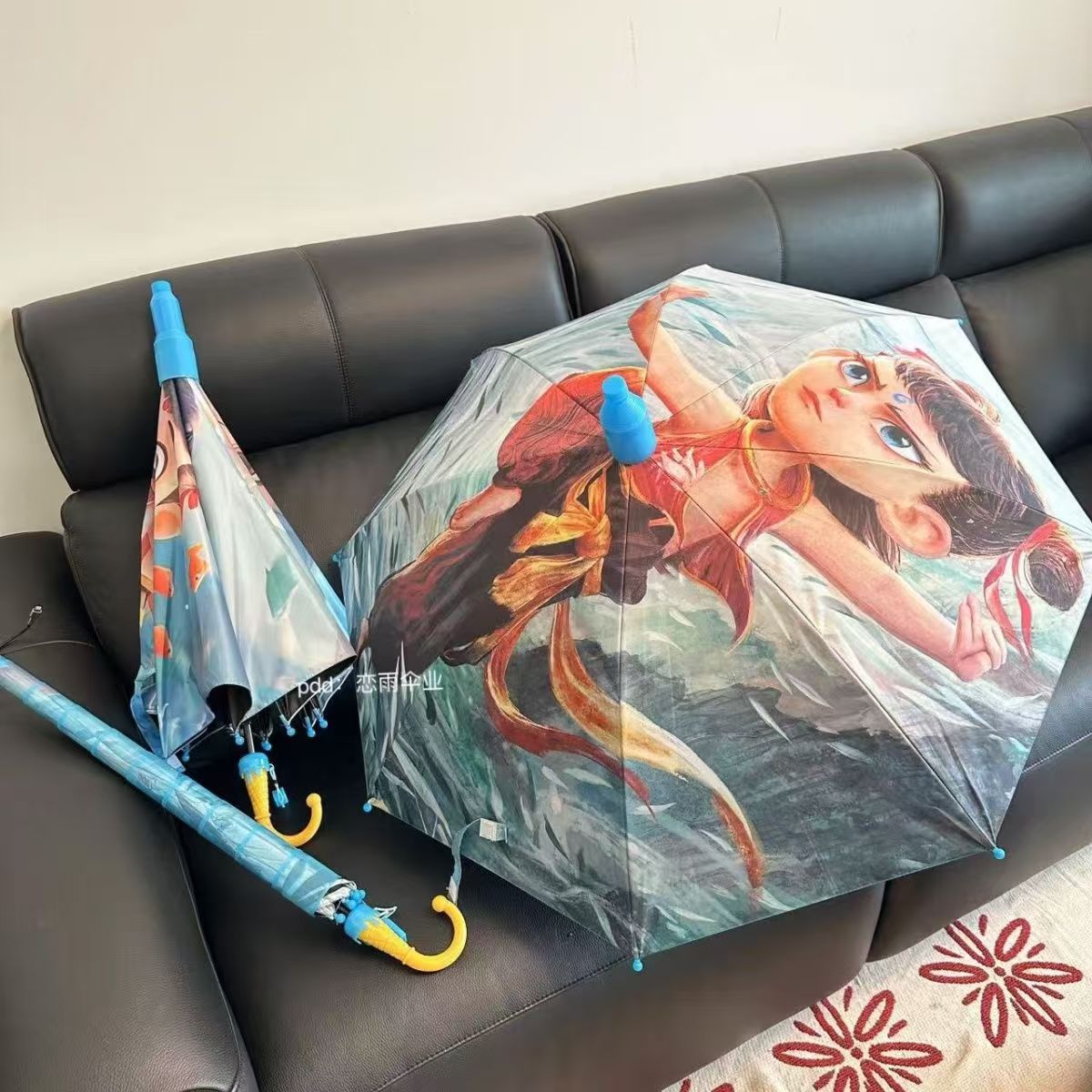 Nezha Ao C 어린이 반자동 검은 색 고무 선 스크린 빛 맑은 우산 방수 커버 남성과 여성 학생 긴 핸들 우산 도매