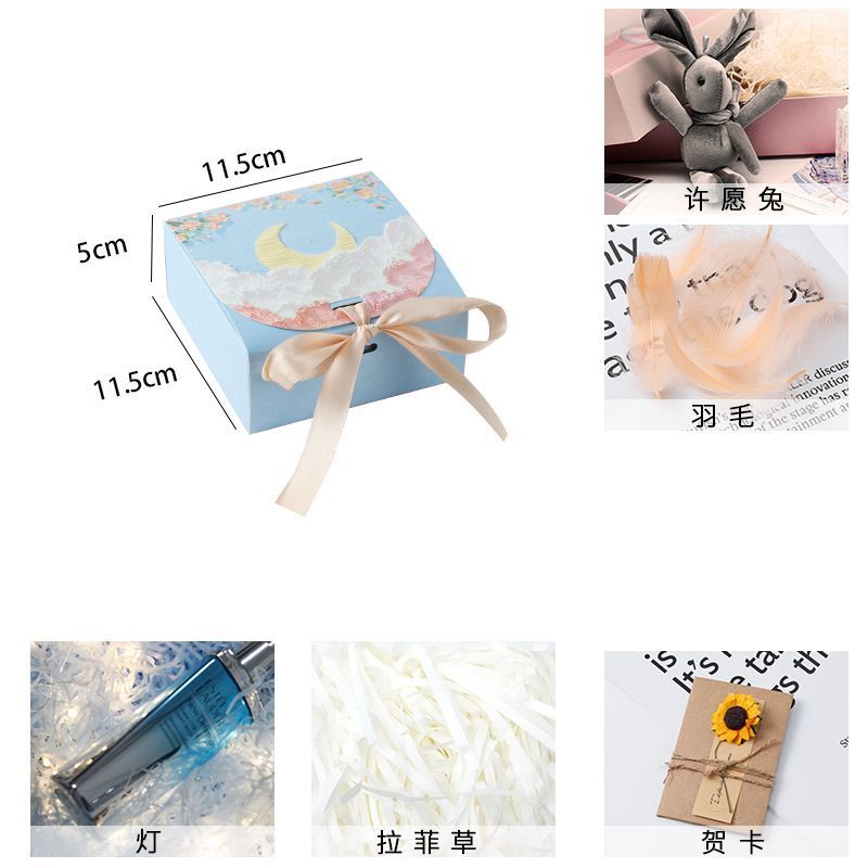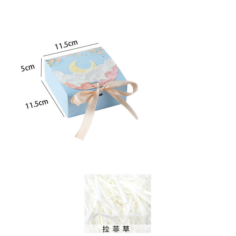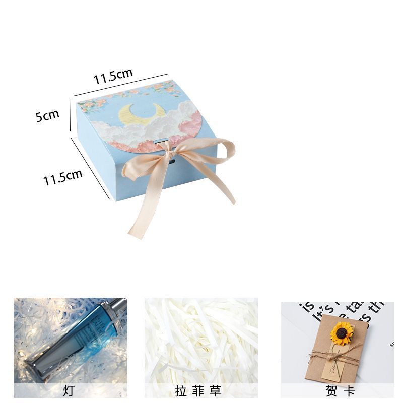 • 하늘색 - 구름 사이의 꽃과 달 + 라피아 + 가벼운 끈 + 인사말 카드