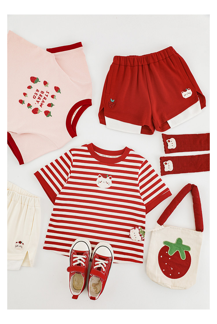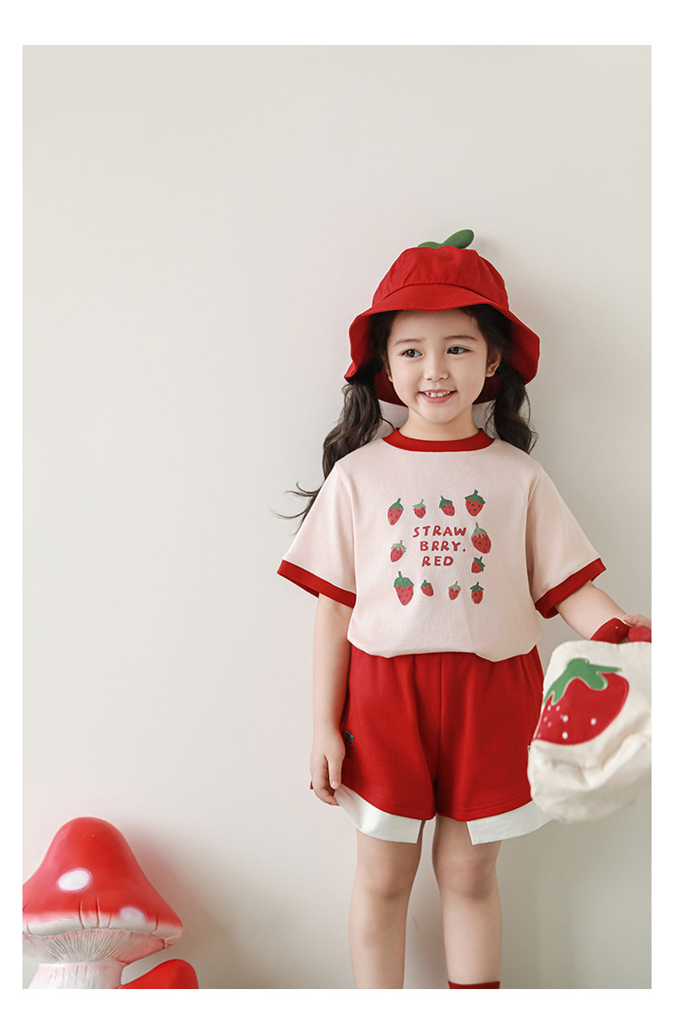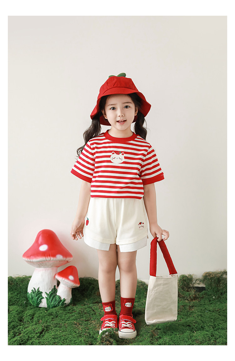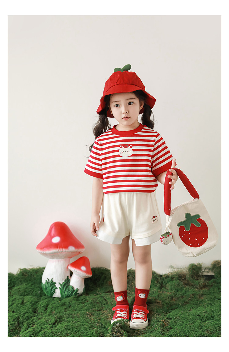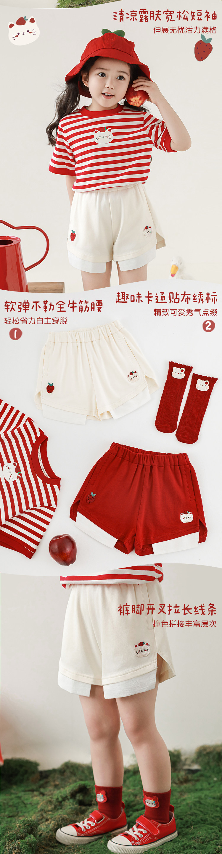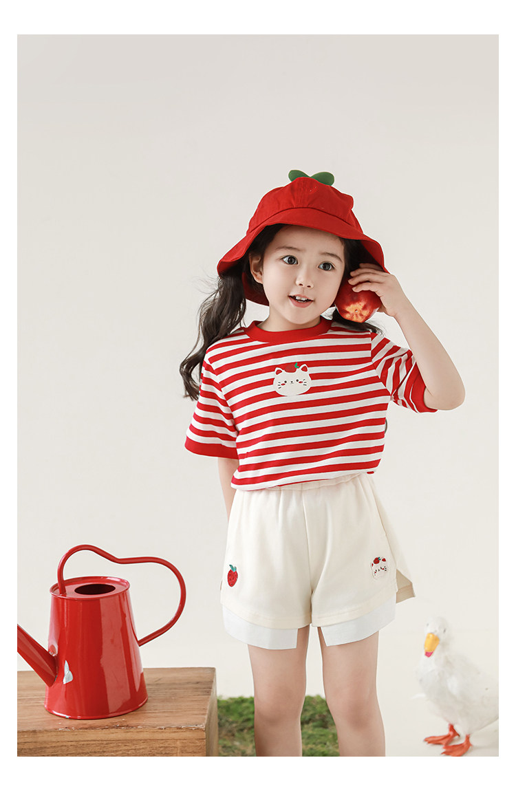 Wuri Boo 소녀 고양이 딸기 시리즈 2025 여름 시원한 느슨한 반팔 티셔츠 자수 반바지 세트
