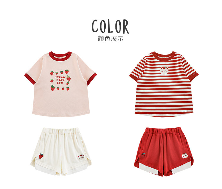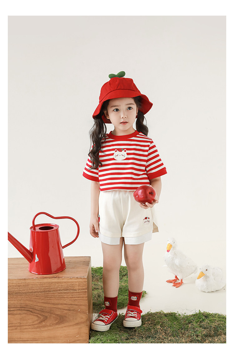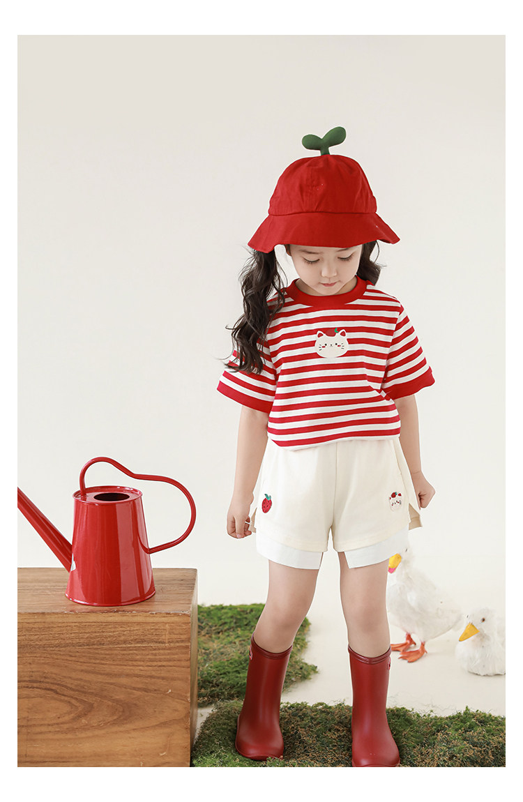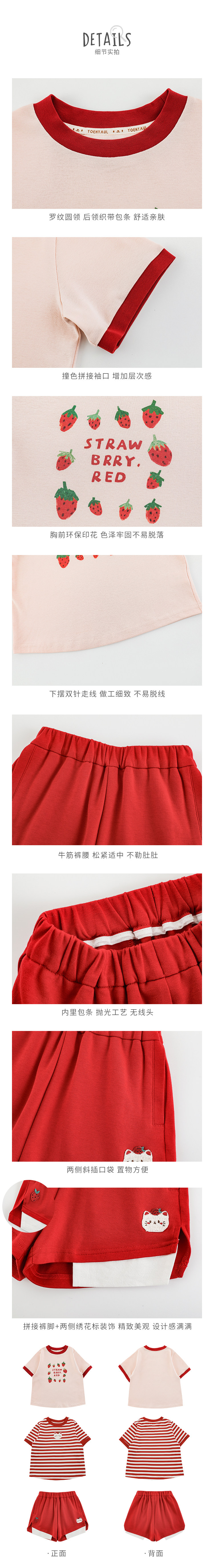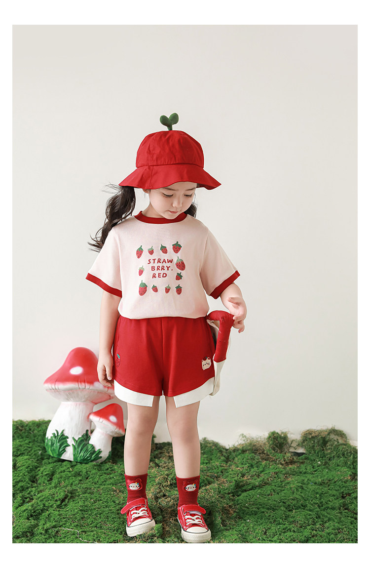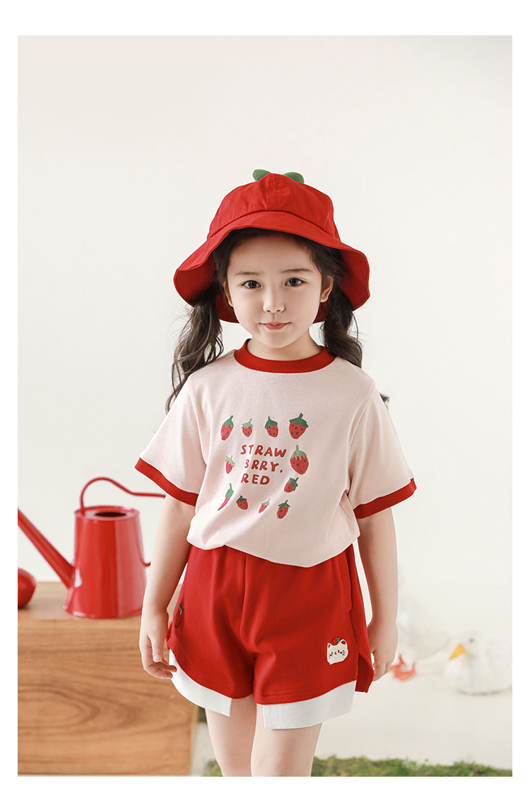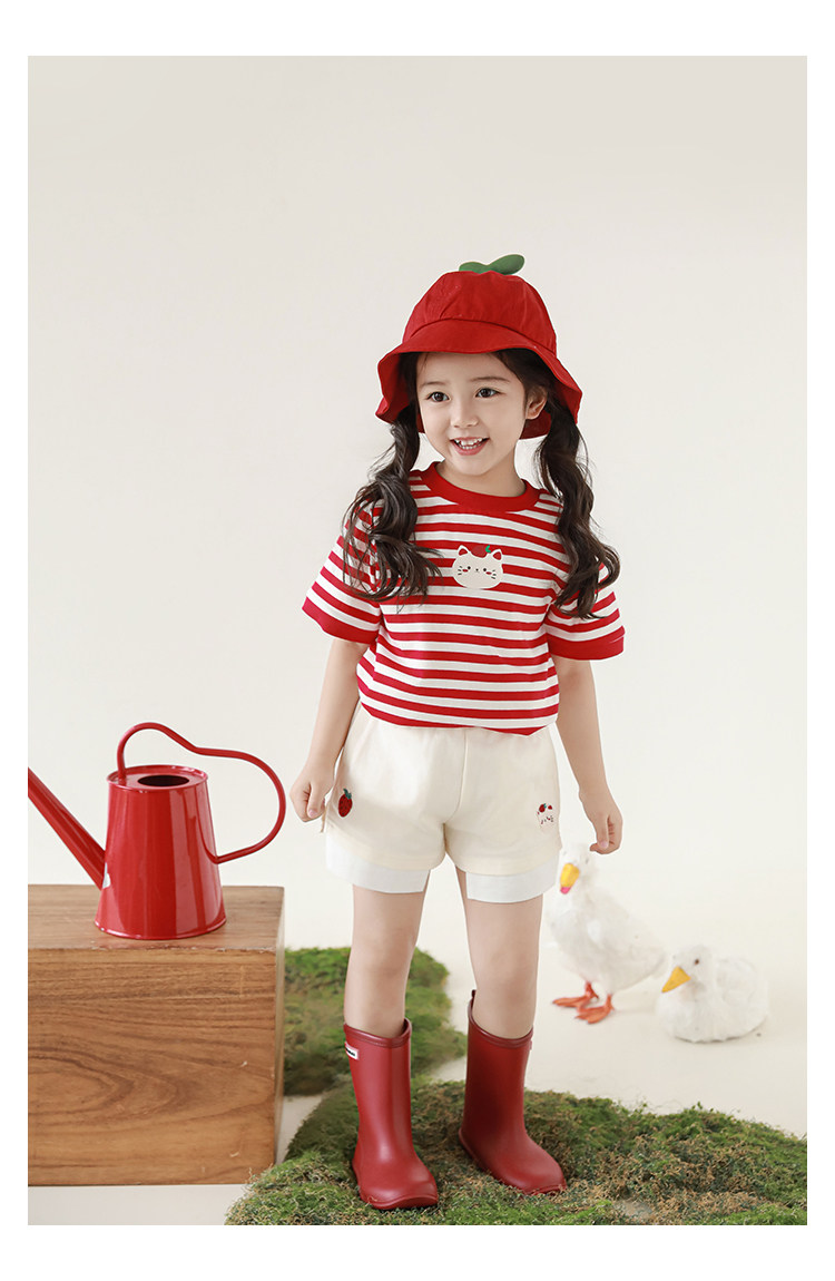 Wuri Boo 소녀 고양이 딸기 시리즈 2025 여름 시원한 느슨한 반팔 티셔츠 자수 반바지 세트